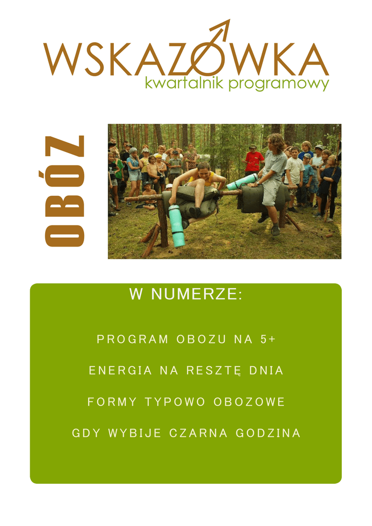 OBÓZ W NUMERZE: PROGRAM OBOZU NA 5+ ENERGIA NA RESZTĘ DNIA FORMY TYPOWO OBOZOWE GDY WYBIJE CZARNA GODZINA OD REDAKCJI... Czy wiecie, dlaczego powstał Kwartalnik Programowy „Wskazówka”? Odpowiedź już teraz! Kwartalnik to zbiór pomysłów, inspiracji i gotowych rozwiązań programowych. Zgodnie z naszą intencją, jest to pomoc dla Was - drużynowych, planujących i realizujących program w swoich jednostkach. Znajdziecie tu artykuły, które natchną Was na nowe tory tworzenia, przypomną o starych, niedocenionych lub mało eksploatowanych propozycjach. Ponadto macie tu także okazję przeczytać o pracy ze wszystkimi metodykami i zainspirować się radami namiestników naszego Hufca. Mam nadzieję, że znajdziecie tu coś dla siebie i „Wskazówka” będzie towarzyszyć Wam, w Waszej nieocenionej pracy! :) Każdy numer kwartalnika charakteryzuje się jednym tematem przewodnim, który jest dostosowany do okresu, w jakim numer jest wydawany oraz do Waszych potrzeb. Na pierwszy rzut oddajemy w Wasze ręce pomysły, na realizację programu podczas obozu. Ta najważniejsza forma w trakcie roku wymaga solidnego i etapowego przygotowania. Co należy wziąć pod uwagę, tworząc plan? Czy zaprawy muszą wyglądać tak samo? Czy jest różnica między obozem a kolonią dla zuchów? A co jeśli zajęcia skończą się za szybko? Zapraszam do lektury słonecznego i pachnącego lasem numeru, gdzie odpowiemy na te i więcej pytań! :) Redaktor naczelny pwd. Artur Grendzicki HO Redaktor naczelny: pwd. Artur Grendzicki HO Zespół redakcyjny: - sam. Patrycja Borkowska, - pwd. Aniela Bożejewicz HO, - sam. Izabela Drojecka, - phm.Anna Kasprowicz HR, - ćw. Szymon Owsiański, - pwd. Marta Paluszyńska HO, - pion. Sandra Pożerska, - pwd. Malwina Siwczak HR, - pwd. Magdalena Wieńska HO Zespół ds. grafiki: - pwd. Marta Paluszyńska HO, - odkr. Mateusz Zedler Korekta: - sam. Aleksandra Lewandowska ... ... SPIS TREŚCI Program obozu na piątkę z plusem s. 4 „Kilku kumpli i patyk, albo dwa...” s. 5 Sport - energia na resztę dnia s. 8 Sprawności s. 10 Sprawności zespołowe s.11 Formy typowo obozowe - czyli bez czego obóz nie może się odbyć? s.12 Gdy wybije czarna godzina - jak zapełnić lukę programową? s.14 Przyrzeczenia na obozie s.16 Obozowe gawędowanie s.18 Recykling s.20 Obozy czy kolonie? s.23 Co? Jak? Dlaczego? Fabuła dla harcerzy s.25 Złoty środek - harcerze starsi na obozie s.27 Wędrownictwo mnie kręci s.29 Zabawa, piosenka numeru s.31 PROGRAM OBOZU NA PIĄTKĘ Z PLUSEM 5+ Wszyscy z nas, instruktorzy, komendanci szczepów, drużynowi pomimo wciąż trwającego nawału obowiązków i zachwycania się wiosną zabrali się już z pewnością do planowania najważniejszego wydarzenia w życiu każdej drużyny – obozu harcerskiego. W czasie zapewniania naszym harcerzom warunków bytowych, atrakcji w trakcie obozu, planowania terminów i odpowiedniego miejsca na ten wyjazd nie zapominajmy o chyba najważniejszej kwestii – obozowego programu, który musi zainteresować naszych harcerzy i zostać przez nich na długo zapamiętany. Jak to zrobić? Oto kilka wskazówek: 1. Zanim zaczniesz tworzyć program obozu, wyznacz cele, czyli to, co chcecie, całą kadrą obozu osiągnąć poprzez pracę z Waszymi harcerzami, to, na czym chcecie się skupić. Pamiętaj, że obóz to okres dwóch tygodni w których przez cały czas macie kontakt ze swoimi harcerzami, więc nie może to być okres ciągłych zabaw i nudzenia się w podobozie który nic za sobą nie niesie. Zadbaj o to, by harcerze mogli podszkolić swoje techniki harcerskie, czy choćby wiedzę w terenie. Nie zapominaj, że jest to czas, w którym możesz obserwować swoich harcerzy. Stawiaj przed nimi wyzwania, obserwuj, jak sobie z nimi radzą, wspólnie podsumujcie miniony rok oraz zaplanujcie kolejny. Niech obóz będzie dla Was pracowitym czasem, ale też pełnym zabawy i wspólnej integracji. 2. Przed rozpoczęciem planowania programu, poznaj grupę, z którą będziesz pracować przez te dwa tygodnie. Jeśli będzie to obóz kilku środowisk, będzie to niemożliwe, ale staraj się chociaż poznać wiek harcerzy, ich zainteresowania, to co lubią i czego nie lubią robić, by móc uniknąć form, które są nieatrakcyjne dla harcerzy na obozie. 3. Teraz czeka Cię najważniejsza decyzja, czyli wybór fabuły obozu, a pomysłów jest tyle, ile podpo- wie Ci wyobraźnia. Wybierając fabułę pamiętaj o tym, do kogo jest ona kierowana (wiadomym jest, że harcerze nie przebiorą się w smerfy) W tym artykule poznasz kilka propozycji obozowej fabuły, pamiętaj jednak, że najlepsze jest to, co wspólnie wybierzesz ze swoją kadrą, bo to przecież z nią będziesz tworzyć i realizować program. PROPOZYCJE | PRZYKŁADY Historia Polski Stworzenie pierwszego dnia wehikułu czasu, który wysyła harcerzy każdego dnia obozu do różnych czasów w historii Polski. Obóz indiański Każdy obozowicz staje się Indianinem. Podobozy mają swoje totemy które zdobywają w nocy, wszystkie zajęcia dostosowane są pod tę tematykę. Pióropusze, zdobywanie piór przez namioty za czystość. Swoje obrzędowe pieśni, nowo powstałe zwyczaje co do ognisk, tworzenie tipi itp. Wielka gra wszystkie zajęcia są odpowiednikiem gier, począwszy od planszowych, przez karciane, skończywszy na komputerowych. Wielka gra planszowa na tablicy informacyjnej, z której zrywamy kolejne dni (kalendarz), każdy uczestnik zbiera punkty na najlepszego obozowicza. 4 Kraina Baśni Każdego dnia znajdujemy się w innej baśni bądź bajce. Śluby u zakochanego kundla, zajęcia sportowe z Asterixem i Obelixem, sporo tu zależy od ludzi tworzących program i ich wyobraźni, ale można też stworzyć z tego naprawdę ciekawy plan. Komendy podobozów jako czarnoksiężnicy, uczestnicy jako czytelnicy książek, jeśli mamy dostęp do TV i DVD to już w ogóle świetnie. Piotruś Pan Docieramy do obozu, otrzymujemy list o porwaniu Piotrusia pana, mus