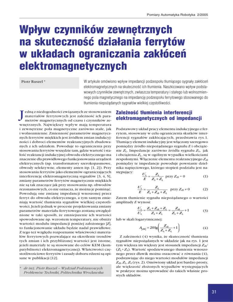 Pomiary Automatyka Robotyka 2/2005 Wpływ czynników zewnętrznych na skuteczność działania ferrytów w układach ograniczania zakłóceń elektromagnetycznych Piotr Ruszel * W artykule omówiono wpływ impedancji podzespołu tłumiącego sygnały zakłóceń elektromagnetycznych na skuteczność ich tłumienia. Naszkicowano wpływ podstawowych czynników zewnętrznych, zwłaszcza temperatury i stałego lub wolnozmiennego pola magnetycznego na impedancję podzespołu ferrytowego stosowanego do tłumienia niepożądanych sygnałów wielkiej częstotliwości. J edną z niedogodności związanych ze stosowaniem materiałów ferrytowych jest zależność ich parametrów magnetycznych od czasu i czynników zewnętrznych. Największy wpływ mają temperatura i zewnętrzne pola magnetyczne zarówno stałe, jak i wolnozmienne. Zmienność parametrów magnetycznych ferrytów miękkich jest źródłem zmian indukcyjności i dobroci elementów reaktancyjnych zbudowanych z ich udziałem. Powoduje to ograniczenia przy stosowaniu ferrytów wszędzie tam, gdzie wartość i stałość reaktancji indukcyjnej obwodu elektrycznego ma znaczenie dla prawidłowego funkcjonowania urządzeń elektrycznych (np. transformatory szerokopasmowe, obwody selektywne, elementy anten itp. [1, 2]). Przy stosowaniu ferrytów jako elementów ograniczających interferencję elektromagnetyczną sygnałów [3, 4, 5], zmiany parametrów ferrytów magnetycznie miękkich nie są tak znaczące jak przy stosowaniu np. obwodów rezonansowych, co nie oznacza, że można je pominąć. Powodują one zmianę impedancji wnoszonej przez ferryt do obwodu elektrycznego, a tym samym zmieniają wartość tłumienia sygnałów wielkiej częstotliwości. Jeżeli jednak w procesie projektowania zmiany parametrów materiału ferrytowego zostaną uwzględnione w taki sposób, że zmniejszenie ich wartości spowodowane np. wzrostem temperatury, nie obniży wartości modułu impedancji poniżej założonego |Z |, to funkcjonowanie układu będzie nadal prawidłowe. Z tego też względu rozpoznanie właściwości materiałów ferrytowych pozwalające na określenie trendów tych zmian i ich przybliżonej wartości jest istotne, jeżeli materiały te są stosowane do celów KEM (kompatybilności elektromagnetycznej). Właściwości częstotliwościowe ferrytów i zasady doboru rdzeni są opisane w publikacji [12]. * dr inż. Piotr Ruszel – Wydział Podstawowych Problemów Techniki, Politechnika Wrocławska Zależność tłumienia interferencji elektromagnetycznych od impedancji Podstawowy układ pracy elementu indukcyjnego z ferrytem, stosowany w celu ograniczenia skutków interferencji sygnałów zakłócających, przedstawia rys. 1. Tłumiący element indukcyjny jest włączony szeregowo pomiędzy źródło niepożądanego sygnału E i obciążenie ZL . Impedancje zarówno źródła sygnału ZS, jak i obciążenia ZL , są w ogólnym wypadku wielkościami zespolonymi. Włączenie elementu reaktancyjnego Zdl pomiędzy te impedancje powoduje powstanie dzielnika napięciowego, którego stopień podziału jest następujący: U L' ZL przy Zdl = 0 (1) = E ZS + Z L U L" ZL przy Zdl ≠ 0 = E ZS + Zdl + ZL (2) Zatem tłumienie sygnału niepożądanego o wartości amplitudy E wynosi: U L' Z + Zdl + ZL Zdl = S = +1 " UL ZS + Z L ZS + Z L (3) lub w skali logarytmicznej: ⎛ Zdl ⎞ A[dB] = 20 lg ⎜ + 1⎟ ⎝ ZS + Z L ⎠ (4) Z zależności (4) wynika, że skuteczność tłumienia sygnałów niepożądanych w układzie jak na rys. 1 jest tym większa im większy jest stosunek impedancji Zdl/ (ZL + ZS). Wartość spodziewanego tłumienia wnoszonego przez dławik można oszacować z równania (4), podstawiając do niego wartości modułów impedancji Zdl, ZL, ZS (rys. 2). Omówiony układ jest bardzo prosty, ale większość złożonych wypadków występujących w praktyce można sprowadzić do takich właśnie prostych układów. 31 Pomiary Automatyka Robotyka 2/2005 Rys. 1. Schemat ideowy układu z załączonym szeregowo elementem indukcyjnym w celu ograniczenia rozprzestrzeniania się drogą przewodzenia sygnałów niepożądanych ze źródła E do obciążenia ZL Rys. 2. Wartość tłumienia A[dB] w układzie jak na rysunku 1 w funkcji |Zdl| / |Zs + ZL| Wpływ temperatury na składowe przenikalności magnetycznej rdzenia ferrytowego Składowe przenikalności, w tym także przenikalności początkowej materiału magnetycznego, są funkcją wielu czynników [6], między innymi jego składu chemicznego oraz struktury krystalicznej. Dominującą rolę odgrywa zawartość cynku oraz domieszek dodatkowych, zwłaszcza kobaltu. Wzrost ilości cynku w spieku powoduje wzrost przenikalności magnetycznej, ale jednocześnie ulegają zmniejszeniu: temperatura punktu Curie, górna częstotliwość graniczna pracy materiału magnetycznego oraz zakres liniowej zależności przenikalności magnetycznej od natężenia pola magnetycznego. Do celów EMI częściej stosuje się ferryty niklowo-cynkowe z niewielkim dodatkiem kobaltu. Są to tak zwane ferryty perminwarowe. Ich przenikalność magnetyczna jest mniejsza niż ferrytów manganowoniklowych ( i max<300), ale zakres pracy sięga częstotliwości kilkuset MHz. Wartości składowych ’ oraz ” przenikalności [12] są zależne od ilości domieszko- 32 Rys. 3. Wpływ domieszki kobaltu na właściwości magnetyczne materiału ferrytowego. Materiały A i A’ mają podobne wartości przenikalności względnych m i (f=1 MHz)»30 i m”(f=1 MHz)»0,015 [7] (A – materiał bez dodatku kobaltu, A’ – materiał z dodatkiem kobaltu) Rys. 4. Przykład zmian składowej rzeczywistej m’ i urojonej m” przenikalności magnetycznej zespolonej m materiału ferrytowego, w funkcji temperatury, w zakresie częstotliwości leżących znacznie poniżej częstotliwości rezonansu struktury materiału rdzenia i przy zewnętrznym polu magnetycznym H = 0 A/m [7, 10] wanego kobaltu [7] (rys. 3) i technologii wykonania. Składowa uroj