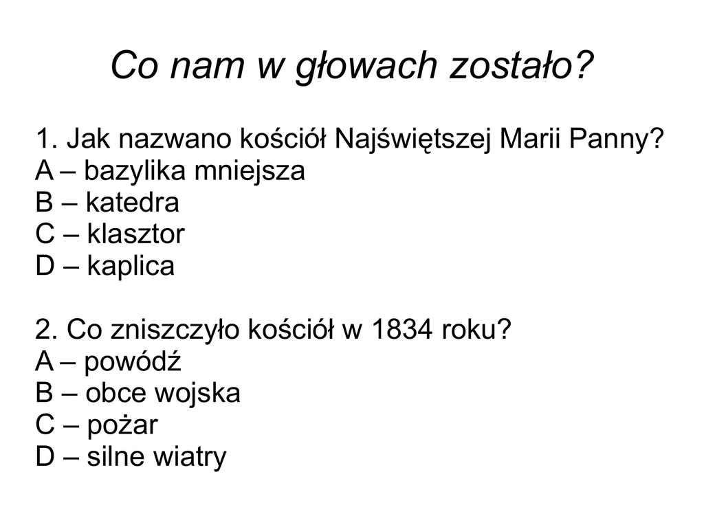 Co nam w głowach zostało? 1. Jak nazwano kościół Najświętszej Marii Panny? A – bazylika mniejsza B – katedra C – klasztor D – kaplica 2. Co zniszczyło kościół w 1834 roku? A – powódź B – obce wojska C – pożar D – silne wiatry 3. Kiedy otwarto ostatecznie tężnie? A – 2001r. B – 1900r. C – 2010r. 4. Co spływa po gałązkach tarniny? A – nic B – zwykła woda C – błoto D – solanka 5. W którym roku zbudowano kościół Świętego Krzyża? A – 1863r. B – 1999r. C – 2000r. 6. Jaki jest tytuł zabytkowego obrazu Grottgera w kościele Świętego Krzyża? A – „Dama z łasiczką” B – „Madonna” C – „Chrystus Ukrzyżowany” 7. Kto gościł w hotelu Bast? A – generał Władysław Sikorski B – Mikołaj Kopernik C – Pola i Oskar 8. Co Niemcy utworzyli podczas II wojny w miejscu wieży hotelu? A – punkt obserwacyjny B – niczego tam nie zrobili C – stanowisko artylerii przeciwlotniczej D – więzienie 9. Z czego zrobiony jest pomnik generała Świerczewskiego? A – siarka B – brąz C – miedź D – złoto 10. Gdzie mieszkał generał Sikorski? A – Tupadły B – Balczewo C – Parchań D – Orłowo 11. Ile jest żaczków w Inowrocławiu? A – 25 B–5 C–1 12. W co dodatkowo wyposażono żaczki? A – książka, flet, sakiewka B – korona, sakiewka, gitara C – flet, laska, globus 13. Gdzie w Inowrocławiu znajduje się makieta Klasztoru Franciszkanów? A – muzeum B – Plac Klasztorny C – Solanki 14. Z czego wykonano makietę? A – ołów B – brąz C – żelazo 15. Gdzie w Inowrocławiu stoi zabytkowy wagon tramwajowy? A – muzeum B – ul. Świętego Ducha C – Solanki D – ul. Mikołaja Kopernika 16. Kiedy ten wagon został postawiony? A – z 8 na 9 listopada 2010r. B – 1 stycznia 2001r. C – nigdy
