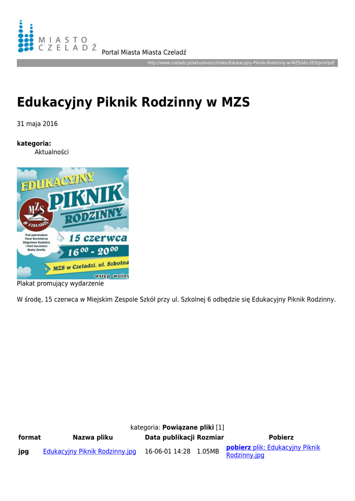 Portal Miasta Miasta Czeladź http://www.czeladz.pl/aktualnosci/index/Edukacyjny-Piknik-Rodzinny-w-MZS/idn:203/printpdf Edukacyjny Piknik Rodzinny w MZS 31 maja 2016 kategoria: Aktualności Plakat promujący wydarzenie W środę, 15 czerwca w Miejskim Zespole Szkół przy ul. Szkolnej 6 odbędzie się Edukacyjny Piknik Rodzinny. format jpg Nazwa pliku kategoria: Powiązane pliki [1] Data publikacji Rozmiar Edukacyjny Piknik Rodzinny.jpg 16-06-01 14:28 1.05MB Pobierz pobierz plik: Edukacyjny Piknik Rodzinny.jpg