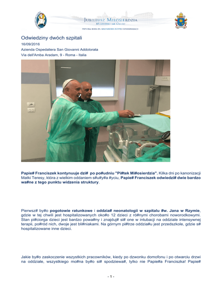 Odwiedziny dwóch szpitali 16/09/2016 Azienda Ospedaliera San Giovanni Addolorata Via dell'Amba Aradam, 9 - Roma - Italia Papie# Franciszek kontynuuje dzi# po po#udniu "Pi#tek Mi#osierdzia". Kilka dni po kanonizacji Matki Teresy, która z wielkim oddaniem s#u#y#a #yciu, Papie# Franciszek odwiedzi# dwie bardzo wa#ne z tego punktu widzenia struktury. Pierwsz# by#o pogotowie ratunkowe i oddzia# neonatologii w szpitalu #w. Jana w Rzymie, gdzie w tej chwili jest hospitalizowanych oko#o 12 dzieci z ró#nymi chorobami noworodkowymi. Stan pi#ciorga dzieci jest bardzo powa#ny i znajduj# si# one w intubacji na oddziale intensywnej terapii, po#ród nich, dwoje jest bli#niakami. Na górnym pi#trze oddzia#u jest przedszkole, gdzie s# hospitalizowane inne dzieci. Jakie by#o zaskoczenie wszystkich pracowników, kiedy po dzwonku domofonu i po otwarciu drzwi na oddziale, wszystkiego mo#na by#o si# spodziewa#, tylko nie Papie#a Franciszka! Papie# -1- wchodz#c na oddzia# musia# na#o#y# mask# i zastosowa# wszystkie #rodki higieny, ze wzgl#du na pomieszczenia aseptyczne. Papie# zatrzyma# si# przy ka#dym inkubatorze i powita# obecnych rodziców, pocieszaj#c ich i dodaj#c im odwagi. Ojciec #wi#ty, wkrótce po opuszczeniu szpitala #w. Jana w Rzymie odwiedzi# hospicjum "Villa Speranza", gdzie jest hospitalizowanych 30 pacjentów w fazie ko#cowej. Struktura nale#y do Fundacji Gemelli Katolickiego Uniwersytetu Naj#wi#tszego Serca. Nikt nie spodziewa# si# zobaczy# Papie#a Franciszka, po jego przybyciu odpowiedzialni powitali papie#a, który chcia# przywita# si# z ka#dym pacjentem w jego pokoju. Wielkie zaskoczenie ze strony wszystkich, pacjentów i krewnych, którzy prze#yli chwile intensywnych emocji pomi#dzy #zami i u#miechami rado#ci. Papie# chcia# mocno podkre#li# znaczenia #ycia, od jego pierwszej chwili, a# do jego naturalnego ko#ca.Przyj#cie #ycia oraz gwarancja jego godno#ci we wszystkich okresach rozwoju jest lekcj# wielokrotnie powtarzan# przez Papie#a Franciszka, który z okazji tej podwójnej wizyty naznaczy# konkretn# i namacaln# piecz#ci#, jak fundamentalne jest dla #ycia mi#osierdzie, dostrzeganie sytuacji najs#abszych i niepewnych. -2-