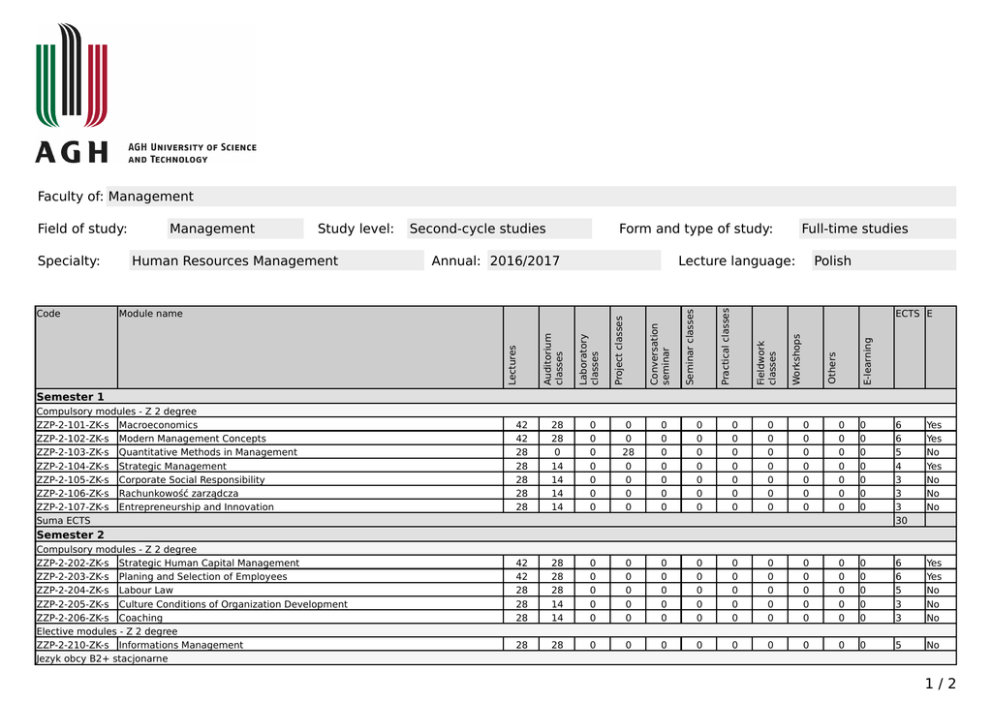 Faculty of: Management Form and type of study: Full-time studies Polish E-learning Others Workshops ECTS E Fieldwork classes Laboratory classes Module name Practical classes Lecture language: Seminar classes Annual: 2016/2017 Conversation seminar Human Resources Management Second-cycle studies Lectures Code Study level: Auditorium classes Specialty: Management Project classes Field of study: Semester 1 Compulsory modules - Z 2 degree ZZP-2-101-ZK-s Macroeconomics ZZP-2-102-ZK-s Modern Management Concepts ZZP-2-103-ZK-s Quantitative Methods in Management ZZP-2-104-ZK-s Strategic Management ZZP-2-105-ZK-s Corporate Social Responsibility ZZP-2-106-ZK-s Rachunkowość zarządcza ZZP-2-107-ZK-s Entrepreneurship and Innovation Suma ECTS 42 42 28 28 28 28 28 28 28 0 14 14 14 14 0 0 0 0 0 0 0 0 0 28 0 0 0 0 0 0 0 0 0 0 0 0 0 0 0 0 0 0 0 0 0 0 0 0 0 0 0 0 0 0 0 0 0 0 0 0 0 0 0 0 0 0 0 0 0 0 0 0 0 0 0 0 0 6 6 5 4 3 3 3 30 Yes Yes No Yes No No No 42 42 28 28 28 28 28 28 14 14 0 0 0 0 0 0 0 0 0 0 0 0 0 0 0 0 0 0 0 0 0 0 0 0 0 0 0 0 0 0 0 0 0 0 0 0 0 0 0 0 0 0 0 0 0 6 6 5 3 3 Yes Yes No No No 28 28 0 0 0 0 0 0 0 0 0 5 No Semester 2 Compulsory modules - Z 2 degree ZZP-2-202-ZK-s Strategic Human Capital Management ZZP-2-203-ZK-s Planing and Selection of Employees ZZP-2-204-ZK-s Labour Law ZZP-2-205-ZK-s Culture Conditions of Organization Development ZZP-2-206-ZK-s Coaching Elective modules - Z 2 degree ZZP-2-210-ZK-s Informations Management Jezyk obcy B2+ stacjonarne 1/2 ZZP-2-208-ZK-s ZZP-2-209-ZK-s Suma ECTS Practical classes E-learning Others Workshops ECTS E Fieldwork classes Seminar classes Conversation seminar Język angielski B2+ - obowiązkowy kurs języka specjalistycznego na studiach II stopnia dla studentów Wydziału Zarządzania Język niemiecki B2+ - obowiązkowy kurs języka specjalistycznego na studiach II stopnia dla studentów Wydziału Zarządzania Russian Language B2+ Project classes ZZP-2-207-ZK-s Laboratory classes Module name Lectures Code Auditorium classes Study programme - Management - 2016/2017 0 28 0 0 0 0 0 0 0 0 0 2 Yes 0 28 0 0 0 0 0 0 0 0 0 2 Yes 0 28 0 0 0 0 0 0 0 0 0 2 30 Yes 42 42 14 28 56 28 28 0 14 0 0 0 28 0 0 0 0 0 0 0 0 0 0 0 0 0 0 0 0 0 0 0 0 0 0 0 0 0 0 0 0 0 0 0 0 0 0 0 0 0 0 0 0 0 0 6 6 4 4 5 Yes Yes No No No 28 28 0 0 0 0 0 0 0 0 0 5 30 No 0 0 0 0 0 0 0 0 0 0 0 20 No 28 28 0 0 0 0 0 0 0 0 0 5 No 28 28 0 0 0 0 0 0 0 0 0 5 30 No Semester 3 Compulsory modules - Z 2 degree ZZP-2-301-ZK-s Employee compensation policy ZZP-2-302-ZK-s Assessment and development ZZP-2-303-ZK-s Informatyczne systemy kadrowe ZZP-2-304-ZK-s Competency Management ZZP-2-306-ZK-s Scientific Research Module Elective modules - Z 2 degree ZZP-2-305-ZK-s AA_Elective module Suma ECTS Semester 4 Compulsory modules - Z 2 degree ZZP-2-403-ZK-s Master thesis Elective modules - Z 2 degree ZZP-2-401-ZK-s AA_Elective module Elective modules - Z 2 degree ZZP-2-407-ZK-s Elective module Suma ECTS 2/2