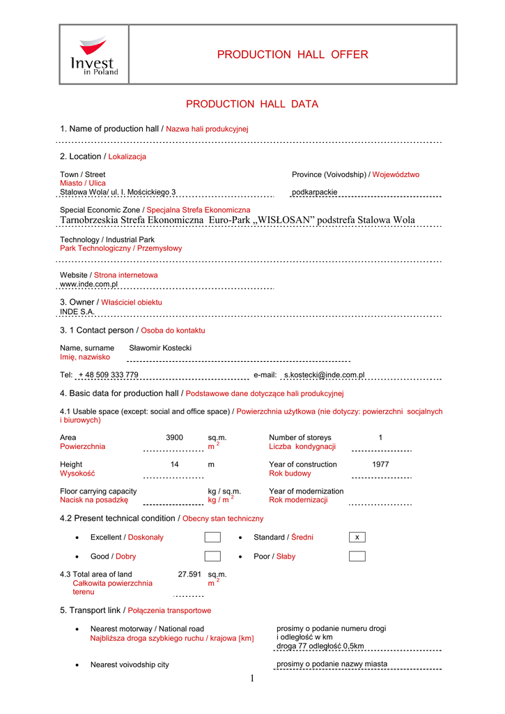 PRODUCTION HALL OFFER PRODUCTION HALL DATA 1. Name of production hall / Nazwa hali produkcyjnej 2. Location / Lokalizacja Province (Voivodship) / Województwo Town / Street Miasto / Ulica Stalowa Wola/ ul. I. Mościckiego 3 podkarpackie Special Economic Zone / Specjalna Strefa Ekonomiczna Tarnobrzeskia Strefa Ekonomiczna Euro-Park „WISŁOSAN” podstrefa Stalowa Wola Technology / Industrial Park Park Technologiczny / Przemysłowy Website / Strona internetowa www.inde.com.pl 3. Owner / Właściciel obiektu INDE S.A. 3. 1 Contact person / Osoba do kontaktu Name, surname Imię, nazwisko Sławomir Kostecki Tel: + 48 509 333 779 e-mail: [email protected] 4. Basic data for production hall / Podstawowe dane dotyczące hali produkcyjnej 4.1 Usable space (except: social and office space) / Powierzchnia użytkowa (nie dotyczy: powierzchni socjalnych i biurowych) Area Powierzchnia 3900 Height Wysokość Floor carrying capacity Nacisk na posadzkę 14 sq.m. 2 m Number of storeys Liczba kondygnacji 1 m Year of construction Rok budowy 1977 kg / sq.m. 2 kg / m Year of modernization Rok modernizacji 4.2 Present technical condition / Obecny stan techniczny Excellent / Doskonały Standard / Średni Good / Dobry Poor / Słaby 4.3 Total area of land Całkowita powierzchnia terenu x 27.591 sq.m. 2 m 5. Transport link / Połączenia transportowe Nearest motorway / National road Najbliższa droga szybkiego ruchu / krajowa km prosimy o podanie numeru drogi i odległość w km droga 77 odległość 0,5km Nearest voivodship city prosimy o podanie nazwy miasta 1 Najbliższe miasto wojewódzkie km i odległość w km Rzeszów 60km Nearest international airport Najbliższe lotnisko międzynarodowe km nazwa miasta i odległość w km Jasionka 50km 6. Infrastructure / Infrastruktura Power / Elektryczność x Sewage system / Kanalizacja x Water / Woda x Access road for trucks / Dojazd dla ciężarówek x Gas / Gaz x Overhead cranes / Suwnice x Heating / Ogrzewanie x Railway siding / Bocznica 7. Terms of acquisition / Warunki nabycia Ownership / Własność x Perpetual usufruct / Użytkowanie wieczyste x Lease / Wynajem x 54.600 7.1 Price in PLN, including hall and land PLN Cena w pln, hali i działki 8. Additional information / Dodatkowe informacje Price includes the rental of the main hall 3648m2 and the smaller hall 252 sq.m - Total 3900m2 In addition to the rent: a) storage facilities connected to the main Hall of the area. 310 sq.m x 12.00PLN = 3.720,00 PLN b) Storage facilities combined with an additional Hall of the area. 290 sq.m x 12.00 PLN= 3.480,00 PLN c) social rooms and offices of the area. 2200 sq.m x 10.00 PLN 22.000,00 PLN The total area of all buildings on the property is 8331 sq.m. Sales price of all objects in the property, including the right of perpetual usufruct of land with an area of 27951sq.m is 8,000,000.00 PLN (eight million) Podana wyżej cena za wynajem miesięcznie, obejmuje Halę główną 3648m2 oraz halę mniejszą 252 m2. Razem 3900m2 x 14 PLN/m2 Dodatkowo do wynajęcia: a) pomieszczenia magazynowe połączone z Halą główną o pow. 310 m2 x 12,00 PLN = 3.720,00PLN b) pomieszczenia magazynowe połączone z Halą dodatkową o pow. 290 m2 x 12,00 PLN = 3.480,00PLN. c) pomieszczenia socjalne I biura o pow. 2200m2 x 10,00PLN = 22.000,00 PLN. Powierzchnia całkowita wszystkich obiektów na terenie nieruchomości wynosi 8331m2. Cena sprzedaży praw własności wszystkich obiektów na terenie nieruchomości wraz z prawem wieczystego użytkowania działek o powierzchni 27951m2 wynosi 8.000.000,00PLN (osiem milionów złotych) Production building is equipped with gantry cranes with lifting capacity of 20 tonnes and metal processing machinery. You will find a detailed description on www.inde.com.pl. The property is fenced, has own parking space and is easily accessible even for the biggest TIR vehicles. Production building is located in industrial zone in the area of former Ironworks Huta Stalowa Wola. In close proximity of the building there is industrial complex which includes one of the world's biggest manufacturer of alloy wheels. HALA wyposażona jest w suwnice z udźwigiem do 20 ton i urządzenia umożliwiające wykonywanie procesów obróbki metali. Dokładny opis na www.inde.com.pl Obiekt ogrodzony, z wygodnym dojazdem dla nawet największych pojazdów TIR, dysponuje własnym parkingiem. Hala znajduje się w strefie przemysłowej, na dawnym terenie Huty Stalowa Wola. W bezpośrednim sąsiedztwie znajdują się zakłady przemysłowe w tym jeden z największych w świecie producentów felg aluminiowych. Date of the offer Data przygotowania oferty 2013-02-05 2