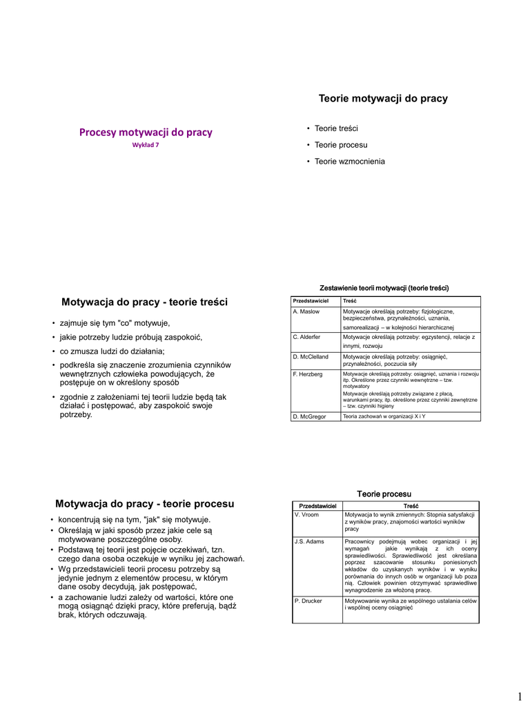 Teorie motywacji do pracy Procesy motywacji do pracy Wykład 7 • Teorie treści • Teorie procesu • Teorie wzmocnienia Zestawienie teorii motywacji (teorie treści) Motywacja do pracy - teorie treści Przedstawiciel Treść A. Maslow Motywacje określają potrzeby: fizjologiczne, bezpieczeństwa, przynależności, uznania, • zajmuje się tym "co" motywuje, • jakie potrzeby ludzie próbują zaspokoić, • co zmusza ludzi do działania; • podkreśla się znaczenie zrozumienia czynników wewnętrznych człowieka powodujących, że postępuje on w określony sposób • zgodnie z założeniami tej teorii ludzie będą tak działać i postępować, aby zaspokoić swoje potrzeby. samorealizacji – w kolejności hierarchicznej C. Alderfer Motywacje określają potrzeby: egzystencji, relacje z innymi, rozwoju D. McClelland Motywacje określają potrzeby: osiągnięć, przynależności, poczucia siły F. Herzberg Motywacje określają potrzeby: osiągnięć, uznania i rozwoju itp. Określone przez czynniki wewnętrzne – tzw. motywatory Motywacje określają potrzeby związane z płacą, warunkami pracy, itp. określone przez czynniki zewnętrzne – tzw. czynniki higieny D. McGregor Teoria zachowań w organizacji X i Y Teorie procesu Motywacja do pracy - teorie procesu • koncentrują się na tym, "jak" się motywuje. • Określają w jaki sposób przez jakie cele są motywowane poszczególne osoby. • Podstawą tej teorii jest pojęcie oczekiwań, tzn. czego dana osoba oczekuje w wyniku jej zachowań. • Wg przedstawicieli teorii procesu potrzeby są jedynie jednym z elementów procesu, w którym dane osoby decydują, jak postępować, • a zachowanie ludzi zależy od wartości, które one mogą osiągnąć dzięki pracy, które preferują, bądź brak, których odczuwają. Przedstawiciel Treść V. Vroom Motywacja to wynik zmiennych: Stopnia satysfakcji z wyników pracy, znajomości wartości wyników pracy J.S. Adams Pracownicy podejmują wobec organizacji i jej wymagań jakie wynikają z ich oceny sprawiedliwości. Sprawiedliwość jest określana poprzez szacowanie stosunku poniesionych wkładów do uzyskanych wyników i w wyniku porównania do innych osób w organizacji lub poza nią. Człowiek powinien otrzymywać sprawiedliwe wynagrodzenie za włożoną pracę. P. Drucker Motywowanie wynika ze wspólnego ustalania celów i wspólnej oceny osiągnięć 1 Motywacja do pracy - teorie wzmocnienia • kładą nacisk na uczenie się zachowań. • Zajmuje się tym w jaki sposób skutki poprzedniego działania wpływają na zachowania w przyszłości w cyklicznym procesie uczenia się. • Zgodnie z tą teorią ludzie postępują tak, jak postępują, ponieważ się tak nauczyli w przeszłości, • pewne zachowania wiążą się z przyjemnymi efektami a inne z nieprzyjemnymi. • Poszczególne osoby są skłonne do przestrzegania prawa czy wykonywania poleceń, ponieważ nauczyli się w domu i szkole, że nieposłuszeństwo pociąga za sobą karę. TEORIA TRYCHOTOMII POTRZEB McClellanda • Władzy Potrzeba wywierania wpływu na innych i kontrolowania swojego otoczenia • Afiliacji Pragnienie ludzkiego towarzystwa i akceptacji przez grupę • Osiągnięć Pragnienie pełnej realizacji wyznaczonych celów oraz wykonania zadania w sposób lepszy niż w przeszłości • Człowiek odczuwa jednocześnie wszystkie trzy potrzeby (w różnym natężeniu) • Do określonego działania motywuje dominująca potrzeba • Potrzeby mogą mięć charakter nabyty • Osoba o dominującej potrzebie władzy – – dąży do osiągnięcia wysokich stanowisk w strukturze organizacji i pragnie wywierać wpływ na jej funkcjonowanie – Koncentruje się na poszerzenie swej władzy, a nie na poprawnym wykonywaniu zadań – Duża wagę przywiązuje do prestiżu i symboli statusu – Dobrze czuje się w sytuacjach konkurencji – Jest menadżerem wysokiego szczebla • Osoba o dominującej potrzebie afiliacji – – – – – Pragnie realizować zadania wymagające kontaktów interpersonalnych Potrzebuje silnych pozytywnych więzi interpersonalnych Preferuje współpracę, odrzuca konkurencję Odczuwa niską potrzebę władzy – Osoby o dominującej potrzebie osiągnięć – Preferuje zadania o osobistej odpowiedzialności oraz wymagające nowatorskich rozwiązań – Satysfakcję czerpie z realizacji zadań, a nie z nagród – Preferuje zadania średnio trudne – Jest lepszym menadżerem – Koncentruje się na własnych zadaniach, zaniedbując funkcje kierownicze – Jest dobrym kierownikiem firmy Teoria niesprawiedliwości społecznej • Pracownicy dążą do sprawiedliwych korzyści, wynikających z ich nakładu pracy moje korzyści mój nakład pracy > = < korzyści innego pracownika (subiektywnego punktu odniesienia) nakład pracy innego pracownika (subiektywnego punktu odniesienia) WSKAZÓWKI dla ZARZĄDZANIA • Krytyka teorii – TAT = subiektywność – Badani przez McClellanda to głównie mężczyźni – Traktuje tylko o potrzebach wyższego rzędu • Zastosowanie w motywowaniu wyższej kadry kierowniczej • Możliwość kształtowania potrzeby osiągnięć poprzez udzielane pochwały i metody w systemie zarządzania zmierzające do samodzielności i odpowiedzialności pracowników Wybór ważnych korzyści i nakładów • System wartości (zmienne w czasie) Nakłady - wysiłek - wykształcenie - staż pracy - wiek - jakość pracy - trudność pracy - doświadczenie zawodowe - umiejętności - lojalność wobec organizacji - stanowisko - dyspozycyjność - czas pracy - wypracowany zysk Korzyści - płaca zasadnicza - premie - świadczenia - uznanie - awanse - stosunki interpersonalne - bezpieczeństwo zatrudnienia - warunki pracy - tytuł służbowy - autonomia Wartości pracownika Wartości firmy KONFLIKT 2 Kluczowe znaczenie mają czynniki o charakterze subiektywnym, do których należą m.in. - wybór punktu odniesienia - dobór i wartościowanie nakładów i korzy