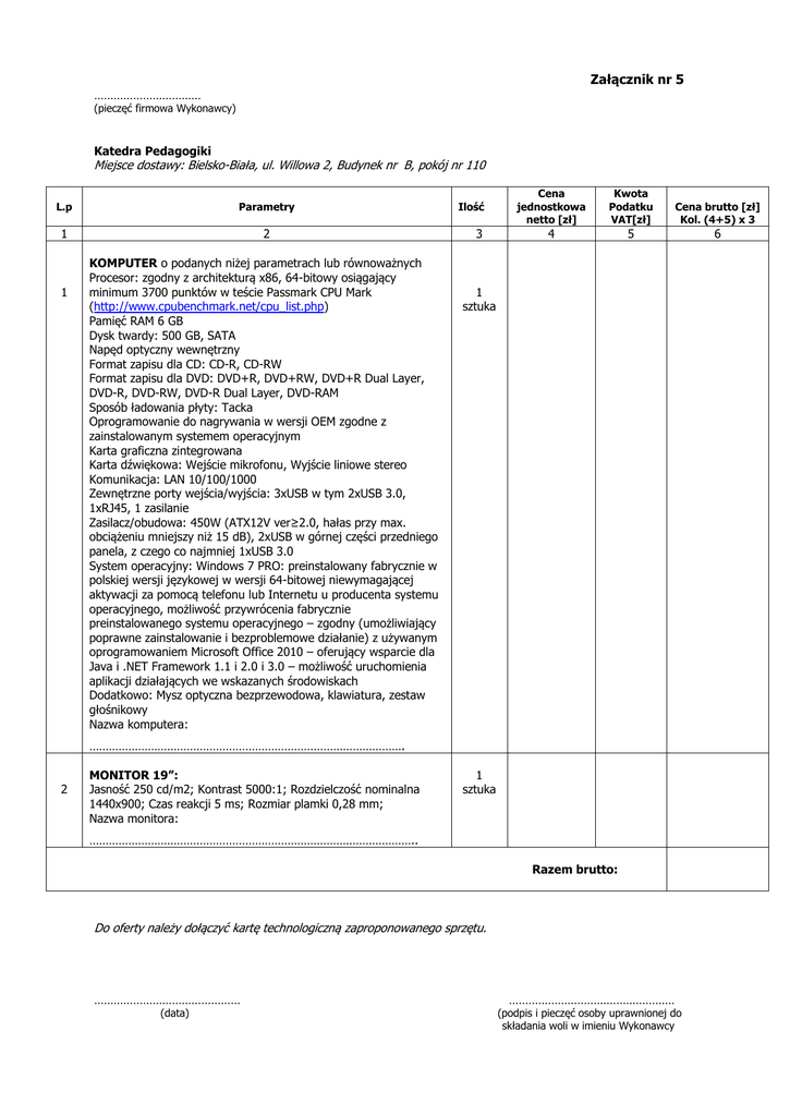 Załącznik nr 5 …………………………… (pieczęć firmowa Wykonawcy) Katedra Pedagogiki Miejsce dostawy: Bielsko-Biała, ul. Willowa 2, Budynek nr B, pokój nr 110 L.p Parametry 1 2 1 KOMPUTER o podanych niżej parametrach lub równoważnych Procesor: zgodny z architekturą x86, 64-bitowy osiągający minimum 3700 punktów w teście Passmark CPU Mark (http://www.cpubenchmark.net/cpu_list.php) Pamięć RAM 6 GB Dysk twardy: 500 GB, SATA Napęd optyczny wewnętrzny Format zapisu dla CD: CD-R, CD-RW Format zapisu dla DVD: DVD+R, DVD+RW, DVD+R Dual Layer, DVD-R, DVD-RW, DVD-R Dual Layer, DVD-RAM Sposób ładowania płyty: Tacka Oprogramowanie do nagrywania w wersji OEM zgodne z zainstalowanym systemem operacyjnym Karta graficzna zintegrowana Karta dźwiękowa: Wejście mikrofonu, Wyjście liniowe stereo Komunikacja: LAN 10/100/1000 Zewnętrzne porty wejścia/wyjścia: 3xUSB w tym 2xUSB 3.0, 1xRJ45, 1 zasilanie Zasilacz/obudowa: 450W (ATX12V ver≥2.0, hałas przy max. obciążeniu mniejszy niż 15 dB), 2xUSB w górnej części przedniego panela, z czego co najmniej 1xUSB 3.0 System operacyjny: Windows 7 PRO: preinstalowany fabrycznie w polskiej wersji językowej w wersji 64-bitowej niewymagającej aktywacji za pomocą telefonu lub Internetu u producenta systemu operacyjnego, możliwość przywrócenia fabrycznie preinstalowanego systemu operacyjnego – zgodny (umożliwiający poprawne zainstalowanie i bezproblemowe działanie) z używanym oprogramowaniem Microsoft Office 2010 – oferujący wsparcie dla Java i .NET Framework 1.1 i 2.0 i 3.0 – możliwość uruchomienia aplikacji działających we wskazanych środowiskach Dodatkowo: Mysz optyczna bezprzewodowa, klawiatura, zestaw głośnikowy Nazwa komputera: Ilość 3 Cena jednostkowa netto [zł] Kwota Podatku VAT[zł] Cena brutto [zł] Kol. (4+5) x 3 4 5 6 1 sztuka ……………………………………………………………………………………. 2 MONITOR 19”: Jasność 250 cd/m2; Kontrast 5000:1; Rozdzielczość nominalna 1440x900; Czas reakcji 5 ms; Rozmiar plamki 0,28 mm; Nazwa monitora: 1 sztuka ……………………………………………………………………………………….. Razem brutto: Do oferty należy dołączyć kartę technologiczną zaproponowanego sprzętu. ……………………………………… (data) …………………………………………… (podpis i pieczęć osoby uprawnionej do składania woli w imieniu Wykonawcy