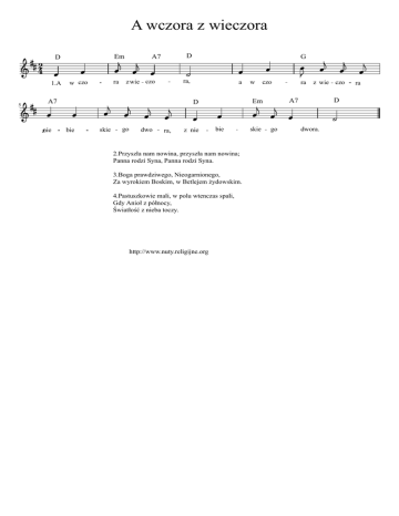 A wczora z wieczora 42 Em D 1.A 5 D A7 ra, ra zwie czo w czo A7 znie G a skie go dwo ra, z nie bie 2.Przyszła nam nowina, przyszła nam nowina; Panna rodzi Syna, Panna rodzi Syna. 3.Boga prawdziwego, Nieogarnionego, Za wyrokiem Boskim, w Betlejem żydowskim. 4.Pastuszkowie mali, w polu wtenczas spali, Gdy Anioł z północy, Światłość z nieba toczy. http://www.nuty.religijne.org skie ra z wie czo D A7 Em D bie w czo go dwora. ra