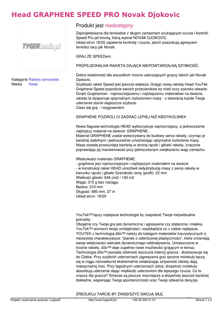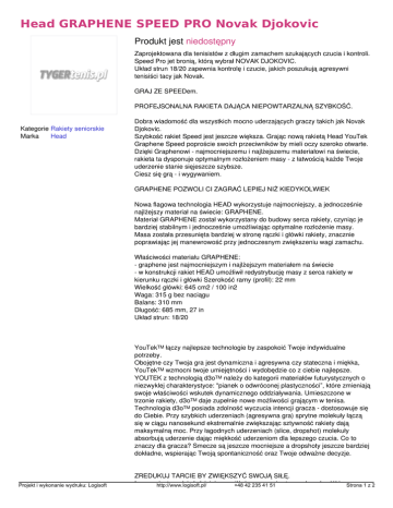 Head GRAPHENE SPEED PRO Novak Djokovic Produkt jest niedostępny Zaprojektowana dla tenisistów z długim zamachem szukających czucia i kontroli. Speed Pro jet bronią, którą wybrał NOVAK DJOKOVIC. Układ strun 18/20 zapewnia kontrolę i czucie, jakich poszukują agresywni tenisiści tacy jak Novak. GRAJ ZE SPEEDem. PROFEJSONALNA RAKIETA DAJĄCA NIEPOWTARZALNĄ SZYBKOŚĆ. Kategorie Rakiety seniorskie Marka Head Dobra wiadomość dla wszystkich mocno uderzających graczy takich jak Novak Djokovic. Szybkość rakiet Speed jest jeszcze większa. Grając nową rakietą Head YouTek Graphene Speed poproście swoich przeciwników by mieli oczy szeroko otwarte. Dzięki Graphenowi - najmocniejszemu i najlżejszemu materiałowi na świecie, rakieta ta dysponuje optymalnym rozłożeniem masy - z łatwością każde Twoje uderzenie stanie sięjeszcze szybsze. Ciesz się grą - i wygywaniem. GRAPHENE POZWOLI CI ZAGRAĆ LEPIEJ NIŻ KIEDYKOLWIEK Nowa flagowa technologia HEAD wykorzystuje najmocniejszy, a jednocześnie najlżejszy materiał na świecie: GRAPHENE. Materiał GRAPHENE został wykorzystany do budowy serca rakiety, czyniąc je bardziej stabilnym i jednocześnie umożliwiając optymalne rozłożenie masy. Masa została przesunięta bardziej w stronę rączki i główki rakiety, znacznie poprawiając jej manewrowość przy jednoczesnym zwiększeniu wagi zamachu. Właściwości materiału GRAPHENE: - graphene jest najmocniejszym i najlżejszym materiałem na świecie - w konstrukcji rakiet HEAD umożliwił redystrybucję masy z serca rakiety w kierunku rączki i główki Szerokość ramy (profil): 22 mm Wielkość główki: 645 cm2 / 100 in2 Waga: 315 g bez naciągu Balans: 310 mm Długość: 685 mm, 27 in Układ strun: 18/20 YouTek™ łączy najlepsze technologie by zaspokoić Twoje indywidualne potrzeby. Obojętne czy Twoja gra jest dynamiczna i agresywna czy stateczna i miękka, YouTek™ wzmocni twoje umiejętności i wydobędzie co z ciebie najlepsze. YOUTEK z technologią d3o™ należy do kategorii materiałów futurystycznych o niezwyklej charakterystyce: "pianek o odwróconej plastyczności”, które zmieniają swoje właściwości wskutek dynamicznego oddziaływania. Umieszczone w trzonie rakiety, d3o™ daje zupełnie nowe możliwości grającym w tenisa. Technologia d3o™ posiada zdolność wyczucia intencji gracza - dostosowuje się do Ciebie. Przy szybkich uderzeniach (agresywna gra) sprytne molekuły łączą się w ciągu nanosekund ekstremalnie zwiększając sztywność rakiety dają maksymalną moc. Przy łagodnych uderzeniach (slice, dropshot) molekuły absorbują uderzenie dając miękkość uderzeniom dla lepszego czucia. Co to znaczy dla gracza? Smecze są jeszcze mocniejsze a dropshoty jeszcze bardziej dokładne, wspierając Twoją spontaniczność oraz Twoje odważne decyzje. Projekt i wykonanie wydruku: Logisoft ZREDUKUJ TARCIE BY ZWIĘKSZYĆ SWOJĄ SIŁĘ. Innegrahttp://www.logisoft.pl/ jest na dzień dzisiejszy najlżejszym z najwytrzymalszych włókien.Strona 1 z 2 +48 42 235 41 51 Jego ekstremalna twardość w połączeniu z zaawansowaną technologią HEAD w zakresie kompozytów węglowych pozwoliła na stworzenie nowatorskiego ultra wytrzymałego kompozytu hybrydowego. Nowa hybrydowo-kompozytowa struktura HEAD Innegra zastosowana w rakiecie zapewnia redukcję wibracji rakiety oraz jej zwiększoną stabilność. Rezultat zastosowania nowej technologii to wibracje zmniejszone o 17 % podczas kontaktu z piłką, a więc unikalna kontrola i precyzja. Technologia HEAD chroni gracza przed szkodliwymi efektami kontaktu piłki z rakietą. Największa korzyść: nowa struktura hybrydowo-kompozytowa HEAD z ultra wytrzymałym włóknem Innegra znacznie poprawia osiągi twojej rakiety HEAD. Oznacza to, że rakieta dłużej pozostanie w perfekcyjnym stanie bez jakiejkolwiek utraty doskonałych właściwości. Wersja produktu Cena Dane techniczne Rączka Projekt i wykonanie wydruku: Logisoft Powered by TCPDF (www.tcpdf.org) 2 http://www.logisoft.pl/ +48 42 235 41 51 Strona 2 z 2