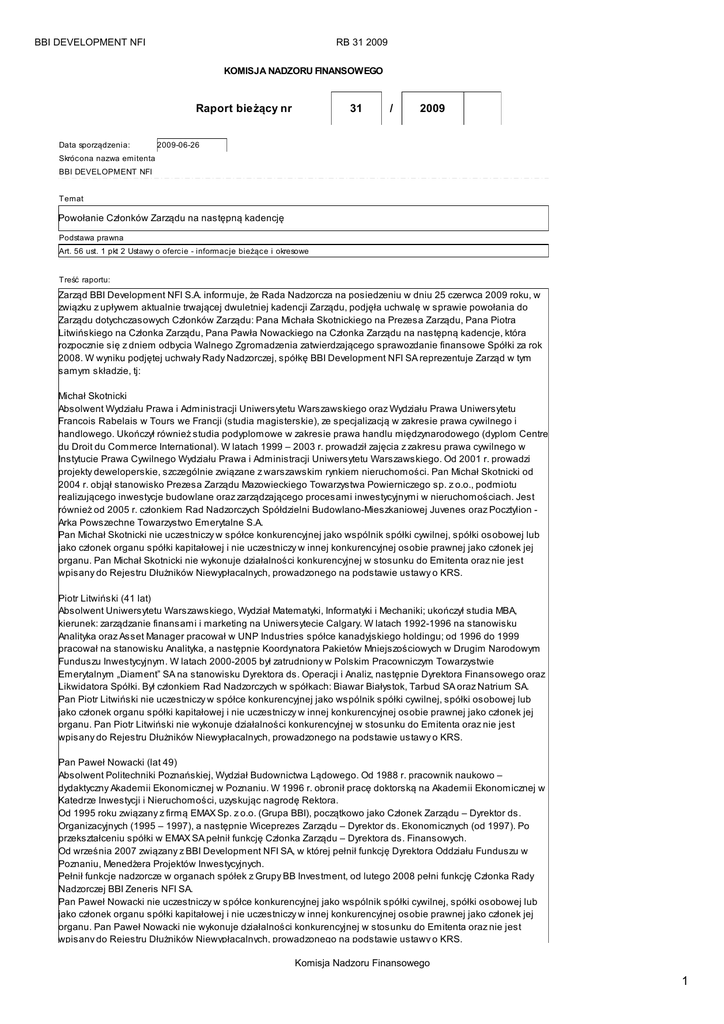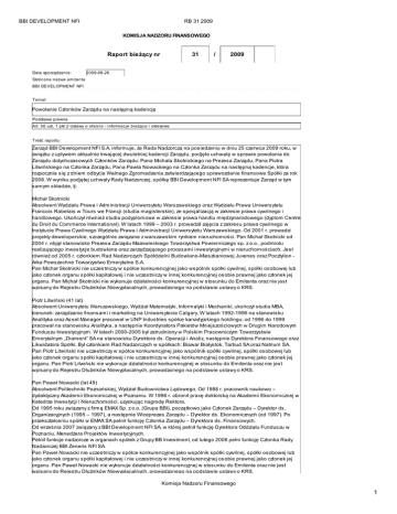 BBI DEVELOPMENT NFI RB 31 2009 KOMISJA NADZORU FINANSOWEGO Raport bieżący nr Data sporządzenia: 31 / 2009 2009-06-26 Skrócona nazwa emitenta BBI DEVELOPMENT NFI Temat Powołanie Członków Zarządu na następną kadencję Podstawa prawna Art. 56 ust. 1 pkt 2 Ustawy o ofercie - informacje bieżące i okresowe Treść raportu: Zarząd BBI Development NFI S.A. informuje, że Rada Nadzorcza na posiedzeniu w dniu 25 czerwca 2009 roku, w związku z upływem aktualnie trwającej dwuletniej kadencji Zarządu, podjęła uchwalę w sprawie powołania do Zarządu dotychczasowych Członków Zarządu: Pana Michała Skotnickiego na Prezesa Zarządu, Pana Piotra Litwińskiego na Członka Zarządu, Pana Pawła Nowackiego na Członka Zarządu na następną kadencje, która rozpocznie się z dniem odbycia Walnego Zgromadzenia zatwierdzającego sprawozdanie finansowe Spółki za rok 2008. W wyniku podjętej uchwały Rady Nadzorczej, spółkę BBI Development NFI SA reprezentuje Zarząd w tym samym składzie, tj: Michał Skotnicki Absolwent Wydziału Prawa i Administracji Uniwersytetu Warszawskiego oraz Wydziału Prawa Uniwersytetu Francois Rabelais w Tours we Francji (studia magisterskie), ze specjalizacją w zakresie prawa cywilnego i handlowego. Ukończył również studia podyplomowe w zakresie prawa handlu międzynarodowego (dyplom Centre du Droit du Commerce International). W latach 1999 – 2003 r. prowadził zajęcia z zakresu prawa cywilnego w Instytucie Prawa Cywilnego Wydziału Prawa i Administracji Uniwersytetu Warszawskiego. Od 2001 r. prowadzi projekty deweloperskie, szczególnie związane z warszawskim rynkiem nieruchomości. Pan Michał Skotnicki od 2004 r. objął stanowisko Prezesa Zarządu Mazowieckiego Towarzystwa Powierniczego sp. z o.o., podmiotu realizującego inwestycje budowlane oraz zarządzającego procesami inwestycyjnymi w nieruchomościach. Jest również od 2005 r. członkiem Rad Nadzorczych Spółdzielni Budowlano-Mieszkaniowej Juvenes oraz Pocztylion Arka Powszechne Towarzystwo Emerytalne S.A. Pan Michał Skotnicki nie uczestniczy w spółce konkurencyjnej jako wspólnik spółki cywilnej, spółki osobowej lub jako członek organu spółki kapitałowej i nie uczestniczy w innej konkurencyjnej osobie prawnej jako członek jej organu. Pan Michał Skotnicki nie wykonuje działalności konkurencyjnej w stosunku do Emitenta oraz nie jest wpisany do Rejestru Dłużników Niewypłacalnych, prowadzonego na podstawie ustawy o KRS. Piotr Litwiński (41 lat) Absolwent Uniwersytetu Warszawskiego, Wydział Matematyki, Informatyki i Mechaniki; ukończył studia MBA, kierunek: zarządzanie finansami i marketing na Uniwersytecie Calgary. W latach 1992-1996 na stanowisku Analityka oraz Asset Manager pracował w UNP Industries spółce kanadyjskiego holdingu; od 1996 do 1999 pracował na stanowisku Analityka, a następnie Koordynatora Pakietów Mniejszościowych w Drugim Narodowym Funduszu Inwestycyjnym. W latach 2000-2005 był zatrudniony w Polskim Pracowniczym Towarzystwie Emerytalnym „Diament” SA na stanowisku Dyrektora ds. Operacji i Analiz, następnie Dyrektora Finansowego oraz Likwidatora Spółki. Był członkiem Rad Nadzorczych w spółkach: Biawar Białystok, Tarbud SA oraz Natrium SA. Pan Piotr Litwiński nie uczestniczy w spółce konkurencyjnej jako wspólnik spółki cywilnej, spółki osobowej lub jako członek organu spółki kapitałowej i nie uczestniczy w innej konkurencyjnej osobie prawnej jako członek jej organu. Pan Piotr Litwiński nie wykonuje działalności konkurencyjnej w stosunku do Emitenta oraz nie jest wpisany do Rejestru Dłużników Niewypłacalnych, prowadzonego na podstawie ustawy o KRS. Pan Paweł Nowacki (lat 49) Absolwent Politechniki Poznańskiej, Wydział Budownictwa Lądowego. Od 1988 r. pracownik naukowo – dydaktyczny Akademii Ekonomicznej w Poznaniu. W 1996 r. obronił pracę doktorską na Akademii Ekonomicznej w Katedrze Inwestycji i Nieruchomości, uzyskując nagrodę Rektora. Od 1995 roku związany z firmą EMAX Sp. z o.o. (Grupa BBI), początkowo jako Członek Zarządu – Dyrektor ds. Organizacyjnych (1995 – 1997), a następnie Wiceprezes Zarządu – Dyrektor ds. Ekonomicznych (od 1997). Po przekształceniu spółki w EMAX SA pełnił funkcję Członka Zarządu – Dyrektora ds. Finansowych. Od września 2007 związany z BBI Development NFI SA, w której pełnił funkcję Dyrektora Oddziału Funduszu w Poznaniu, Menedżera Projektów Inwestycyjnych. Pełnił funkcje nadzorcze w organach spółek z Grupy BB Investment, od lutego 2008 pełni funkcję Członka Rady Nadzorczej BBI Zeneris NFI SA. Pan Paweł Nowacki nie uczestniczy w spółce konkurencyjnej jako wspólnik spółki cywilnej, spółki osobowej lub jako członek organu spółki kapitałowej i nie uczestniczy w innej konkurencyjnej osobie prawnej jako członek jej organu. Pan Paweł Nowacki nie wykonuje działalności konkurencyjnej w stosunku do Emitenta oraz nie jest wpisany do Rejestru Dłużników Niewypłacalnych, prowadzonego na podstawie ustawy o KRS. Komisja Nadzoru Finansowego 1 BBI DEVELOPMENT NFI RB 31 2009 wpisany do Rejestru Dłużników Niewypłacalnych, prowadzonego na podstawie ustawy o KRS. Podstawa prawna: § 5 ust. 1 pkt 22) i § 28 Rozporządzenia Ministra Finansów z dnia 19 lutego 2009 r. w sprawie informacji bieżących i okresowych przekazywanych przez emitentów papierów wartościowych oraz warunków uznawania za równoważne informacji wymaganych przepisami prawa państwa niebędącego państwem członkowskim (Dz.U. Nr 33 z dnia 28.02.2009 r., poz. 259). BBI Development Narodowy Fundusz Inwestyc yjny SA (pełna nazwa emitenta) BBI DEVELOPMENT NFI Budownictwo (bud) (skróc ona nazwa emitenta) 00-688 (sektor wg. klasyfikacji GPW w W-wie) Warszawa (kod pocztowy) (miejscowość) Emilii Plater 28 (ulica) (numer) 630 33 88 630 33 90 (telefon) (fax) [email protected] www.bbidevelopment.pl (e-mail) (www) 526-10-22-256 010956222 (NIP) (REGON) PODPISY OSÓB