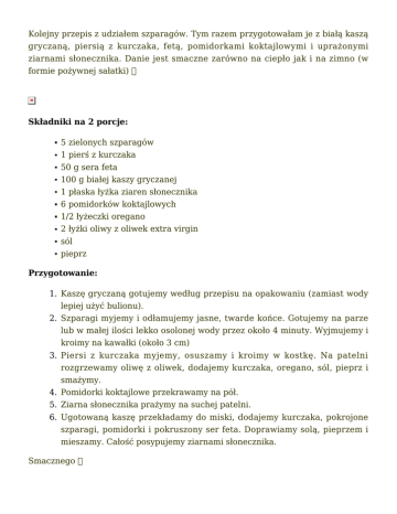 Kolejny przepis z udziałem szparagów. Tym razem przygotowałam je z białą kaszą gryczaną, piersią z kurczaka, fetą, pomidorkami koktajlowymi i uprażonymi ziarnami słonecznika. Danie jest smaczne zarówno na ciepło jak i na zimno (w formie pożywnej sałatki) Składniki na 2 porcje: 5 zielonych szparagów 1 pierś z kurczaka 50 g sera feta 100 g białej kaszy gryczanej 1 płaska łyżka ziaren słonecznika 6 pomidorków koktajlowych 1/2 łyżeczki oregano 2 łyżki oliwy z oliwek extra virgin sól pieprz Przygotowanie: 1. Kaszę gryczaną gotujemy według przepisu na opakowaniu (zamiast wody lepiej użyć bulionu). 2. Szparagi myjemy i odłamujemy jasne, twarde końce. Gotujemy na parze lub w małej ilości lekko osolonej wody przez około 4 minuty. Wyjmujemy i kroimy na kawałki (około 3 cm) 3. Piersi z kurczaka myjemy, osuszamy i kroimy w kostkę. Na patelni rozgrzewamy oliwę z oliwek, dodajemy kurczaka, oregano, sól, pieprz i smażymy. 4. Pomidorki koktajlowe przekrawamy na pół. 5. Ziarna słonecznika prażymy na suchej patelni. 6. Ugotowaną kaszę przekładamy do miski, dodajemy kurczaka, pokrojone szparagi, pomidorki i pokruszony ser feta. Doprawiamy solą, pieprzem i mieszamy. Całość posypujemy ziarnami słonecznika. Smacznego Quiche… czyli klasyka kuchni francuskiej. Jest to placek z kruchego lub francuskiego ciasta wypełniony masą jajeczno-śmietanową. Może być przyrządzony z różnych składników i podawany jako danie główne, kolacja lub przekąska. Równie dobrze smakuje na ciepło jak i na zimno. Polecam Składniki: 1 opakowanie ciasta francuskiego (275 g) 450 g mrożonego szpinaku 15 pomidorków truskawkowych 4 jajka 300 ml śmietanki 30 % 1 łyżka startego parmezanu 2 plasterki szynki serrano 100 g sera feta 3 ząbki czosnku szczypta oregano sól pieprz Przygotowanie: Dno tortownicy o średnicy około 24 cm. wyłożyć papierem do pieczenia. Ciastem francuskim wyłożyć dno formy i boki mniej więcej do połowy wysokości. Na wierzch ułożyć papier do pieczenia obciążony grochem lub ryżem. Piec w piekarniku nagrzanym do 200°C przez około 15 minut. Następnie zdjąć papier z obciążeniem i piec kolejne 5 minut w 180°C. Rozmrożony szpinak przełożyć do większego rondelka, dodać szczyptę soli, przeciśnięty przez praskę czosnek i gotować na średnim ogniu, aż woda odparuje. Ostudzić. Do ostudzonego szpinaku dodać jajka, śmietankę, parmezan, szczyptę oregano i dokładnie wymieszać. Doprawić solą i pieprzem. Gotową masę przełożyć na przestudzone ciasto. Na wierzch ułożyć pokrojoną szynkę serrano, przekrojone wzdłuż pomidorki truskawkowe i pokruszony ser feta. Piec w piekarniku nagrzanym do 160°C (termoobieg) przez około 30 minut, aż jajka się zetną. Smacznego Prosta i bardzo smaczna przekąska z szynki serrano z serkiem śmietankowym, świeżą bazylią i pomidorkami truskawkowymi. Przygotowanie takich sakiewek nie zajmuje wiele czasu, ładnie prezentują się na talerzu i zapewne sprawdzą się podczas sylwestrowej nocy Składniki: 100 g szynki serrano w plasterkach *(może być też np. prosciutto) 180 g zmielonego twarogu (lub serek almette śmietankowy) garść świeżej bazylii pomidorki truskawkowe szczypiorek sól pieprz * Warto kupić szynkę, której każdy plasterek oddzielony jest papierkiem. Ułatwi to zrobienie sakiewek. Sakiewki formujemy razem z papierkiem, następnie ostrożnie go odrywamy. Przygotowanie: Serek przełożyć do miseczki, dodać drobno posiekaną bazylię i wymieszać. Doprawić solą i pieprzem. Na środek każdego plasterka szynki nałożyć pełną łyżeczkę przygotowanego serka i wcisnąć pomidorka. Ostrożnie uformować sakiewkę, następnie każdą związać szczypiorkiem. Smacznego Sycący gulasz z łopatki wieprzowej w pomidorowym sosie z fasolą Piękny Jaś, boczkiem i marchewką. Gulasz najsmaczniejszy jest na drugi dzień, jak wszystkie składniki się przegryzą. Pasuje do ziemniaków, kaszy lub z pieczywem. Składniki: 1 kg łopatki wieprzowej 1/2 kg fasoli Piękny Jaś 500 g passaty pomidorowej 1 duża marchewka 130 g wędzonego boczku 1 i 1/2 szklanki bulionu 3 łyżki koncentratu pomidorowego 1 duża cebula 4 ząbki czosnku 1/3 szklanki białego wytrawnego wina 1 łyżka mąki 1 łyżka masła 1 pęczek natki pietruszki 3 liście laurowe 5 ziarenek ziela angielskiego 1 łyżka tymianku 1 łyżka majeranku 1 łyżeczka pieprzu ziołowego 1/2 łyżeczki cząbru 1 łyżka suszonej papryki słodkiej sól pieprz Przygotowanie: Fasolę zalać zimną wodą i odstawić na noc. Następnego dnia wylać wodę i wlać około 1 litra świeżej. Dodać liście laurowe i gotować na małym ogniu pod przykryciem do miękkości. W razie potrzeby uzupełniać odparowana wodę. Do miski wrzucić umytą, osuszoną i pokrojoną w kostkę łopatkę. Dodać tymianek, majeranek, pieprz ziołowy, paprykę, cząber, odrobinę soli i wszystko dokładnie wymieszać. Na dużą i głęboką patelnię wrzucić pokrojony w malutką kosteczkę boczek, masło, mięso z przyprawami, posiekaną cebulę i podsmażyć. Dodać drobniutko posiekany czosnek i oprószyć wszystko mąką. Mieszając, smażyć jeszcze około 1 minutę. Całość zalać bulionem, dodać ziele angielskie, passatę pomidorową, koncentrat pomidorowy, wino i sól. Wymieszać. Gotować pod przykryciem, aż mięso będzie miękkie. Następnie dodać obraną i pokrojoną w kostkę marchewkę i fasolę z wodą z gotowania. Wszystko wymieszać i gotować na małym ogniu przez około 20 minut, aż marchewka zmięknie i wszystkie smaki się połączą. Na koniec dodać do gulaszu posiekaną natkę pietruszki. Wymieszać, doprawić solą i pieprzem. Smacznego Makaron w formie tartaletki? Czemu nie. Wyszła naprawdę ciekawa, smaczna i szybka przekąska (lub śniadanie). Jedyną czasochłonną czynnością było wyłożenie i przycięcie makaronu we wgłębienia boków foremek. Ech… szkoda, że mało go widać. Składniki (n