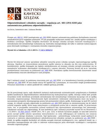 Odpowiedzialność członków zarządu – regulacja art. 483 (293) KSH jako autonomiczna podstawa odpowiedzialności ius.focus, komentarz mec. Łukasza Beraka Przepis art. 483 § 1 KSH (analogicznie art. 293 KSH) stanowi autonomiczną podstawę dochodzenia roszczeń odszkodowawczych względem piastunów. W tym przypadku wyłączone zostały tzw. zasady ogólne wynikające z Kodeksu cywilnego. Spółka mogłaby dochodzić od danego członka zarządu roszczeń wynikających z niewykonania lub nienależytego wykonania np. kontraktu managerskiego ale tylko w zakresie wykraczającym poza obowiązki wynikające z nawiązania stosunku organizacyjnego. Wyrok SA w Gdańsku z 23.1.2013 r. V ACA 1016/12 Wyrok SA dotyczył umowy sprzedaży udziałów zawartej przez członka zarządu reprezentującego spółkę akcyjną. Zgodnie ze stanowiskiem powodowej spółki umowa ta okazała się dla niej niekorzystna. W konsekwencji, spółka domagała się zapłaty odszkodowania od swojego członka zarządu powołując się na nienależyte wykonanie obowiązków wynikających z umowy zlecenia. Pozwany bronił się m.in. zarzutem przedawnienia roszczenia na podstawie art. 488 KSH. Powodowa spółka kwestionowała stosowanie zasad przedawnienia roszczeń określonych w tym przepisie. Sąd I instancji uznał, że podstawą roszczenia jest art. 483 KSH, a w konsekwencji kwestię przedawnienia reguluje art. 488 KSH. W tym stanie rzeczy SO zgodził się z pozwanym, że roszczenie uległo przedawnieniu. Powyższe stanowisko w całości podzielił SA i oddalił apelację powódki. Na tle powyższego sporu, sądy obydwóch instancji zaakcentowały autonomiczność uregulowania w Kodeksie spółek handlowych odpowiedzialności odszkodowawczej funkcjonariuszy spółki, którego celem było przede wszystkim ścisłe określenie przesłanki niewykonania lub nienależytego wykonania łączącego ich ze spółką stosunku organizacyjnego. Niewykonanie bądź nienależyte wykonanie zobowiązania musi się łączyć z naruszeniem przepisów obowiązującego prawa lub postanowień statutu spółki. Kontynuując tę myśl SO zwrócił uwagę, że członek zarządu odpowiada na podstawie art. 483 KSH jedynie za niezastosowanie się do takich uchwał organów spółki, które mają umocowanie w przepisach prawa lub w umowie spółki. W przeciwnym razie, tzn. w przypadku naruszenia uchwał wydanych bez upoważnienia ustawowego lub umownego, członkowie zarządu nie odpowiadają. W tym kontekście sąd I instancji przywołał wyrok SA we Wrocławiu z 1.12.2010 r. (II AKA 326/10, OSAW 2011, Nr 3, poz. 223), w którym wyrażono pogląd, że sam fakt zawarcia przez zarząd spółki umowy sprzedaży nieruchomości za cenę odbiegająca od rynkowej nie oznacza sprzeczności takiego działania z prawem. Sąd Apelacyjny – potwierdzając wyłączenie zasad ogólnych ex contractu w zakresie odpowiedzialności odszkodowawczej członków zarządu na podstawie art. 483 KSH – dodał, że spółka mogłaby dochodzić od członka zarządu roszczeń wynikających z ww. ogólnych zasad, np. z kontraktu managerskiego ale tylko w zakresie wykraczającym poza obowiązki wynikające z nawiązania stosunku organizacyjnego. Komentarz Najistotniejszą część obydwu orzeczeń stanowią tezy dotyczące autonomiczności odpowiedzialności piastunów na podstawie art. 483 KSH i wykluczenia stosowania w tym zakresie ogólnych zasad odpowiedzialności przewidzianych w art. 471 i nast. KC. Stanowisko sądów jest bez wątpienia emanacją orzeczenia z 9.2.2006 r. (V CSK 128/05, MoP 2006, Nr 5 s. 226), w którym SN uznał, że uchybienie członka zarządu spółki z o.o. nakazowi postępowania ze starannością wynikającą z zawodowego charakteru jego działalności (art. 293 § 2 i art. 483 § 2 KSH) nie kwalifikuje się samo w sobie jako działanie sprzeczne z prawem ani postanowieniami umowy spółki. Bezprawność działania członka zarządu powinna być wykazana przez odesłanie do konkretnego przepisu prawa lub postanowienia umowy spółki (statutu), które zostały naruszone. Stanowisko to wyznacza obecnie kierunek wykładni art. 293 i 483 KSH, która została powielona w wielu orzeczeniach sądowych (szczególnym wyrazem tego stanowiska jest wyrok SA w Warszawie z 18.7.2011 r., I AC 54/11 niepubl., w którym sąd uznał, że wspólnicy powinni zawrzeć w umowie (statucie) spółki katalog działań i zaniechań uznawanych przez nich za niedopuszczalne, jeśli chcą zabezpieczyć spółkę przed podejmowaniem przez zarząd działań niegospodarnych). Zarówno powyższe stanowisko sądów orzekających w analizowanej sprawie, jak i SN skłania do zdecydowanej krytyki, ponieważ w praktyce zwalania członków zarządu z odpowiedzialności odszkodowawczej za swoje działania, ograniczając tę odpowiedzialność do nadzwyczajnych sytuacji sprowadzających się do naruszenia przepisów prawa lub postanowień umowy (statutu) spółki. Niewątpliwie przyczyną tej marginalizacji odpowiedzialności piastunów jest niefortunna redakcja art. 293 i 483 KSH. Wbrew poglądom judykatury, odpowiedzialności funkcjonariuszy spółki nie można postrzegać jako autonomicznego reżimu odpowiedzialności, lecz jako jeden z przejawów ogólnych zasad odpowiedzialności ex contractu. Stąd odpowiedzialność członków zarządu nie powinna wymagać wykazania naruszenia odrębnych przepisów prawa lub umowy (statutu) spółki, co byłoby odpowiednie w przypadku odpowiedzialności deliktowej. Zważywszy, że członka zarządu łączy ze spółką stosunek zbliżony do zlecenia, naruszenie przez niego wzorca starannego działania wskazanego w art. 483 § 2 KSH (293 § 2 KSH) powinno stanowić jego działanie bezprawne, wystarczająco uzasadniające pociągnięcie go do odpowiedzialności odszkodowawczej. Nie ma potrzeby wykazania innych naruszeń przepisów prawa lub umowy spółki. Niestety, w świetle wyżej zaprezentowanych poglądów judykatury należy przyjąć, że