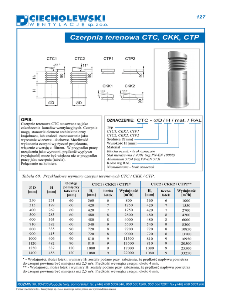 127 W E N T Y L A C J E sp. z o.o. Czerpnia terenowa CTC, CKK, CTP CTC2 CTC1 11° CTP2 CKK1 CKK2 90 90 90 11° H H1 CTP1 11° ÆD 90 11° ÆD OPIS: OZNACZENIE: CTC - ÆD / H / mat. / RAL Czerpnie terenowe CTC stosowane są jako zakończenie kanałów wentylacyjnych. Czerpnie mogą stanowić element architektoniczny krajobrazu, lub znaleźć zastosowanie jako wyrzutnie wieżowe - dachowe. Możliwość wykonania czerpni wg życzeń projektanta, włącznie z wersją z filtrem. W przypadku pracy urządzenia jako wyrzutni, prędkość wypływu (wydajność) może być większa niż w przypadku pracy jako czerpnia (tabela). Połączenie na kołnierz. Typ CTC1, CKK1, CTP1 CTC2, CKK2, CTP2 Średnica D[mm] Wysokość H [mm] Materiał Blacha ocynk. - brak oznaczeń Stal nierdzewna 1.4301 (wg PN-EN 10088) Aluminium 5754 (wg PN-EN 573) Kolor wg RAL Niemalowane - brak oznaczeń Tabela 60. Przykładowe wymiary czerpni terenowych CTC / CKK / CTP. ÆD [mm] H [mm] Odstęp pomiędzy lotkami l [mm] H1 [mm] liczba lotek Wydajność 3 [m /h] H1 [mm] liczba lotek Wydajność 3 [m /h] 250 315 400 500 600 710 800 900 1000 1120 1250 1400 251 199 262 283 363 382 335 415 406 482 337 458 60 60 60 60 60 60 90 90 90 90 120 120 360 420 420 480 480 540 720 720 810 810 1080 1080 6 7 7 8 8 9 8 8 9 9 9 9 800 1250 1750 2800 4000 5500 7200 9000 11300 13500 17000 22000 360 420 420 480 480 540 720 720 810 810 1080 1080 6 7 7 8 8 9 8 8 9 9 9 9 1000 1550 2700 4200 6000 8300 10850 13700 16950 20500 25500 33250 CTC1 / CKK1 / CTP1* CTC2 / CKK2 / CTP2** * - Wydajności, ilości lotek i wymiary H1 zostały podane przy założeniu, że prędkość napływu powietrza do czerpni powinna być mniejsza niż 2,5 m/s. Prędkość wewnątrz czerpni około 4 m/s. ** - Wydajności, ilości lotek i wymiary H1 zostały podane przy założeniu, że prędkość napływu powietrza do czerpni powinna być mniejsza niż 2,5 m/s. Prędkość wewnątrz czerpni około 6 m/s. 30, 83-236 (woj. pomorskie); tel. (+48) 058 5304340, 058 5881200, 058 5881201; fax (+48) 058 5881208 Firma Ciecholewski - Wentylacje sp. z o.o. zastrzega sobie prawo do wprowadzania zmian