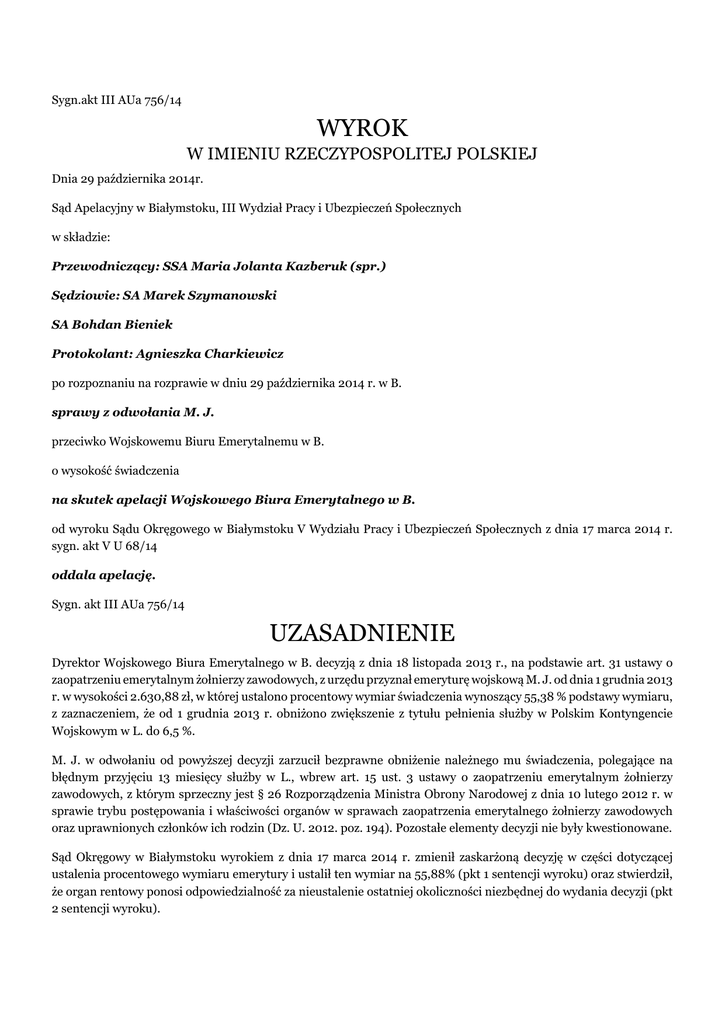 Sygn.akt III AUa 756/14 WYROK W IMIENIU RZECZYPOSPOLITEJ POLSKIEJ Dnia 29 października 2014r. Sąd Apelacyjny w Białymstoku, III Wydział Pracy i Ubezpieczeń Społecznych w składzie: Przewodniczący: SSA Maria Jolanta Kazberuk (spr.) Sędziowie: SA Marek Szymanowski SA Bohdan Bieniek Protokolant: Agnieszka Charkiewicz po rozpoznaniu na rozprawie w dniu 29 października 2014 r. w B. sprawy z odwołania M. J. przeciwko Wojskowemu Biuru Emerytalnemu w B. o wysokość świadczenia na skutek apelacji Wojskowego Biura Emerytalnego w B. od wyroku Sądu Okręgowego w Białymstoku V Wydziału Pracy i Ubezpieczeń Społecznych z dnia 17 marca 2014 r. sygn. akt V U 68/14 oddala apelację. Sygn. akt III AUa 756/14 UZASADNIENIE Dyrektor Wojskowego Biura Emerytalnego w B. decyzją z dnia 18 listopada 2013 r., na podstawie art. 31 ustawy o zaopatrzeniu emerytalnym żołnierzy zawodowych, z urzędu przyznał emeryturę wojskową M. J. od dnia 1 grudnia 2013 r. w wysokości 2.630,88 zł, w której ustalono procentowy wymiar świadczenia wynoszący 55,38 % podstawy wymiaru, z zaznaczeniem, że od 1 grudnia 2013 r. obniżono zwiększenie z tytułu pełnienia służby w Polskim Kontyngencie Wojskowym w L. do 6,5 %. M. J. w odwołaniu od powyższej decyzji zarzucił bezprawne obniżenie należnego mu świadczenia, polegające na błędnym przyjęciu 13 miesięcy służby w L., wbrew art. 15 ust. 3 ustawy o zaopatrzeniu emerytalnym żołnierzy zawodowych, z którym sprzeczny jest § 26 Rozporządzenia Ministra Obrony Narodowej z dnia 10 lutego 2012 r. w sprawie trybu postępowania i właściwości organów w sprawach zaopatrzenia emerytalnego żołnierzy zawodowych oraz uprawnionych członków ich rodzin (Dz. U. 2012. poz. 194). Pozostałe elementy decyzji nie były kwestionowane. Sąd Okręgowy w Białymstoku wyrokiem z dnia 17 marca 2014 r. zmienił zaskarżoną decyzję w części dotyczącej ustalenia procentowego wymiaru emerytury i ustalił ten wymiar na 55,88% (pkt 1 sentencji wyroku) oraz stwierdził, że organ rentowy ponosi odpowiedzialność za nieustalenie ostatniej okoliczności niezbędnej do wydania decyzji (pkt 2 sentencji wyroku). Sąd Okręgowy ustalił, że M. J. był żołnierzem zawodowym. W okresie od dnia 13 kwietnia 2006 r. do dnia 30 października 2006 r., oraz od dnia 26 października 2008 r. do dnia 30 kwietnia 2009 r., pełnił służbę w Polskim Kontyngencie Wojskowym w Tymczasowych Siłach Organizacji Narodów Zjednoczonych w L. (...). Obszar ten w okresie służby wnioskodawcy znajdował się w strefie działań wojennych. Powyższe okoliczności faktyczne sprawy były bezsporne. Oceniając stan faktyczny sprawy, Sąd Okręgowy wskazał, że § 26 Rozporządzenia Ministra Obrony Narodowej z dnia 10 lutego 2012 r. w sprawie trybu postępowania i właściwości organów w sprawach zaopatrzenia emerytalnego żołnierzy zawodowych oraz uprawnionych członków ich rodzin (Dz. U. 2012. poz. 194) nie ma podstawy prawnej, gdyż rozporządzenie to wydano na podstawie art. 37 ustawy o zaopatrzeniu emerytalnym żołnierzy zawodowych. Nadto, uznał powyższy przepis za niekonstytucyjny. Odnosząc się do okoliczności stanu faktycznego sprawy, Sąd Okręgowy podkreślił, że zmiana współczynnika wzrostu świadczenia wskutek innego sposobu liczenia okresów nie mieści się w regulacji z art. 32 ust 2 ustawy o zaopatrzeniu emerytalnym żołnierzy zawodowych oraz ich rodzin, odsyłającej do przepisów kodeksu postępowania administracyjnego w zakresie zmiany, uchylenia i unieważnienia decyzji ostatecznych. Dokonując wykładni art. 15 ustawy o zaopatrzeniu emerytalnym żołnierzy zawodowych oraz ich rodzin, a także § 4 ust. 1 rozporządzenia Rady Ministrów z dnia 15 lipca 2011 r. w sprawie szczegółowych warunków podwyższania emerytur wojskowych, Sąd ten zakwestionował sposób liczenia wzrostu emerytury z tytułu służby w strefie działań wojennych poprzez sumowanie poszczególnych dni dwu odrębnych okresów służby w tej strefie i zamianie ich na pełne miesiące, w sposób przyjęty w zaskarżonej decyzji. Stwierdził bowiem, że taki sposób liczenia jest sprzeczny z jednoznacznym zastrzeżeniem doliczania nawet miesiąca niepełnego do wyliczenia współczynnika wzrostu emerytury. W konsekwencji uznając, że sposób wyliczenia współczynnika wzrostu emerytury w zaskarżonej decyzji był błędny, Sąd Okręgowy, w oparciu o art. 47714 § 2 k.p.c., zmienił zaskarżoną decyzję organu rentowego, poprzez ustalenie procentowego wymiaru emerytury na 55,88 % (punkt I sentencji wyroku). Sąd Okręgowy, na podstawie art. 11 ustawy o zaopatrzeniu emerytalnym żołnierzy zawodowych w zw. z art. w zw. z art. 118 ust. 1 a ustawy o emeryturach i rentach z FUS, stwierdził również, że organ rentowy ponosi odpowiedzialność za nieustalenie ostatniej okoliczności niezbędnej do wydania decyzji (punkt II wyroku sentencji). Ocenił, że w rozpoznawanej sprawie nie wystąpiła jakakolwiek ostatnia okoliczność niezbędna do wydania decyzji. Wszystkie fakty i dowody zostały zebrane przy wydawaniu pierwotnej decyzji, a inna była jedynie wykładnia prawa. Natomiast za wadliwą wykładnię odpowiedzialność ponosi organ stosujący prawo. Apelację od wyroku Sądu Okręgowego wywiodło Wojskowe Biuro Emerytalne, zaskarżając wyrok w całości. Apelując zarzucił naruszenie przepisów prawa materialnego, a w szczególności art. 15 ust 3 ustawy z dnia 10 grudnia 1993 r. o zaopatrzeniu emerytalnym żołnierzy zawodowych oraz ich rodzin (tekst jedn. z 2013 r., poz. 666 ze zm.) w związku z § 4 rozporządzenia Rady Ministrów z dnia 15 lipca 2011 r. w sprawie szczegółowych warunków podwyższania emerytur wojskowych (Dz. U. 2011 r. Nr 159 poz. 946) oraz § 26 Rozporządzenia Ministra Obrony Narodowej z dnia 10 lutego 2012 r. w sprawie trybu postępowania i właściwości organów w sprawach zaopatrzenia emerytalnego żołnierzy zawodowych oraz uprawnionych członków ich rodz