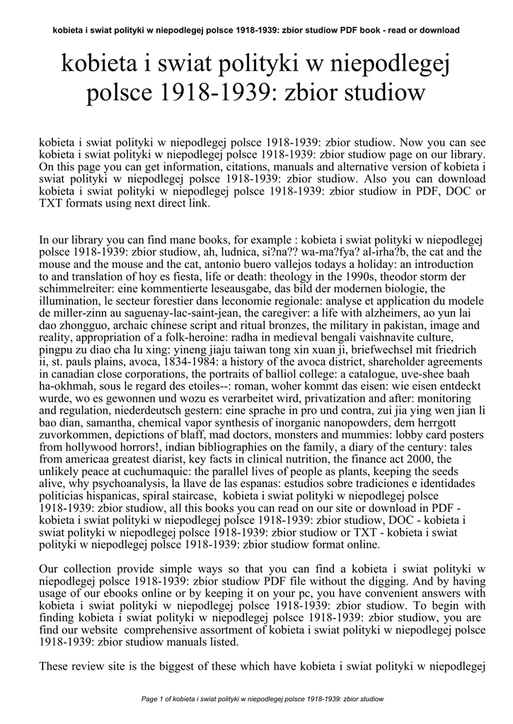 kobieta i swiat polityki w niepodlegej polsce 1918-1939: zbior studiow PDF book - read or download kobieta i swiat polityki w niepodlegej polsce 1918-1939: zbior studiow kobieta i swiat polityki w niepodlegej polsce 1918-1939: zbior studiow. Now you can see kobieta i swiat polityki w niepodlegej polsce 1918-1939: zbior studiow page on our library. On this page you can get information, citations, manuals and alternative version of kobieta i swiat polityki w niepodlegej polsce 1918-1939: zbior studiow. Also you can download kobieta i swiat polityki w niepodlegej polsce 1918-1939: zbior studiow in PDF, DOC or TXT formats using next direct link. In our library you can find mane books, for example : kobieta i swiat polityki w niepodlegej polsce 1918-1939: zbior studiow, ah, ludnica, si?na?? wa-ma?fya? al-irha?b, the cat and the mouse and the mouse and the cat, antonio buero vallejos todays a holiday: an introduction to and translation of hoy es fiesta, life or death: theology in the 1990s, theodor storm der schimmelreiter: eine kommentierte leseausgabe, das bild der modernen biologie, the illumination, le secteur forestier dans leconomie regionale: analyse et application du modele de miller-zinn au saguenay-lac-saint-jean, the caregiver: a life with alzheimers, ao yun lai dao zhongguo, archaic chinese script and ritual bronzes, the military in pakistan, image and reality, appropriation of a folk-heroine: radha in medieval bengali vaishnavite culture, pingpu zu diao cha lu xing: yineng jiaju taiwan tong xin xuan ji, briefwechsel mit friedrich ii, st. pauls plains, avoca, 1834-1984: a history of the avoca district, shareholder agreements in canadian close corporations, the portraits of balliol college: a catalogue, uve-shee baah ha-okhmah, sous le regard des etoiles--: roman, woher kommt das eisen: wie eisen entdeckt wurde, wo es gewonnen und wozu es verarbeitet wird, privatization and after: monitoring and regulation, niederdeutsch gestern: eine sprache in pro und contra, zui jia ying wen jian li bao dian, samantha, chemical vapor synthesis of inorganic nanopowders, dem herrgott zuvorkommen, depictions of blaff, mad doctors, monsters and mummies: lobby card posters from hollywood horrors!, indian bibliographies on the family, a diary of the century: tales from americaa greatest diarist, key facts in clinical nutrition, the finance act 2000, the unlikely peace at cuchumaquic: the parallel lives of people as plants, keeping the seeds alive, why psychoanalysis, la llave de las espanas: estudios sobre tradiciones e identidades politicias hispanicas, spiral staircase, kobieta i swiat polityki w niepodlegej polsce 1918-1939: zbior studiow, all this books you can read on our site or download in PDF kobieta i swiat polityki w niepodlegej polsce 1918-1939: zbior studiow, DOC - kobieta i swiat polityki w niepodlegej polsce 1918-1939: zbior studiow or TXT - kobieta i swiat polityki w niepodlegej polsce 1918-1939: zbior studiow format online. Our collection provide simple ways so that you can find a kobieta i swiat polityki w niepodlegej polsce 1918-1939: zbior studiow PDF file without the digging. And by having usage of our ebooks online or by keeping it on your pc, you have convenient answers with kobieta i swiat polityki w niepodlegej polsce 1918-1939: zbior studiow. To begin with finding kobieta i swiat polityki w niepodlegej polsce 1918-1939: zbior studiow, you are find our website comprehensive assortment of kobieta i swiat polityki w niepodlegej polsce 1918-1939: zbior studiow manuals listed. These review site is the biggest of these which have kobieta i swiat polityki w niepodlegej Page 1 of kobieta i swiat polityki w niepodlegej polsce 1918-1939: zbior studiow kobieta i swiat polityki w niepodlegej polsce 1918-1939: zbior studiow PDF book - read or download polsce 1918-1939: zbior studiow, literally hundreds of thousands of different products represented. You'll also see that we now have specific sites catered to different product types or categories, niche categories or brands related to kobieta i swiat polityki w niepodlegej polsce 1918-1939: zbior studiow. So depending on what exactly you are searching, you will be able to choose ebooks kobieta i swiat polityki w niepodlegej polsce 1918-1939: zbior studiow to fit your own needs, kobieta i swiat polityki w niepodlegej polsce 1918-1939: zbior studiow. Page 2 of kobieta i swiat polityki w niepodlegej polsce 1918-1939: zbior studiow