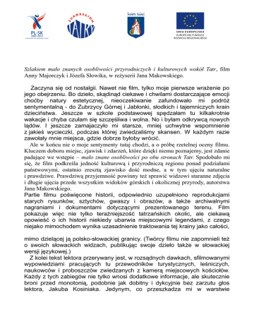Szlakiem mało znanych osobliwości przyrodniczych i kulturowych wokół Tatr, film Anny Majorczyk i Józefa Słowika, w reżyserii Jana Makowskiego. Zaczyna się od nostalgii. Nawet nie film, tylko moje pierwsze wrażenie po jego obejrzeniu. Bo dzieło, skądinąd ciekawe i chwilami dostarczające emocji choćby natury estetycznej, nieoczekiwanie zafundowało mi podróż sentymentalną - do Zubrzycy Górnej i Jabłonki, słodkich i tajemniczych krain dzieciństwa. Jeszcze w szkole podstawowej spędzałam tu kilkakrotnie wakacje i chyba czułam się szczęśliwa i wolna. No i byłam odkrywcą nowych lądów. I jeszcze zamajaczyło mi starsze, mniej uchwytne wspomnienie z jakieś wycieczki, podczas której zwiedzaliśmy skansen. W każdym razie zawołały mnie miejsca, gdzie dobrze byłoby wrócić. Ale w końcu nie o moje sentymenty tutaj chodzi, a o próbę rzetelnej oceny filmu. Kluczem doboru miejsc, zjawisk i zdarzeń, które dzięki niemu poznajemy, jest zdanie padające we wstępie – mało znane osobliwości po obu stronach Tatr. Spodobało mi się, że film podkreśla jedność kulturową i przyrodniczą regionu ponad podziałami państwowymi, ostatnio zresztą zjawisko dość modne, a w tym ujęciu naturalne i prawdziwe. Prawdziwą przyjemność powinny też sprawić widzowi staranne zdjęcia i długie ujęcia przede wszystkim widoków górskich i okolicznej przyrody, autorstwa Jana Makowskiego. Partie filmu poświęcone historii, odpowiednio uzupełniono reprodukcjami starych rysunków, sztychów, gwaszy i obrazów, a także archiwalnymi nagraniami i dokumentami dotyczącymi prezentowanego terenu. Film pokazuje więc nie tylko teraźniejszość tatrzańskich okolic, ale ciekawą opowieść o ich historii niekiedy ubarwia miejscowymi legendami, z czego niejako mimochodem wynika uzasadnienie traktowania tej krainy jako całości, mimo dzielącej ją polsko-słowackiej granicy. (Twórcy filmu nie zapomnieli też o swoich słowackich widzach, publikując swoje dzieło także w słowackiej wersji językowej.) Z kolei tekst lektora przerywany jest, w rozsądnych dawkach, sfilmowanymi wypowiedziami pracujących tu przewodników turystycznych, leśniczych, naukowców i proboszczów zwiedzanych z kamerą miejscowych kościołów. Każdy z tych zabiegów nie tylko wnosi dodatkowe informacje, ale skutecznie broni przed monotonią, podobnie jak dobitny i dykcyjnie bez zarzutu głos lektora, Jakuba Kosiniaka. Jedynym, co przeszkadza mi w warstwie dźwiękowej, to nieco drażniąca „muzyka relaksacyjna” w tle, ale to oczywiście już kwestia moich prywatnych upodobań. Kiedy filmowa opowieść skupia się na obiektach natury, jednocześnie otrzymujemy łatwo przyswajalne tłumaczenie przebiegu i znaczenia zjawisk przyrodniczych. Natomiast w prezentacji zabytkowych dzieł rąk człowieka wzrusza dbałość o wydobycie i podkreślenie odniesień lokalnych w sztuce, przede wszystkim sakralnej. Pojawiają się wiec tatrzańskie i pienińskie krajobrazy w tle scen religijnych na obrazach czy freskach w prześlicznych kościółkach św. Anny w Nowym Targu czy św. Elżbiety Węgierskiej w Trybszu. Z perspektywy czasu naprawdę poruszająca jest ta lokalna pieczęć nadana przez dawnych twórców i ich zleceniodawców uniwersalnym przedstawieniom biblijnych historii. Mimo zdecydowanie pozytywnego odbioru filmowego dzieła, nie mogę przemilczeć pomyłek i usterek, których nie ustrzegli się jego twórcy, choć obecność tych „wpadek” i ich wychwycenie przypomina grę na spostrzegawczość dla oka i ucha uważnego odbiorcy. W napisach końcowych poszczególnych części filmu kilkakrotnie pojawia się oryginalne słówko „podzieńkowania”, brak też zdecydowania co do wyboru formy „Bór na Czerwonym” czy na „Czerwonem”. Tu zdezorientowany wydaje się zresztą także lektor, tak przecież na ogół staranny. Ja zresztą opowiadam się tu przy drugiej wersji, „na Czerwonem”. Zdumiał mnie też fenomen strzechy wykonanej z gontów, choć wszelkie źródła podają, że strzecha to dach ze słomy bądź trzciny. Dziwna to pomyłka, skoro inne, nawet bardziej specjalistyczne terminy zdają się być używane w filmie zgodnie z ich znaczeniem. Niestety, okulała też fleksja, może autorom tekstu, a może lektorowi. W każdym razie, w historii miejscowości Orawka, nieprzyjemnie zabrzmiało mi w uszach zdanie oznajmiające, że „księdzu Janu Szczechowiczowi udaje się kupić(...)”. Zdecydowanie wykluczona jest taka forma celownika imienia Jan. Na koniec zostawiłam sobie usterki przede wszystkim zabawne. Pierwsza, w sekwencji filmu w skansenie w Zubrzycy Górnej, pokazuje nam scenę kolędowania, podczas której zza kadru słyszymy inną kolędę, niż wskazuje na tu ruch warg śpiewających. Ale najzabawniejsze i w jakimś sensie uroczy jest fragment opowieści o kasztelu Spaliżowiec w Liptowie poświęcony ekspozycji trofeów myśliwskich. Wśród nich tekst czytany przez lektora wymienia „okazałą niedźwiedzia skórę”, a w tym czasie kamera na długo zatrzymuje się na wiszącej na ścianie skórze misia... z kopytkami i rogami, całkiem, jak u poczciwej, choć rzeczywiście brunatnej, krowy. Może był to żubr, zaś szczątków żadnego niedźwiedzia jednak film nam, na szczęście, nie prezentuje Filmowe dzieło Jana Makowskiego, Anny Majorczyk i Józefa Słowika zdecydowanie poszerza wiadomości widza, sytuuje miejsca i ludzi w czasie i przestrzeni i, kogo może, wzywa do podróży. Ja w każdym razie zyskałam na prywatnej mapie nowe punkty, które chcę i muszę odwiedzić, stare, które sobie przypomniałam i inne, na nowo odkrywane w ostatnich latach, jak Nowy Targ, które mają dla mnie wciąż mnóstwo tajemnic do rozwikłania. Na długo zostaną mi pod powiekami te filmowe krajobrazy, zieleń przetykana skałami i wodami, chaty, dwory i kościoły. Mimo krytycznego, a może czasem złośliwego oka, jestem gotowa do drogi. Czego i innym widzom życzę