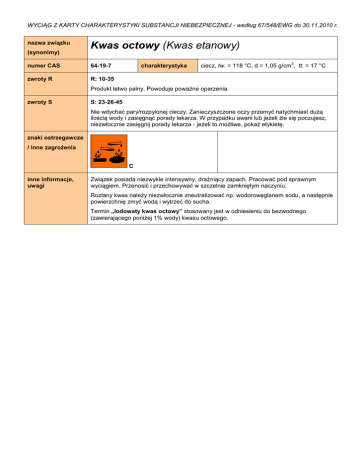WYCIĄG Z KARTY CHARAKTERYSTYKI SUBSTANCJI NIEBEZPIECZNEJ - według 67/548/EWG do 30.11.2010 r. nazwa związku (synonimy) Kwas octowy (Kwas etanowy) numer CAS 64-19-7 zwroty R R: 10-35 charakterystyka 3 ciecz, tw. = 118 °C, d = 1,05 g/cm , tt. = 17 °C Produkt łatwo palny. Powoduje poważne oparzenia. zwroty S S: 23-26-45 Nie wdychać pary/rozpylonej cieczy. Zanieczyszczone oczy przemyć natychmiast dużą ilością wody i zasięgnąć porady lekarza. W przypadku awarii lub jeżeli źle się poczujesz, niezwłocznie zasięgnij porady lekarza - jeżeli to możliwe, pokaż etykietę. znaki ostrzegawcze / inne zagrożenia C inne informacje, uwagi Związek posiada niezwykle intensywny, drażniący zapach. Pracować pod sprawnym wyciągiem. Przenosić i przechowywać w szczelnie zamkniętym naczyniu. Rozlany kwas należy niezwłocznie zneutralizować np. wodorowęglanem sodu, a następnie powierzchnię zmyć wodą i wytrzeć do sucha. Termin „lodowaty kwas octowy” stosowany jest w odniesieniu do bezwodnego (zawierającego poniżej 1% wody) kwasu octowego. WYCIĄG Z KARTY CHARAKTERYSTYKI SUBSTANCJI NIEBEZPIECZNEJ - zgodnie z GHS i CLP od 01.12.2010 r. nazwa związku (synonimy) numer CAS Kwas octowy (Kwas etanowy) 64-19-7 charakterystyka 3 ciecz, tw. = 118 °C, d = 1,05 g/cm , tt. = 17 °C o temp. zapłonu = 39 C, o prężność par przy 20 C = 15,4 hPa zwroty H H226 Łatwopalna ciecz i pary. H314 Powoduje poważne oparzenia skóry oraz uszkodzenia oczu. zwroty P P280 Stosować rękawice ochronne/ odzież ochronną/ ochronę oczu /ochronę twarzy. P301+P330+P331 W PRZYPADKU POŁKNIĘCIA: wypłukać usta. NIE wywoływać wymiotów. P307+P310 W przypadku narażenia: Natychmiast skontaktować się z OŚRODKIEM ZATRUĆ lub z lekarzem. P305+P351+P338 W PRZYPADKU DOSTANIA SIĘ DO OCZU: Ostrożnie płukać wodą przez kilka minut. Wyjąć soczewki kontaktowe, jeżeli są i można je łatwo usunąć. Nadal płukać. piktogramy i hasło ostrzegawcze Działanie żrące na skórę. (Kat. 1A) / inne zagrożenia NIEBEZBIECZEŃSTWO! inne informacje, uwagi Związek posiada niezwykle intensywny, drażniący zapach. Pracować pod sprawnym wyciągiem. Przenosić i przechowywać w szczelnie zamkniętym naczyniu. Rozlany kwas należy niezwłocznie zneutralizować np. wodorowęglanem sodu, a następnie powierzchnię zmyć wodą i wytrzeć do sucha. Termin „lodowaty kwas octowy” stosowany jest w odniesieniu do bezwodnego (zawierającego poniżej 1% wody) kwasu octowego. Opracowała: Dolores Stokłosa