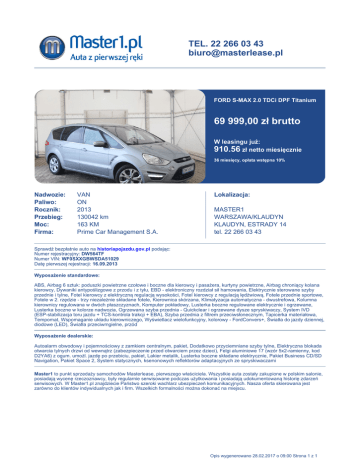 TEL. 22 266 03 43 [email protected] FORD S-MAX 2.0 TDCi DPF Titanium 69 999,00 zł brutto W leasingu już: 910.56 zł netto miesięcznie 36 miesięcy, opłata wstępna 10% Nadwozie: Paliwo: Rocznik: Przebieg: Moc: Firma: VAN ON 2013 130042 km 163 KM Prime Car Management S.A. Lokalizacja: MASTER1 WARSZAWA/KLAUDYN KLAUDYN, ESTRADY 14 tel. 22 266 03 43 Sprawdź bezpłatnie auto na historiapojazdu.gov.pl podając: Numer rejestracyjny: DW564TF Numer VIN: WF0SXXGBWSDA51029 Datę pierwszej rejestracji: 16.09.2013 Wyposażenie standardowe: ABS, Airbag 6 sztuk: poduszki powietrzne czołowe i boczne dla kierowcy i pasażera, kurtyny powietrzne, Airbag chroniący kolana kierowcy, Dywaniki antypoślizgowe z przodu i z tyłu, EBD - elektroniczny rozdział sił hamowania, Elektrycznie sterowane szyby przednie i tylne, Fotel kierowcy z elektryczną regulacją wysokości, Fotel kierowcy z regulacją lędźwiową, Fotele przednie sportowe, Fotele w 2. rzędzie - trzy niezależnie składane fotele, Kierownica skórzana, Klimatyzacja automatyczna - dwustrefowa, Kolumna kierownicy regulowana w dwóch płaszczyznach, Komputer pokładowy, Lusterka boczne regulowane elektrycznie i ogrzewane, Lusterka boczne w kolorze nadwozia, Ogrzewana szyba przednia - Quickclear i ogrzewane dysze spryskiwaczy, System IVD (ESP-stabilizacja toru jazdu + TCS-kontrola trakcji + EBA), Szyba przednia z filtrem przeciwsłonecznym, Tapicerka materiałowa, Tempomat, Wspomaganie układu kierowniczego, Wyświetlacz wielofunkcyjny, kolorowy - FordConvers+, Światła do jazdy dziennej, diodowe (LED), Światła przeciwmgielne, przód Wyposażenie dealerskie: Autoalarm obwodowy i pojemnościowy z zamkiem centralnym, pakiet, Dodatkowo przyciemniane szyby tylne, Elektryczna blokada otwarcia tylnych drzwi od wewnątrz (zabezpieczenie przed otwarciem przez dzieci), Felgi aluminiowe 17 (wzór 5x2-ramienny, kod D2YA6) z ogum. umożl. jazdę po przebiciu, pakiet, Lakier metalik, Lusterka boczne składane elektrycznie, Pakiet Business CD/SD Navigation, Pakiet Space 2, System statycznych, ksenonowych reflektorów adaptacyjnych ze spryskiwaczami Master1 to punkt sprzedaży samochodów Masterlease, pierwszego właściciela. Wszystkie auta zostały zakupione w polskim salonie, posiadają wycenę rzeczoznawcy, były regularnie serwisowane podczas użytkowania i posiadają udokumentowaną historię zdarzeń serwisowych. W Master1.pl znajdziecie Państwo szeroki wachlarz ubezpieczeń komunikacyjnych. Nasza oferta skierowana jest zarówno do klientów indywidualnych jak i firm. Wszelkich formalności można dokonać na miejscu. Opis wygenerowano 28.02.2017 o 09:00 Strona 1 z 1