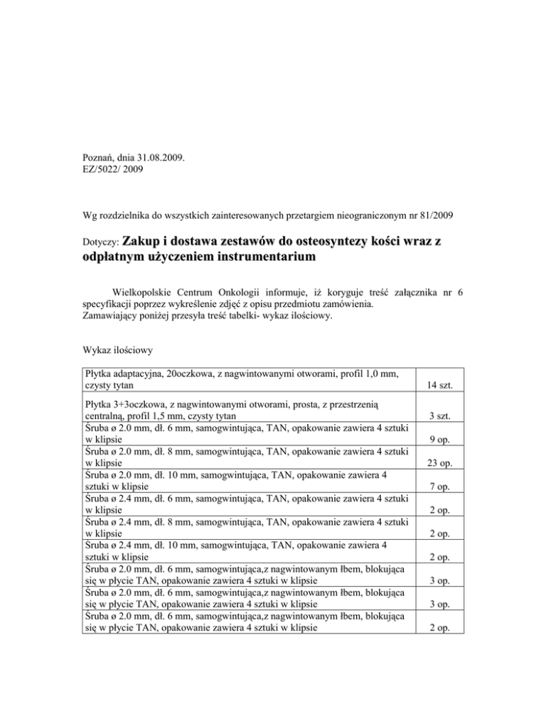 Poznań, dnia 31.08.2009. EZ/5022/ 2009 Wg rozdzielnika do wszystkich zainteresowanych przetargiem nieograniczonym nr 81/2009 Dotyczy: Zakup i dostawa zestawów do osteosyntezy kości wraz z odpłatnym uŜyczeniem instrumentarium Wielkopolskie Centrum Onkologii informuje, iŜ koryguje treść załącznika nr 6 specyfikacji poprzez wykreślenie zdjęć z opisu przedmiotu zamówienia. Zamawiający poniŜej przesyła treść tabelki- wykaz ilościowy. Wykaz ilościowy Płytka adaptacyjna, 20oczkowa, z nagwintowanymi otworami, profil 1,0 mm, czysty tytan Płytka 3+3oczkowa, z nagwintowanymi otworami, prosta, z przestrzenią centralną, profil 1,5 mm, czysty tytan Śruba ø 2.0 mm, dł. 6 mm, samogwintująca, TAN, opakowanie zawiera 4 sztuki w klipsie Śruba ø 2.0 mm, dł. 8 mm, samogwintująca, TAN, opakowanie zawiera 4 sztuki w klipsie Śruba ø 2.0 mm, dł. 10 mm, samogwintująca, TAN, opakowanie zawiera 4 sztuki w klipsie Śruba ø 2.4 mm, dł. 6 mm, samogwintująca, TAN, opakowanie zawiera 4 sztuki w klipsie Śruba ø 2.4 mm, dł. 8 mm, samogwintująca, TAN, opakowanie zawiera 4 sztuki w klipsie Śruba ø 2.4 mm, dł. 10 mm, samogwintująca, TAN, opakowanie zawiera 4 sztuki w klipsie Śruba ø 2.0 mm, dł. 6 mm, samogwintująca,z nagwintowanym łbem, blokująca się w płycie TAN, opakowanie zawiera 4 sztuki w klipsie Śruba ø 2.0 mm, dł. 6 mm, samogwintująca,z nagwintowanym łbem, blokująca się w płycie TAN, opakowanie zawiera 4 sztuki w klipsie Śruba ø 2.0 mm, dł. 6 mm, samogwintująca,z nagwintowanym łbem, blokująca się w płycie TAN, opakowanie zawiera 4 sztuki w klipsie 14 szt. 3 szt. 9 op. 23 op. 7 op. 2 op. 2 op. 2 op. 3 op. 3 op. 2 op. Śruba samowiercąca ø 1.5 mm, dł. 5 mm, TAN, opakowanie zawiera 4 sztuki w klipsie, profil płyty wraz ze śrubą 0,5 mm 2 op. Płytka adaptacyjna 1.5, niskoprofilowa 0,4 mm, 7oczkowa 2 szt. Z powaŜaniem, z-ca dyrektora ds. ekonomiczno- eksploatacyjnych inŜ. Małgorzata Kołodziej- Sarna