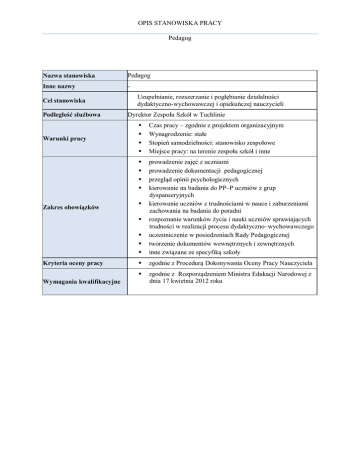 OPIS STANOWISKA PRACY Pedagog Nazwa stanowiska Pedagog Inne nazwy - Cel stanowiska Podległość służbowa Warunki pracy Zakres obowiązków Uzupełnianie, rozszerzanie i pogłębianie działalności dydaktyczno-wychowawczej i opiekuńczej nauczycieli Dyrektor Zespołu Szkół w Tuchlinie     Czas pracy – zgodnie z projektem organizacyjnym Wynagrodzenie: stałe Stopień samodzielności: stanowisko zespołowe Miejsce pracy: na terenie zespołu szkół i inne        prowadzenie zajęć z uczniami prowadzenie dokumentacji pedagogicznej przegląd opinii psychologicznych kierowanie na badania do PP–P uczniów z grup dyspanseryjnych kierowanie uczniów z trudnościami w nauce i zaburzeniami zachowania na badania do poradni rozpoznanie warunków życia i nauki uczniów sprawiających trudności w realizacji procesu dydaktyczno–wychowawczego uczestniczenie w posiedzeniach Rady Pedagogicznej tworzenie dokumentów wewnętrznych i zewnętrznych inne związane ze specyfiką szkoły  zgodnie z Procedurą Dokonywania Oceny Pracy Nauczyciela  zgodnie z Rozporządzeniem Ministra Edukacji Narodowej z dnia 17 kwietnia 2012 roku   Kryteria oceny pracy Wymagania kwalifikacyjne