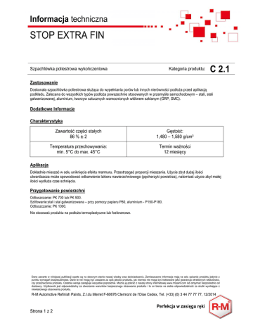 Informacja techniczna STOP EXTRA FIN Szpachlówka poliestrowa wykończeniowa Kategoria produktu: C 2.1 Zastosowanie Doskonała szpachlówka poliestrowa służąca do wypełniania porów lub innych nierówności podłoża przed aplikacją podkładu. Zalecana do wszystkich typów podłoża powszechnie stosowanych w przemyśle samochodowym – stali, stali galwanizowanej, aluminium, tworzyw sztucznych wzmocnionych włóknem szklanym (GRP, SMC). Dodatkowe Informacje Charakterystyka Zawartość części stałych 86 % ± 2 Gęstość: 1,480 – 1,580 g/cm³ Temperatura przechowywania: min. 5°C do max. 45°C Termin ważności 12 miesięcy Aplikacja Dokładnie mieszać w celu uniknięcia efektu marmuru. Przestrzegać proporcji mieszania. Użycie zbyt dużej ilości utwardzacza może spowodować odbarwienie lakieru nawierzchniowego (pęcherzyki powietrza), natomiast użycie zbyt małej ilości wydłuża czas schnięcia. Przygotowanie powierzchni Odtłuszczanie: PK 700 lub PK 900. Szlifowanie:stal i stal galwanizowana – przy pomocy papieru P80, aluminium - P150-P180. Odtłuszczanie: PK 1000. Nie stosować produktu na podłoża termoplastyczne lub fosforanowe. Dane zawarte w niniejszej publikacji oparte są na obecnym stanie naszej wiedzy oraz doświadczeniu. Zamieszczone informacje mają na celu opisanie produktu jedynie z punktu wymagań bezpieczeństwa. Dane te nie mogą być uważane za opis jakości produktu, jak również nie mogą być traktowane jako gwarancja określonych właściwości, czy przeznaczenia produktu. Ostatnia wersja zastępuje wszystkie poprzednie. Można ją pobrać z naszej strony internetowej www.rmpaint.com lub otrzymać bezpośrednio od dostawcy. Użytkownik jest odpowiedzialny za stworzenie warunków bezpiecznego stosowania produktu i to on bierze na siebie odpowiedzialność za skutki wynikające z niewłaściwego stosowania produktu. R-M Automotive Refinish Paints, Z.I.du Merret F-60676 Clermont de l'Oise Cedex, Tel. (+33) (0) 3 44 77 77 77, 12/2014 Strona 1 z 2 Perfekcja w zasięgu ręki Informacja techniczna STOP EXTRA FIN Temperatura STOP EXTRA FIN < 12°C 12 – 25°C > 25°C 100 g 100 g 100 g 3g 2,5 g 1,5 g Utwardzacz Czas życia: 5 minut w 20°C Liczba warstw: 2 Schnięcie 20°C 20 min. Schnięcie 60°C 10 min. Schnięcie trwa dłużej, gdy produkt zostanie zaaplikowany na chłodną powierzchnię. (fale krótkie) (fale średnie) 4 min. w 50% 6 min. Na sucho: P80, P150, P240 Uwaga: nie szlifować na mokro! Prace wykończeniowe Instrukcja bezpieczeństwa 2004/42/IIB(b)(250)180: Dopuszczalna zawartość LZO (kategoria produktu: IIB, b) w mieszance gotowej do użycia wynosi 250 g/l. Zawartość LZO w produkcie - 180 g/l Produkt może zawierać części mniejsze od < 0.1 µm. Produkt do użytku profesjonalnego. Przy pracy z produktem należy stosować się do ogólnych zasad bezpieczeństwa oraz używać niezbędnych środków ochrony indywidualnej odpowiednich do występującego zagrożenia. Strona 2 z 2 Perfekcja w zasięgu ręki