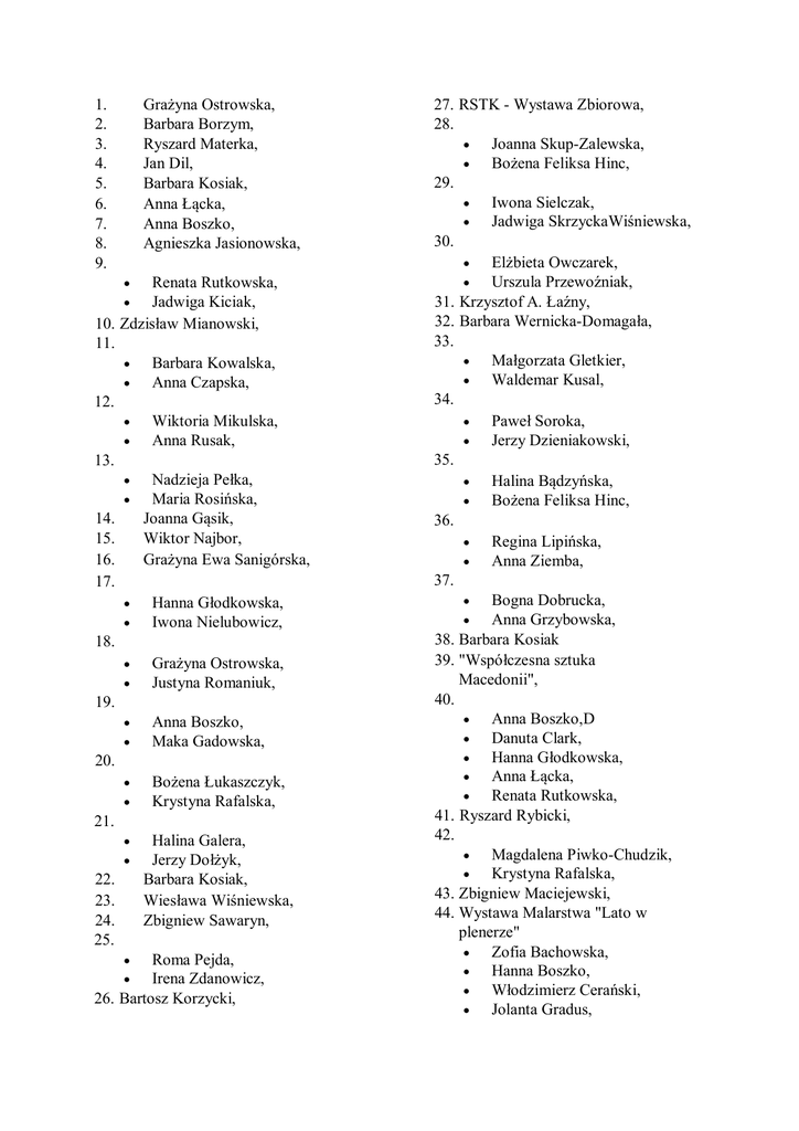 1. 2. 3. 4. 5. 6. 7. 8. 9. Grażyna Ostrowska, Barbara Borzym, Ryszard Materka, Jan Dil, Barbara Kosiak, Anna Łącka, Anna Boszko, Agnieszka Jasionowska, Renata Rutkowska, Jadwiga Kiciak, 10. Zdzisław Mianowski, 11. Barbara Kowalska, Anna Czapska, 12. Wiktoria Mikulska, Anna Rusak, 13. Nadzieja Pełka, Maria Rosińska, 14. Joanna Gąsik, 15. Wiktor Najbor, 16. Grażyna Ewa Sanigórska, 17. Hanna Głodkowska, Iwona Nielubowicz, 18. Grażyna Ostrowska, Justyna Romaniuk, 19. Anna Boszko, Maka Gadowska, 20. Bożena Łukaszczyk, Krystyna Rafalska, 21. Halina Galera, Jerzy Dołżyk, 22. Barbara Kosiak, 23. Wiesława Wiśniewska, 24. Zbigniew Sawaryn, 25. Roma Pejda, Irena Zdanowicz, 26. Bartosz Korzycki, 27. RSTK - Wystawa Zbiorowa, 28. Joanna Skup-Zalewska, Bożena Feliksa Hinc, 29. Iwona Sielczak, Jadwiga SkrzyckaWiśniewska, 30. Elżbieta Owczarek, Urszula Przewoźniak, 31. Krzysztof A. Łaźny, 32. Barbara Wernicka-Domagała, 33. Małgorzata Gletkier, Waldemar Kusal, 34. Paweł Soroka, Jerzy Dzieniakowski, 35. Halina Bądzyńska, Bożena Feliksa Hinc, 36. Regina Lipińska, Anna Ziemba, 37. Bogna Dobrucka, Anna Grzybowska, 38. Barbara Kosiak 39. "Współczesna sztuka Macedonii", 40. Anna Boszko,D Danuta Clark, Hanna Głodkowska, Anna Łącka, Renata Rutkowska, 41. Ryszard Rybicki, 42. Magdalena Piwko-Chudzik, Krystyna Rafalska, 43. Zbigniew Maciejewski, 44. Wystawa Malarstwa "Lato w plenerze" Zofia Bachowska, Hanna Boszko, Włodzimierz Cerański, Jolanta Gradus, Anna Grzybowska, Anita Kuczerowska, Zbigniew Maciejewski, Wiktoria Mikulska, Jadwiga Wiśniewska, Tadeusz Wolski, 45. Fotografia – Wojsko Polskie na misji 46. Bożena Tor, Genowefa "Gena" Świdnik, 47. Ireneusz Betlewicz, 48. Ryszard Materka 49. Elżbieta Kwiatkowska Kamila Kuna Jolanta Noga 50. Halina Bądzyńska, Barbara Borzym, Anna Boszko, Jan Dil, Jerzy Dołżyk, Małgorzata Gletkier, Anna Grzybowska, Bożenna Hinc, Barbara Kosiak, Kamila Kuna, Waldemar Kusal, Elżbieta Kwiatkowska, Regina Lipińska, Anna Łącka, Bożena Łukaszczyk, Zbigniew Maciejewski, Ryszard Materka, Wiktoria Mikulska, Iwona Nielubowicz, Jolanta Noga, Elżbieta Owczarek, Magdalena PiwkoChudzik, Krystyna Rafalska, Iwona Sielczak, Jadwiga SkrzyckaWiśniewska, Anna Ziemba. 51. Artur Stuchała 52. Jan Smykal 53. Wiktoria Mikulska, Zbigniew Maciejewski 54. Artur Stuchała 55. Agata Bajtyngier 56. Justyna Romaniuk, Magdalena Piwko-Chudzik 57. Stanisław Jerzy Dołżyk, Zbigniew Maciejewski 58. Maria "Malina" Najdek 59. Janina Marjankowska 60. Dwudziestu jeden artystów, członków Związku Polskich Artystów Malarzy i Grafików Jadwiga Antczak Grzegorz Bartoszek Krystyna Bileńki Jolanta Bukowska Iwona Fonder Zdzisław Kędzierski Joanna Kowalska Kris Rudolf Joanna Krzepina Małgorzata Łącka Maria Macięga Sewer Niedźwiecki Danuta Popławska Hanna Rezunow - Modrzejewska Włodzimierz Starościak Marek Strójwąs Michał Sulich Krystyna Szedny Szymon Węgorzewski Maria Maryla Wierzbowska Maja Wolf 61. Marii Maliny Wierzbowskiej