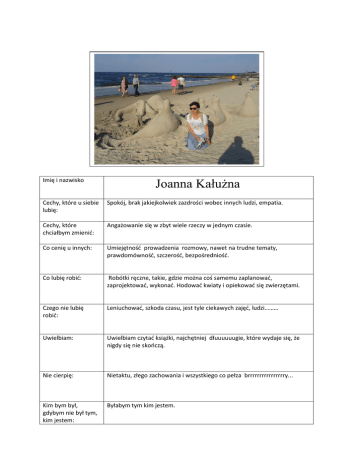 Imię i nazwisko Joanna Kałużna Cechy, które u siebie lubię: Spokój, brak jakiejkolwiek zazdrości wobec innych ludzi, empatia. Cechy, które chciałbym zmienić: Angażowanie się w zbyt wiele rzeczy w jednym czasie. Co cenię u innych: Umiejętność prowadzenia rozmowy, nawet na trudne tematy, prawdomówność, szczerość, bezpośredniość. Co lubię robić: Robótki ręczne, takie, gdzie można coś samemu zaplanować, zaprojektować, wykonać. Hodować kwiaty i opiekować się zwierzętami. Czego nie lubię robić: Leniuchować, szkoda czasu, jest tyle ciekawych zajęć, ludzi……… Uwielbiam: Uwielbiam czytać książki, najchętniej dłuuuuuugie, które wydaje się, że nigdy się nie skończą. Nie cierpię: Nietaktu, złego zachowania i wszystkiego co pełza brrrrrrrrrrrrrrrry... Kim bym był, gdybym nie był tym, kim jestem: Byłabym tym kim jestem.