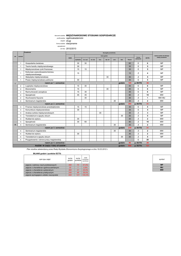 kierunek studiów: profil studiów: stopień: forma studiów: MIĘDZYNARODOWE STOSUNKI GOSPODARCZE ogólnoakademicki drugi stacjonarne specjalności: od roku: 2012/2013 Przedmiot rok Szczegóły przedmiotu ilość godzin semestr wykładów ćw. aud. 30 1 Gospodarka światowa 30 1 Teorie handlu międzynarodowego 30 1 15 15 1 Międzynarodowe rynki finansowe Kulturowe uwarunkowania biznesu międzynarodowego Statystyka międzynarodowa 1 Prawo międzynarodowe publiczne 30 2 Logistyka międzynarodowa 15 2 Ekonometria 15 2 Rachunkowość zarządcza 15 2 Specjalność 45 2 Wychowanie fizyczne 2 Seminarium magisterskie 1 ćw. lab. kon. lab. Inf sem. 15 30 razem po 1. semestrze : I godzin: 30 30 30 ECTS 60 E 6 30 E 5 MP 30 E 5 MP 15 Z 4 MP 30 Z 5 MP 30 E 5 MP 195 p. ECTS: 30 45 E 6 45 E 6 MP 45 E 6 MP Finanse międzynarodowe przedsiębiorstw 15 Koniunktura międzynarodowa 30 3 Analiza rynków międzynarodowych 3 Translatorium w języku obcym 3 Wykład do wyboru 30 3 Specjalność 30 3 Seminarium magisterskie 90 Z 10 MW Z 1 MW MU MW 15 30 30 60 30 razem po 3. semestrze : 4 Seminarium magisterskie 4 Wykład do wyboru 4 Translatorium w języku obcym 4 Przygotowanie i obrona pracy magisterskiej MP 30 godzin: 3 MP 45 30 3 Razem 30 razem po 2. semestrze : II lekt. nazwa modułu do którego należy przedmiot Forma zaliczenia KOD godzin: 30 30 30 razem po 4. semestrze : RAZEM W CIĄGU TOKU STUDIÓW : 30 Z 2 285 p. ECTS: 31 30 E 5 30 E 4 MP 30 Z 3 MP MP 30 Z 5 MP 30 Z 2 MW 90 Z 10 MW 30 Z 2 MW 270 p. ECTS: 31 30 Z 2 MW 30 Z 2 MW Z 5 MP E 20 30 godzin: 90 p. ECTS: 29 godzin: 840 p. ECTS: 121 Plan studiów zatwierdzony przez Radę Wydziału Ekonomiczno-Socjologicznego w dniu 19.03.2012 r. BILANS godzin i punktów ECTS: opis typu zajęć zajęcia z zakresu nauk podstawowych: zajęcia o charakterze ogólnouczelnianym: zajęcia o charakterze wybieralnym: zajecia o charakterze praktycznym: zajęcia wymagajace udziału nauczyciela suma godzin suma punktów udział procentowy (punktowy) 480 30 360 240 840 70 1 31 46 121 57,9% 0,8% 25,6% 38,0% 100,0% symbol MP MU MW