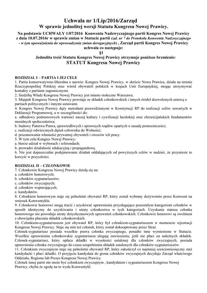 Uchwała nr 1/Lip/2016/Zarząd W sprawie jednolitej wersji Statutu Kongresu Nowej Prawicy. Na podstawie UCHWAŁY 1/07/2016 Konwentu Nadzwyczajnego partii Kongres Nowej Prawicy z dnia 10.07.2016r w sprawie zmian w Statucie partii (zał. nr 7 do Protokołu Konwentu Nadzwyczajnego - w tym upoważnienia do wprowadzenia zmian derogacyjnych) , Zarząd partii Kongres Nowej Prawicy uchwala co następuje: §1 Jednolita treść Statutu Kongres Nowej Prawicy otrzymuje poniższe brzmienie: STATUT Kongresu Nowej Prawicy ROZDZIAŁ I – PARTIA I JEJ CELE 1. Partia konserwatywno-liberalna o nazwie: Kongres Nowej Prawicy, w skrócie Nowa Prawica, działa na terenie Rzeczypospolitej Polskiej oraz wśród obywateli polskich w krajach Unii Europejskiej, mogąc utrzymywać kontakty z partiami zagranicznymi. 2. Siedzibą Władz Kongresu Nowej Prawicy jest miasto stołeczne Warszawa. 3. Majątek Kongresu Nowej Prawicy powstaje ze składek członkowskich i innych źródeł dozwolonych ustawą o partiach politycznych i innymi ustawami. 4. Kongres Nowej Prawicy dąży metodami przewidzianymi w Konstytucji RP do realizacji celów zawartych w Deklaracji Programowej, a w szczególności do: a. odbudowy podstawowych wartości naszej kultury i cywilizacji łacińskiej oraz chrześcijańskich fundamentów moralnych społeczeństwa; b. budowy Państwa Prawa, sprawiedliwych i sprawnych rządów opartych o zasadę pomocniczości; c. realizacji odwiecznych dążeń człowieka do Wolności; d. poszanowania własności prywatnej obywateli i owoców ich pracy. 5. W tym celu Kongres Nowej Prawicy: a. bierze udział w wyborach i referendach; b. prowadzi działalność edukacyjną i propagandową. 6. Nie jest dopuszczalne podejmowanie działań oddalających od powyższych celów w nadziei, że przyniesie to korzyść w przyszłości. ROZDZIAŁ II – CZŁONKOWIE 7. Członkowie Kongresu Nowej Prawicy dzielą się na: a. członków honorowych; b. członków-sygnatariuszów; c. członków zwyczajnych; d. członków wspierających; e. kandydatów. 8. Członkiem honorowym staje się pełnoletni obywatel RP, który został wybrany dożywotnio przez Konwent na wniosek Konwentyklu. 9. Członkowie honorowi mogą tracić i uzyskiwać uprawnienia przysługujące pozostałym kategoriom członków w sposób identyczny do uzyskiwania i utraty członkostwa w tych kategoriach. Uzyskanie statusu członka honorowego nie powoduje utraty dotychczasowych uprawnień członkowskich. Członkowie honorowi są zwolnieni z obowiązku płacenia składek członkowskich. 10. Członkiem-sygnatariuszem jest obywatel RP, który był członkiem-sygnatariuszem w momencie rejestracji Kongresu Nowej Prawicy. Staje się nim też członek, który został dokooptowany przez Straż. Członek-sygnatariusz posiada wszelkie prawa członka zwyczajnego, ponadto inne wymienione w Statucie. Wszelkie uprawnienia członkowskie sygnatariusza ulegają zawieszeniu, jeśli nie płaci on należnych składek. Członek-sygnatariusz, który opłaca składki w wysokości ustalonej dla członków zwyczajnych, posiada uprawnienia członka zwyczajnego do czasu uzupełnienia składek ustalonych dla członków-sygnatariuszów. 11. Członkiem zwyczajnym staje się pełnoletni obywatel RP, który zakończył co najmniej sześciomiesięczny staż kandydacki i płaci składki. O przyjęciu kandydata do grona członków zwyczajnych decyduje Zarząd właściwego Oddziału, Regionu lub Prezes Kongresu Nowej Prawicy. Członek innej partii nie może być członkiem zwyczajnym , kandydatem i sygnatariuszem Kongresu Nowej Prawicy, chyba że zgodę na to wyda Konwentykl. 12. Członkiem zwyczajnym staje się także członek-sygnatariusz, który przedłożył Radzie Sygnatariuszów rezygnację ze swojej kategorii członkostwa – pod warunkiem uzupełnienia składek w wysokości ustalonej dla członków zwyczajnych. 13. Członkiem wspierającym staje się obywatel RP, który wypełnił deklarację członkowską i płaci należne składki. Członkowie wspierający nie posiadają praw wyborczych, ale posiadają wszelkie prawa wynikające ze sprawowanych funkcji. 14. Kandydatem staje się pełnoletni obywatel RP, który zadeklarował poparcie dla zasad i programu Kongresu Nowej Prawicy, wypełnił deklarację członkowską i opłacił należne składki. Kandydaci posiadają bierne prawo wyborcze oraz wszelkie prawa wynikające z pełnionych funkcji. Kandydatom nie przysługuje prawo udziału w głosowaniach na Konwentach. Kandydat nie może też zostać wybrany do Straży i Sądu Naczelnego. 15. Deklaracje członkowskie mogą przyjmować wyłącznie członkowie Zarządu Kongresu Nowej Prawicy, Zarządów Regionów i Zarządów Oddziałów. Wzory deklaracji oraz szczegółowe zasady ich przyjmowania określa Rada Główna. 16. Członkostwo ustaje: a. wskutek zgłoszenia Władzom partii bądź Zarządom odpowiednich Oddziałów wystąpienia na piśmie; b. wskutek wstąpienia do innej partii lub też przystąpienia do jej organizacji albo powołania bez zgody Konwentyklu; przepis ten nie dotyczy członków wspierających i honorowych; c. po upływie 6 miesięcy od zakończenia ostatniego okresu, za który wniesiono składkę (z zastrzeżeniem p.9); d. wskutek wykluczenia przez Straż. 17. Członek honorowy może zostać pozbawiony godności wyłącznie jednomyślną decyzją Straży na wniosek Konwentyklu lub Sądu Naczelnego. Rada Główna większością 2/3 głosów może zawiesić w prawach członkowskich dowolnego członka zwyczajnego, wspierającego lub kandydata Kongresu Nowej Prawicy z wyjątkiem członków Sądu Naczelnego, Centralnej Komisji Rewizyjnej, Straży i Prezesa Kongresu Nowej Prawicy – zawiadamiając o tym niezwłocznie Prezesa Sądu Naczelnego, który ma prawo unieważnić tę decyzję. Zawieszenie ustaje w ciągu miesiąca, Sąd Naczelny może ten okres przedłużyć do 3 miesięcy. 18. Wysokość składek ustala: a. dla członków zwyczajnych i kandydatów – Konwent; b. dla członkó