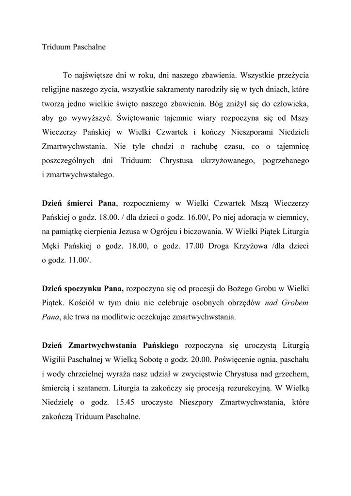 Triduum Paschalne To najświętsze dni w roku, dni naszego zbawienia. Wszystkie przeżycia religijne naszego życia, wszystkie sakramenty narodziły się w tych dniach, które tworzą jedno wielkie święto naszego zbawienia. Bóg zniżył się do człowieka, aby go wywyższyć. Świętowanie tajemnic wiary rozpoczyna się od Mszy Wieczerzy Pańskiej w Wielki Czwartek i kończy Nieszporami Niedzieli Zmartwychwstania. Nie tyle chodzi o rachubę czasu, co o tajemnicę poszczególnych dni Triduum: Chrystusa ukrzyżowanego, pogrzebanego i zmartwychwstałego. Dzień śmierci Pana, rozpoczniemy w Wielki Czwartek Mszą Wieczerzy Pańskiej o godz. 18.00. / dla dzieci o godz. 16.00/, Po niej adoracja w ciemnicy, na pamiątkę cierpienia Jezusa w Ogrójcu i biczowania. W Wielki Piątek Liturgia Męki Pańskiej o godz. 18.00, o godz. 17.00 Droga Krzyżowa /dla dzieci o godz. 11.00/. Dzień spoczynku Pana, rozpoczyna się od procesji do Bożego Grobu w Wielki Piątek. Kościół w tym dniu nie celebruje osobnych obrzędów nad Grobem Pana, ale trwa na modlitwie oczekując zmartwychwstania. Dzień Zmartwychwstania Pańskiego rozpoczyna się uroczystą Liturgią Wigilii Paschalnej w Wielką Sobotę o godz. 20.00. Poświęcenie ognia, paschału i wody chrzcielnej wyraża nasz udział w zwycięstwie Chrystusa nad grzechem, śmiercią i szatanem. Liturgia ta zakończy się procesją rezurekcyjną. W Wielką Niedzielę o godz. 15.45 uroczyste Nieszpory Zmartwychwstania, które zakończą Triduum Paschalne. Wielki Czwartek to dzień ustanowienia Eucharystii i sakramentu Kapłaństwa. Rano w katedrach biskupi odprawiają Mszę Krzyżma. Poświęca się wtedy oleje używane do sprawowania sakramentów/ chrztu, bierzmowania, kapłaństwa, namaszczenia chorych/, a kapłani odnawiają swoje kapłańskie przyrzeczenia. Wieczorem odprawia się Mszę Wieczerzy Pańskiej, która rozpoczyna Triduum Paschalne. Ta Eucharystia jest pamiątką Ostatniej Wieczerzy, podczas której Jezus przemienił chleb i wino w swoje Ciało i Krew, ofiarował je Ojcu, dał Apostołom do spożycia oraz nakazał im powtarzanie tego niezwykłego znaku. Na zakończenie wielkoczwartkowej Eucharystii, Ciało Chrystusa przenosi się do ciemnicy. Wieczorna adoracja Najświętszego Sakramentu jest wyrazem wdzięczności za Eucharystię, jest też czuwaniem w Ogrójcu z Chrystusem, zmagającym się z ludzkim lękiem przed bólem i śmiercią. Tabernakulum pozostaje puste i otwarte, gaśnie wieczna lampka. Wielki Piątek to dzień męki i śmierci naszego Zbawiciela. Chrześcijanie zachowują ścisły post. Tego dnia nie odprawia się Mszy świętej. W kościołach odbywają się nabożeństwa Drogi Krzyżowej, ale centralnym punktem jest Liturgia Męki Pańskiej. W centrum jest krzyż Chrystusa. Powinniśmy koncentrować się nie tyle na samym cierpieniu Chrystusa, ile na Jego miłości. Czcimy krzyż jako znak zwycięstwa nad śmiercią, grzechem, ciemnością. Wielkopiątkowa Liturgia zaczyna się nietypowo. Kapłani wychodzą w milczeniu do ołtarza. Po dojściu do stopni padają na twarz, w geście największego uniżenia przed tajemnicą, którą mamy rozważać. Wszyscy obecni w kościele klękają. Następuje liturgia słowa, której centralnym punktem jest opis Męki Pańskiej według świętego Jana. Po homilii odbywa się uroczysta, rozbudowana modlitwa powszechna. Druga część wielkopiątkowej liturgii to adoracja krzyża. Kapłan bierze zasłonięty krzyż, odsłania jego górną część i śpiewa: Oto drzewo krzyża, na którym zawisło zbawienie świata. Zgromadzenie odpowiada: Pójdźmy z pokłonem. Potem celebrans odsłania kolejną część krzyża, powtarzając te same słowa. Za trzecim razem ukazuje cały krzyż. Do krzyża podchodzą w procesji kapłani, służba liturgiczna i pozostali wierni. Po adoracji krzyża następuje Komunia święta. Rozdziela się ją z hostii konsekrowanych w Wielki Czwartek. Liturgię kończy przeniesienie Najświętszego Sakramentu do Bożego Grobu. Monstrancja przykryta jest białym welonem na pamiątkę całunu, w który owinięto ciało Jezusa. Przez ten wieczór i dzień następny będziemy Go adorowali w znaku Eucharystii. Krzyż pozostaje także wystawiony do adoracji. Wielka Sobota to dzień spoczynku Jezusa w grobie. Trwamy przy grobie Pańskim w modlitewnej zadumie, skupieniu. To czas oczekiwania na zmartwychwstanie. Tego dnia nie sprawuje się Eucharystii. W tym dniu jest zwyczaj święcenia pokarmów na stół wielkanocny. Wigilia Paschalna i Niedziela Zmartwychwstania. Wigilia Paschalna jest świętowaniem tajemnicy nowego życia, które przynosi zmartwychwstały Chrystus. Składa się z czterech części, z których każda odwołuje się do innego symbolu nowego życia- światła, słowa, wody i uczty. Liturgia rozpoczyna się przed kościołem od poświęcenia ognia oraz paschału- świecy symbolizującej Zmartwychwstałego. Paschał zapalony od poświęconego ognia wnosi się procesyjnie do ciemnego kościoła. Liturgia słowa jest bardzo rozbudowana. Może się składać, aż z 9 czytań, które ukazują historię zbawienia od początku świata, przez wyjście narodu wybranego z Egiptu, aż do śmierci i zmartwychwstania Syna Bożego. Przed Ewangelią rozbrzmiewa uroczysty śpiew Alleluja. Po homilii zaczyna się liturgia chrzcielna. Odśpiewana zostaje Litania do Wszystkich Świętych, następuje błogosławieństwo wody chrzcielnej, podczas którego paschał zanurza się w wodzie chrzcielnej. Z zapalonymi świecami wierni odnawiają przymierze z Bogiem, zawarte przez chrzest. Ostatnią częścią celebracji jest liturgia eucharystyczna, która kończy się uroczystą procesją rezurekcyjną. Kościół ogłasza całemu światu radosną wieść: Chrystus żyje, pokonał śmierć, naszą śmierć.