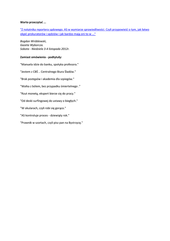 Warto przeczytać ... "Z notatnika reportera sądowego. AS w wymiarze sprawiedliwości. Czyli przypowieść o tym, jak łatwo okpić prokuratorów i sędziów i jak bardzo mają oni to w ..." Bogdan Wróblewski, Gazeta Wyborcza. Sobota - Niedziela 3-4 listopada 2012r. Zamiast omówienia - podtytuły: "Manuela idzie do banku, spotyka profesora." "Jestem z CBŚ .. Centralnego Biura Śladów." "Brak postępów i akademia dla szpiegów." "Walka z bólem, bez przypadku śmiertelnego ." "Rzut monetą, ekspert bierze się do pracy." "Od deski surfingowej do ustawy o biegłych." "W okularach, czyli robi się gorąco." "AS kontroluje proces - dziewiąty rok." "Prawnik w szortach, czyli pisz pan na Bystrzycę."