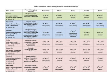 Punkty nieodpłatnej pomocy prawnej na terenie Powiatu Rzeszowskiego Adres punktu Błażowa Gimnazjum Publiczne ul. Plac Ks. Adolfa Kowala 2 Podmiot obsługujący punkt NPP adwokaci wskazani przez Okręgową Radę Adwokacką w Rzeszowie Poniedziałek 8 00 do 12 00 adwokat Środa Wtorek 8 00 do 12 00 adwokat 8 00 do 12 Piątek Czwartek 00 adwokat 8 00 do 12 00 adwokat 8 00 do 12 00 adwokat tel. 882 180 392 Boguchwała Miejskie Centrum Kultury Rynek 2, Boguchwała radcowie prawni wskazani przez Okręgową Izbę Radców Prawnych w Rzeszowie 14 00 do 18 00 radca prawny 10 00 do 14 00 radca prawny 14 00 do 18 00 radca prawny 10 00 do 14 00 radca prawny 14 00 do 18 00 radca prawny tel. 882 180 395 Rzeszów 1 Poradnia PsychologicznoPedagogiczna Nr 1, ul. Batorego 9 tel. 882 184 156 Dynów Urząd Gminy Dynów ul. ks. J. Ożoga 2, Dynów tel. 882 180 386 Głogów Młp. Dom Kultury, ul Kardynała Stefana Wyszyńskiego12 adwokaci wskazani przez Okręgową Radę Adwokacką w Rzeszowie i radcowie prawni wskazani przez Okręgową Izbę Radców Prawnych w Rzeszowie Fundacja Centrum Poradnictwa Prawnego „PRAWNIKON” w Rzeszowie Fundacja TOGATUS PRO BONO w Olsztynie 7 30 do 11 30 radca prawny 14 00 do 18 00 radca prawny 15 00 do 19 00 adwokat 7 30 do 11 30 radca prawny 7 30 do 11 30 radca prawny 15 00 do 19 00 adwokat 7 30 do 11 30 naprzemiennie radca prawny i adwokat 14 00 do 18 00 radca prawny 15 00 do 19 00 adwokat 7 30 do 11 30 adwokat 7 30 do 11 00 30 do 19 30 do 11 30 adwokat radca prawny 15 7 00 adwokat 14 00 do 18 00 radca prawny 15 00 do 19 00 adwokat tel. 882 180 398 Rzeszów 2 Poradnia PsychologicznoPedagogiczna Nr 1, ul. Batorego 9 Stowarzyszenie na Rzecz Poradnictwa Obywatelskiego „DOGMA” w Mikołowie 11 30 do 15 30 radca prawny 11 30 do 15 30 adwokat 11 30 do 15 30 radca prawny 11 30 do 15 30 adwokat 11 30 do 15 30 adwokat tel. 882 184 156 Sokołów Młp. Miejska i Gminna Biblioteka Publiczna, Rynek 49 tel. 882 180 389 Fundacja Centrum Poradnictwa Prawnego „PRAWNIKON” w Rzeszowie 11 00 do 15 adwokat 00 8 00 do 12 00 radca prawny 8 00 do 12 00 adwokat 11 00 do 15 00 radca prawny 8 00 do 12 00 adwokat