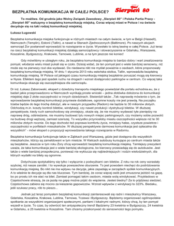 BEZPŁATNA KOMUNIKACJA W CAŁEJ POLSCE? To możliwe. Od grudnia jako Wolny Związek Zawodowy „Sierpień 80” i Polska Partia Pracy „Sierpień 80” walczymy o bezpłatną komunikację miejską. Coraz więcej miast w Polsce i na świecie decyduje się na taki rodzaj komunikacji miejskiej. Łukasz Ługowski Bezpłatna komunikacja miejska funkcjonuje w różnych miastach na całym świecie, w tym w Belgii (Hasselt), Niemczech (Templin), Estonii (Tallin), a nawet w Stanach Zjednoczonych (Baltimore). Po naszych akcjach samorząd Żor postanowił wprowadzić to rozwiązanie w życie. Wywołało to istną lawinę w całej Polsce. Już teraz na rzecz bezpłatnej komunikacji miejskiej działają samorządowcy i stowarzyszenia w Gdańsku, Warszawie, Koszalinie, Bydgoszczy, Krakowie, Tarnowie, Lublinie, a na tym jeszcze nie koniec! Gdy mówiliśmy w ubiegłym roku, że bezpłatna komunikacja miejska to bardzo dobry i wart zrealizowania pomysł, włodarze wielu miast pukali się w czoło. Dzisiaj widać, że ten pomysł jest o wiele bardziej sensowny, niż może się na pierwszy rzut oka wydawać. Do niedawna nikt nie myślał poważnie o osobach, które proponowały bezpłatną komunikację miejską. W dniu 1 stycznia 2013 roku estońska stolica, Tallin, wprowadziła bezpłatną komunikację miejską. W Polsce od jakiegoś czasu komunikacją miejską bezpłatnie poruszać mogą się kierowcy w Nysie. Efektem tego jest spadek ruchu na drogach i wzrost dostępności parkingów w centrum. Co więcej taka komunikacja okazuje się oszczędniejsza dla samorządu. Dr inż. Łukasz Zaborowski, ekspert z dziedziny transportu miejskiego powiedział dla portalu echodnia.eu, że z badań jakie przeprowadzono w Niemczech wynikają proste wnioski – jedna złotówka dołożona do komunikacji miejskiej daje 2 złote oszczędności w innych dziedzinach. Stwierdził także: „Tak naprawdę mówienie o tym, że wprowadzenie bezpłatnej komunikacji przyniesie dodatkowe, ogromne koszty nie jest prawdą. Na początku trzeba będzie do tego trochę dołożyć, ale w naszym przypadku (Radom) nie będzie to 30 milionów złotych. Odchodzą m.in. koszty kontroli biletów, windykacji, czy nawet produkcji i dystrybucji biletów. W dłuższej perspektywie, kiedy ruch samochodowy się zmniejszy, okaże się, że nie musimy wydawać tyle pieniędzy na naprawę dróg, odśnieżanie, nie musimy budować tylu nowych miejsc parkingowych, czy możemy sobie pozwolić na budowę drogi węższej, zamiast szerszej. To wszystko przyniosłoby miastu oszczędności większe niż te 30 milionów złotych rocznie. Do tego dochodzi też poprawa komfortu życia, mniejszy hałas, czystsze powietrze i oszczędności w portfelach mieszkańców. W dłuższej perspektywie darmowa komunikacja jest opłacalna dla wszystkich” - mówi ekspert o propozycji wprowadzenia takiego rozwiązania w Radomiu. Bezpłatna komunikacja funkcjonuje także w Ząbkach pod Warszawą, gdzie jest dostępna dla wszystkich mieszkańców, którzy są zameldowani w tym mieście. W Kielcach autobusy kursujące po centrum miasta także są bezpłatne. Jeszcze w tym roku Żory chcą wprowadzić bezpłatną komunikację miejską. Tamtejszy prezydent uważa, że taka komunikacja jest o wiele bardziej ekologiczna, bo kierowcy przesiadają się do autobusów. Jest także o wiele bardziej prospołeczna, ponieważ nie wyklucza się najbiedniejszych i rodzin wielodzietnych, dla których wydatki na bilety są ogromne. Dotychczas spotykaliśmy się tylko i wyłącznie z podwyżkami cen biletów. Z roku na rok ceny wzrastały szybciej, niż nasze zarobki. I to wywołuje powszechne oburzenie. To jest powodem niechęci do podróżowania komunikacją miejską. Bo nikt nie ma wpływu na decyzje, jakie zapadają w zarządach spółek komunikacyjnych. A to właśnie te decyzje są dla nas kluczowe. Tym bardziej, że coraz więcej osób jest zmuszona jeździć na gapę, bo po prostu ich nie stać na bilet. Zamiast pomagać takim osobom, miasta wolą windykować. Przykładowo w Częstochowie straszą, że za jazdę na gapę można pójść do więzienia. Jesteś biedny? Za to pójdziesz siedzieć. Częstochowa zabiera się mocno za kieszenie gapowiczów. Wzrost wpływów z windykacji to 323%. Biedaku, jeśli szukasz pracy, rób to pieszo... Jednak już teraz pomysłem bezpłatnej komunikacji zainteresowali się radni i mieszkańcy Warszawy, Gdańska, Koszalina, Krakowa, Lublina, Tarnowa, Tczewa i Bydgoszczy. Będziemy organizować ogólnopolskie spotkanie ze wszystkimi organizacjami społecznymi, partiami i lokalnymi radnymi, którzy chcą, by ten pomysł wszedł w życie. To czas, by odwrócić ten antyspołeczny trend! Będziemy 23 kwietnia w Bydgoszczy, 24 kwietnia w Gdańsku, a 25 kwietnia w Koszalinie. Tam chcemy przekonywać do sensowności tego pomysłu. Bezpłatna komunikacja to więcej pieniędzy w naszych kieszeniach, bo nie musimy kupować już biletów. W czasach kryzysu podreperuje to budżety domowe. Podreperuje także budżety wielu miast, które nie będą musiały planować dodatkowych wydatków drogowych w przyszłości. By zapewnić jazdę po mieście bez korków, po prostu sensowniejsze i oszczędniejsze jest wprowadzenie bezpłatnej komunikacji miejskiej. Co więcej, nie będziemy truci spalinami z tysięcy samochodów, które codziennie wjeżdżają teraz do miast, korkując je. Bezpłatna komunikacja miejska, to samorząd przyjazny mieszkańcom. W poszukiwaniu pracy, w drodze do pracy, szkoły, szpitala, czy na uczelnię. Jak wielkie pieniądze wchodzą w grę, gdy mowa o rozwiązywaniu problemów z korkami? Przykładowo proponowana budowa tunelu pod Ochojcem w Katowicach to 150 mln złotych. Nie licząc dróg dojazdowych i całej infrastruktury, która musi zostać dobudowana, by ten dojazd do samego tunelu umożliwić. To suma, która sfinansowałaby bezpłatną komunikację przez 3-4 lata. W Gdańsku budowa tunelu pod Wisłą Martwą ma kosztować 600-800 mln z