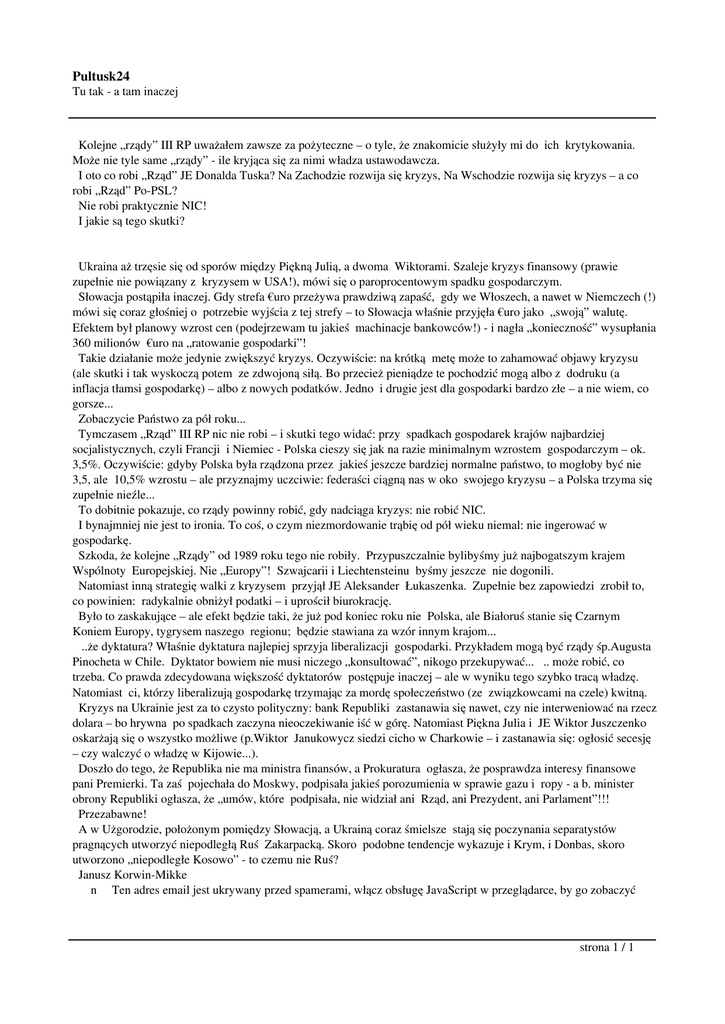 Pultusk24 Tu tak - a tam inaczej Kolejne „rządy” III RP uważałem zawsze za pożyteczne – o tyle, że znakomicie służyły mi do ich krytykowania. Może nie tyle same „rządy” - ile kryjąca się za nimi władza ustawodawcza. I oto co robi „Rząd” JE Donalda Tuska? Na Zachodzie rozwija się kryzys, Na Wschodzie rozwija się kryzys – a co robi „Rząd” Po-PSL? Nie robi praktycznie NIC! I jakie są tego skutki? Ukraina aż trzęsie się od sporów między Piękną Julią, a dwoma Wiktorami. Szaleje kryzys finansowy (prawie zupełnie nie powiązany z kryzysem w USA!), mówi się o paroprocentowym spadku gospodarczym. Słowacja postąpiła inaczej. Gdy strefa €uro przeżywa prawdziwą zapaść, gdy we Włoszech, a nawet w Niemczech (!) mówi się coraz głośniej o potrzebie wyjścia z tej strefy – to Słowacja właśnie przyjęła €uro jako „swoją” walutę. Efektem był planowy wzrost cen (podejrzewam tu jakieś machinacje bankowców!) - i nagła „konieczność” wysupłania 360 milionów €uro na „ratowanie gospodarki”! Takie działanie może jedynie zwiększyć kryzys. Oczywiście: na krótką metę może to zahamować objawy kryzysu (ale skutki i tak wyskoczą potem ze zdwojoną siłą. Bo przecież pieniądze te pochodzić mogą albo z dodruku (a inflacja tłamsi gospodarkę) – albo z nowych podatków. Jedno i drugie jest dla gospodarki bardzo złe – a nie wiem, co gorsze... Zobaczycie Państwo za pół roku... Tymczasem „Rząd” III RP nic nie robi – i skutki tego widać: przy spadkach gospodarek krajów najbardziej socjalistycznych, czyli Francji i Niemiec - Polska cieszy się jak na razie minimalnym wzrostem gospodarczym – ok. 3,5%. Oczywiście: gdyby Polska była rządzona przez jakieś jeszcze bardziej normalne państwo, to mogłoby być nie 3,5, ale 10,5% wzrostu – ale przyznajmy uczciwie: federaści ciągną nas w oko swojego kryzysu – a Polska trzyma się zupełnie nieźle... To dobitnie pokazuje, co rządy powinny robić, gdy nadciąga kryzys: nie robić NIC. I bynajmniej nie jest to ironia. To coś, o czym niezmordowanie trąbię od pół wieku niemal: nie ingerować w gospodarkę. Szkoda, że kolejne „Rządy” od 1989 roku tego nie robiły. Przypuszczalnie bylibyśmy już najbogatszym krajem Wspólnoty Europejskiej. Nie „Europy”! Szwajcarii i Liechtensteinu byśmy jeszcze nie dogonili. Natomiast inną strategię walki z kryzysem przyjął JE Aleksander Łukaszenka. Zupełnie bez zapowiedzi zrobił to, co powinien: radykalnie obniżył podatki – i uprościł biurokrację. Było to zaskakujące – ale efekt będzie taki, że już pod koniec roku nie Polska, ale Białoruś stanie się Czarnym Koniem Europy, tygrysem naszego regionu; będzie stawiana za wzór innym krajom... ..że dyktatura? Właśnie dyktatura najlepiej sprzyja liberalizacji gospodarki. Przykładem mogą być rządy śp.Augusta Pinocheta w Chile. Dyktator bowiem nie musi niczego „konsultować”, nikogo przekupywać... .. może robić, co trzeba. Co prawda zdecydowana większość dyktatorów postępuje inaczej – ale w wyniku tego szybko tracą władzę. Natomiast ci, którzy liberalizują gospodarkę trzymając za mordę społeczeństwo (ze związkowcami na czele) kwitną. Kryzys na Ukrainie jest za to czysto polityczny: bank Republiki zastanawia się nawet, czy nie interweniować na rzecz dolara – bo hrywna po spadkach zaczyna nieoczekiwanie iść w górę. Natomiast Piękna Julia i JE Wiktor Juszczenko oskarżają się o wszystko możliwe (p.Wiktor Janukowycz siedzi cicho w Charkowie – i zastanawia się: ogłosić secesję – czy walczyć o władzę w Kijowie...). Doszło do tego, że Republika nie ma ministra finansów, a Prokuratura ogłasza, że posprawdza interesy finansowe pani Premierki. Ta zaś pojechała do Moskwy, podpisała jakieś porozumienia w sprawie gazu i ropy - a b. minister obrony Republiki ogłasza, że „umów, które podpisała, nie widział ani Rząd, ani Prezydent, ani Parlament”!!! Przezabawne! A w Użgorodzie, położonym pomiędzy Słowacją, a Ukrainą coraz śmielsze stają się poczynania separatystów pragnących utworzyć niepodległą Ruś Zakarpacką. Skoro podobne tendencje wykazuje i Krym, i Donbas, skoro utworzono „niepodległe Kosowo” - to czemu nie Ruś? Janusz Korwin-Mikke n Ten adres email jest ukrywany przed spamerami, włącz obsługę JavaScript w przeglądarce, by go zobaczyć strona 1 / 1