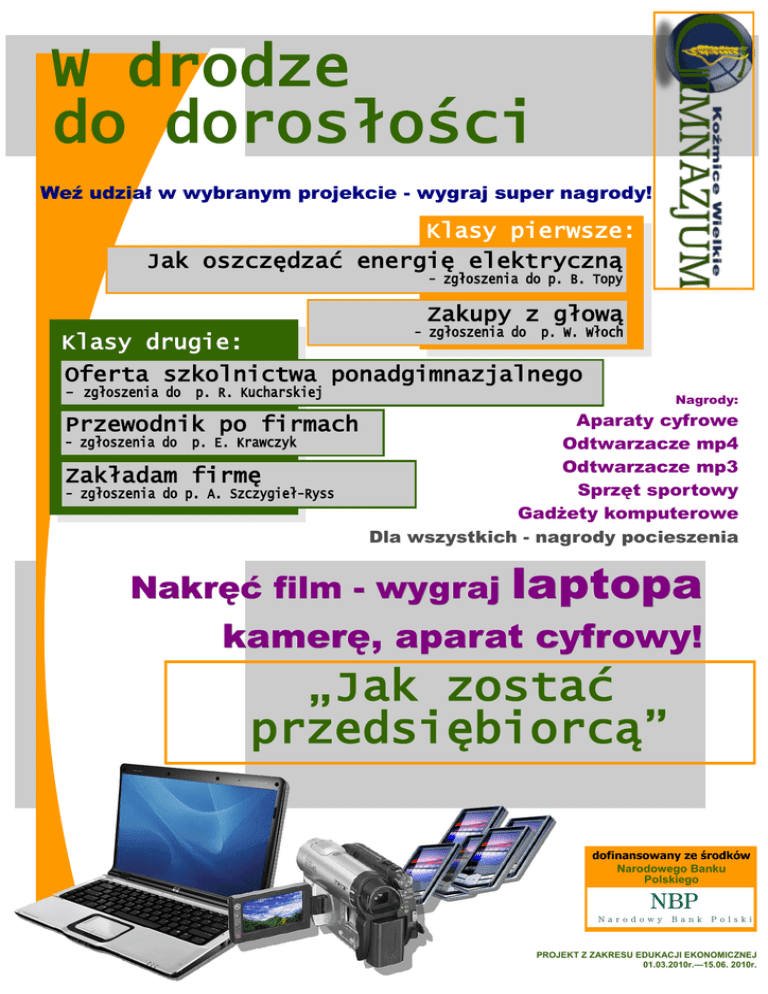 W drodze do dorosłości Weź udział w wybranym projekcie - wygraj super nagrody! Klasy pierwsze: Jak oszczędzać energię elektryczną - zgłoszenia do p. B. Topy Zakupy z głową - zgłoszenia do p. W. Włoch Klasy drugie: Oferta szkolnictwa ponadgimnazjalnego - zgłoszenia do p. R. Kucharskiej Przewodnik po firmach - zgłoszenia do p. E. Krawczyk Zakładam firmę - zgłoszenia do p. A. Szczygieł-Ryss Nagrody: Aparaty cyfrowe Odtwarzacze mp4 Odtwarzacze mp3 Sprzęt sportowy Gadżety komputerowe Dla wszystkich - nagrody pocieszenia Nakręć film - wygraj laptopa kamerę, aparat cyfrowy! „Jak zostać przedsiębiorcą” dofinansowany ze środków Narodowego Banku Polskiego PROJEKT Z ZAKRESU EDUKACJI EKONOMICZNEJ 01.03.2010r.—15.06. 2010r.