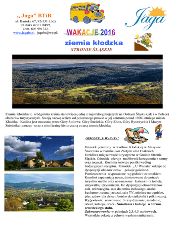 „ Jaga” BTiR ul. Bartoka 67, 92-531 Łódź tel./faks 42 6738499, kom. 606 991722. www.jagabt.pl, [email protected]. ziemia kłodzka STRONIE ŚLĄSKIE .Ziemia Kłodzka to śródgórska kraina stanowiąca jedną z najatrakcyjniejszych na Dolnym Śląsku (jak i w Polsce) obszarów turystycznych. Swoją nazwę wzięła od położonego prawie w jej centrum ponad 1000-letniego miasta Kłodzka . Kotlina jest otoczona przez Góry Stołowe, Góry Bardzkie, Góry Złote, Góry Bystrzyckie i Masyw Śnieżnika tworząc wraz z nimi krainę historyczną zwaną ziemią kłodzką OŚRODEK „U WANATA” Ośrodek położony w Kotlinie Kłodzkiej w Masywie Śnieżnika w Paśmie Gór Złotych oraz Bialskich. Urokliwa miejscowość turystyczna w Gminie Stronie Śląskie. Ośrodek oferuje możliwość korzystania z sauny oraz jacuzzi. Kuchnia serwuje posiłki według tradycyjnych receptur. Ośrodek „ U Wanata” oddaje do dyspozycji obozowiczów pokoje gościnne. Pomieszczenia wyposażone wygodnie i ze smakiem. Komfort zapewniają nowe, dostosowane do potrzeb turystów meble oraz nowoczesne łazienki - z toaletą, umywalką i prysznicem. Do dyspozycji obozowiczów sala rekreacyjna, sala do tenisa stołowego, aneks kuchenny, sauna, jacuzzi, sala TV, miejsce na ognisko, plac zabaw dla dzieci, boisko do siatkówki i piłki nożnej. Wyżywienie: serwowane 3 razy dziennie, śniadanie, obiad, kolacja, deser.. Śniadania i kolacje w formie szwedzkiego stołu. Zakwaterowanie: w pokojach 2,3,4,5 osobowych. Wszystkie pokoje z pełnym węzłem sanitarnym. PROGRAM. Dzień 1. Zbiórka na parkingu przy szkole o godz. 8.00. Wyjazd o godz. 8.30. Przejazd do miejsca zakwaterowania. Zakwaterowanie. Obiadokolacja. Dzień 2 – 12. 1. Zwiedzanie kopalni złota w Złotym Stoku - to jedna z najciekawszych atrakcji Ziemi Kłodzkiej. Najstarsze prace wydobywcze prowadzono w okolicach Złotego Stoku już około 2000 lat p.n.e. Od tego czasu aż do lat dzisiejszych zdołano wydrążyć przeszło 300 km sztolni, szybów i chodników rozmieszczonych aż na 21 poziomach. Na przestrzeni całego okresu wydobywczego, tj. w ciągu ponad 700 lat, wydobyto w Złotym Stoku ok. 16 ton czystego złota. Po ukończeniu wydobycia postanowiono, że niektóre korytarze warto udrożnić i udostępnić dla ruchu turystycznego. Po 5 latach prac uruchomiono Podziemną Trasę Turystyczną "Kopalnia Złota", udało się udostępnić niezwykle ciekawe sztolnie: "Sztolnię Gertuda" , "Sztolnię Czarną Górną" z jedynym w Polsce podziemnym wodospadem (8 m wysokości), Sztolnię Czarną Dolną 2 Skalne Miasto w Czechach. Będziemy podziwiać piękno otaczającej Nas przyrody, a od czasu do czasu zobaczycie pstrągi pływające w licznych potoczkach. Poznamy unikalne formy skalne, takie jak Skalna Korona (symbol skał teplickich), Wykałaczka Karkonosza, Wieża Strażnicza, Topór Rzeźniczy i wiele innych. Aparat fotograficzny będzie niezbędny. 3. Twierdza Kłodzko- twierdza to miejsce owiane aurą tajemniczości, które gromadzi wiele historycznych wydarzeń z minionych epok oraz różnych legend i opowieści. Przewodnicy oprowadzający po Twierdzy odkryją przed nami sekrety i opowiedzą o burzliwej historii tej fortyfikacji 4. Zwiedzanie Kłodzka. Spacer po mieście. Zakupy pamiątek. 5. Strzeliniec, Błędne Skały- dzięki procesowi erozyjnemu Gór Stołowych zobaczymy jedyne w swoim rodzaju formy skalne (wież, ambon, grzybów) skalnych labiryntów i ostańców. Zwiedzanie z przewodnikiem. 6. Przejazd do Kudowy Zdrój – Szlakiem Ginących Zawodów. Podczas tej wizyty zapoznamy się z ginącymi zawodami: garncarstwem, kowalstwem, tkactwem i piekarstwem. Zobaczymy pokaz toczenia naczyń glinianych, wstąpimy do domu wypieku chleba, do chatki robótek ręcznych, kuźni i mini – zoo. 7. Jaskinia Niedźwiedzia - znajduje się w Masywie Śnieżnika na Ziemi Kłodzkiej, powyżej wsi Kletno, na wysokości ok. 800 m. Jest to najdłuższa jaskinia Sudetów - liczy około 2500 m korytarzy. Została odkryta w 1966 roku i stała się sensacją naukową na skalę europejską. Znaleziono tu olbrzymie ilości kości zwierząt, w większości gatunków już wymarłych. Od licznych kości niedźwiedzia jaskiniowego wzięła swoją nazwę. 8. Zwiedzanie Huty Szkła w Stroniu Śląskim . Zobaczymy prawdziwy piec hutniczy . Na własne oczy ujrzymy jak powstają szklane cudeńka. Odwiedzimy dział zdobienia i poznamy proces ręcznego zdobienia wyrobów z kryształu. 8. Marsze szlakami górskimi 9. Podchody, konkursy, zajęcia terenowe. 10. Przejazdy na zbiornik rekreacyjny w Stroniu Śląskim. Kąpiele w jeziorze. Dzień 13. Śniadanie. Pobranie prowiantu. Powrót do Łodzi. TERMIN: 11.07-23.07.2016. 05.08-17.08.2016. CENA: 1450 zł. Jaga Biuro Turystyki i Rekreacji ul. Bartoka 67, 92-531 Łódź tel./faks 42 6738499, kom. 606 991722. www.jagabt.pl, [email protected]. 1.Zakwaterowanie w Ośrodku Wypoczynkowym „ U Wanata” w miejscowości Nowy Gierałtów w pokojach 2,3,4,5 osobowych z łazienkami. 2.Wyżywienie ( śniadanie, obiad, kolacja, podwieczorek). Prowiant na wycieczki autokarowe. Prowiant na drogę powrotną. 3.Transport autokarem 4.Ubezpieczenie NNW. 5.Możliwość korzystania z infrastruktury ośrodka , stołu do tenisa stołowego, sali ze sprzętem TV i dyskotekowym, boiska do piłki nożnej i siatkowej. 6.Opiekę wykwalifikowanej kadry pedagogicznej. 7.Realizację ciekawego programu. 8.Wycieczki jak w programie, gry, zabawy, dyskoteki. 9.Wstępy w cenie imprezy.