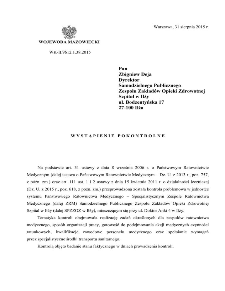 Warszawa, 31 sierpnia 2015 r. WOJEWODA MAZOWIECKI WK-II.9612.1.38.2015 Pan Zbigniew Deja Dyrektor Samodzielnego Publicznego Zespołu Zakładów Opieki Zdrowotnej Szpital w Iłży ul. Bodzentyńska 17 27-100 Iłża WYSTĄPIENIE POKONTROLNE Na podstawie art. 31 ustawy z dnia 8 września 2006 r. o Państwowym Ratownictwie Medycznym (dalej ustawa o Państwowym Ratownictwie Medycznym – Dz. U. z 2013 r., poz. 757, z późn. zm.) oraz art. 111 ust. 1 i 2 ustawy z dnia 15 kwietnia 2011 r. o działalności leczniczej (Dz. U. z 2015 r., poz. 618, z późn. zm.) przeprowadzona została kontrola problemowa w jednostce systemu Państwowego Ratownictwa Medycznego – Specjalistycznym Zespole Ratownictwa Medycznego (dalej ZRM) Samodzielnego Publicznego Zespołu Zakładów Opieki Zdrowotnej Szpital w Iłży (dalej SPZZOZ w Iłży), mieszczącym się przy ul. Doktor Anki 4 w Iłży. Tematyka kontroli obejmowała realizację zadań określonych dla zespołów ratownictwa medycznego, sposób organizacji pracy, gotowość do podejmowania akcji medycznych czynności ratunkowych, kwalifikacje zawodowe personelu medycznego oraz spełnianie wymagań przez specjalistyczne środki transportu sanitarnego. Kontrolą objęto badanie stanu faktycznego w dniach prowadzenia kontroli. W związku z kontrolą, której szczegółowe wyniki przedstawione zostały w protokole kontroli, podpisanym bez zastrzeżeń w dniu 18 czerwca 2015 r., przekazuję Panu Dyrektorowi niniejsze wystąpienie pokontrolne. W trakcie kontroli ustalono, że ZRM pozostaje w całodobowej gotowości wyjazdowej. Pomieszczenia będące miejscem stacjonowania zespołu wyjazdowego oraz specjalistyczny środek transportu sanitarnego wyposażone zostały w środki łączności zapewniające stały kontakt z centrum powiadamiania ratunkowego. Sprzęt i aparatura medyczna wykorzystywane do udzielania świadczeń zdrowotnych umożliwiały niezwłoczne przeprowadzanie medycznych czynności ratunkowych. Leki znajdujące się w wyposażeniu ZRM posiadały ważne terminy przydatności do stosowania. Specjalistyczny środek transportu sanitarnego spełniał wymagania określone w Polskiej Normie PN-EN 1789+A1. Na podstawie harmonogramów wykonywania dyżurów w ZRM ustalono, że świadczenia opieki zdrowotnej podejmowane w celu ratowania osób w stanie nagłego zagrożenia zdrowotnego w warunkach pozaszpitalnych udzielane były przez personel medyczny posiadający wymagane kwalifikacje zawodowe i zapewniający odpowiednią obsadę dla zespołu specjalistycznego. Świadczenia medyczne wykonywane były przez sześciu lekarzy systemu, z których jeden był specjalistą w dziedzinie pediatrii, jeden posiadał wypracowane ponad 3000 godzin w wykonywaniu zawodu lekarza w zespołach ratownictwa medycznego, a czterech lekarzy ukończyło co najmniej drugi rok specjalizacji w dziedzinach: anestezjologii i intensywnej terapii (dwóch lekarzy), medycyny ratunkowej (jeden lekarz), ortopedii i traumatologii narządu ruchu (jeden lekarz). Świadczenia medyczne zapewniane były również przez czternastu ratowników medycznych oraz trzy pielęgniarki systemu, z których jedna posiadała tytuł specjalisty w dziedzinie pielęgniarstwa ratunkowego, a dwie ukończyły kurs kwalifikacyjny w zakresie anestezjologii i intensywnej opieki, a także posiadały ponad 3-letni staż pracy w pogotowiu ratunkowym. W dokumentacji podmiotu leczniczego zgromadzono dokumenty potwierdzające prawo wykonywania zawodu aktualnie zatrudnionej kadry lekarskiej i pielęgniarskiej oraz zaświadczenia o przygotowaniu zawodowym ratowników medycznych. Z przedstawionego do analizy Rejestru skarg i wniosków Zakładu Opieki Zdrowotnej – Pogotowie Ratunkowe, w ramach którego funkcjonuje ZRM, wynikało, że do dnia zakończenia kontroli nie zarejestrowano żadnych skarg pacjentów. Na podstawie przeprowadzonej analizy Kart zlecenia wyjazdu zespołu ratownictwa medycznego oraz Kart medycznych czynności ratunkowych, sporządzonych przez zespół specjalistyczny w okresie od 1 kwietnia 2015 r. do 30 kwietnia 2015 r., ustalono, że ZRM stacjonujący w Iłży 2 (miasto poniżej 10 tysięcy mieszkańców) w osiemnastu przypadkach na osiemdziesiąt osiem zrealizowanych zleceń wyjazdu poza obszar miasta przekroczył maksymalny czas dotarcia, który – zgodnie z art. 24 ust. 1 pkt 3 ustawy o Państwowym Ratownictwie Medycznym – nie może być dłuższy niż 20 minut. Przekroczenie wyniosło: 1 (w trzech przypadkach), 2 (w trzech przypadkach), 3 (w dwóch przypadkach), 4 (w dwóch przypadkach), 5 (w trzech przypadkach), 6 (w trzech przypadkach), 9 i 15 minut. Przedstawiając powyższe ustalenia pragnę poinformować, że pozytywnie oceniono kwalifikacje i zabezpieczenie kadry medycznej w ZRM oraz warunki i wyposażenie specjalistycznego środka transportu sanitarnego, niemniej należy podjąć działania usprawniające organizację pracy zespołu w celu zapewnienia odpowiednich parametrów czasu dotarcia na miejsce zdarzenia od chwili przyjęcia zgłoszenia przez dyspozytora medycznego – zgodnie z normą określoną w art. 24 ust. 1 pkt 3 ustawy o Państwowym Ratownictwie Medycznym. Jednocześnie zobowiązuję Pana Dyrektora do poinformowania Wojewody Mazowieckiego, z powołaniem znaku pisma WK-II.9612.1.38.2015, o sposobie wykorzystania wniosku pokontrolnego, niezwłocznie po otrzymaniu wystąpienia. z up. WOJEWODY MAZOWICKIEGO Edyta Ostrowska Dyrektor Wydziału Kontroli Do wiadomości: Starostwo Powiatu Radomskiego ul. Domagalskiego 7 26-600 Radom 3