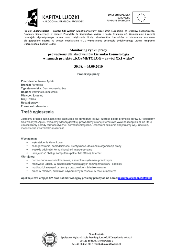 Projekt „Kosmetologia – zawód XXI wieku” współfinansowany przez Unię Europejską ze środków Europejskiego Funduszu Społecznego w ramach Priorytetu IV Szkolnictwo wyższe i nauka Działania 4.1 Wzmocnienie i rozwój potencjału dydaktycznego uczelni oraz zwiększenie liczby absolwentów kierunków o kluczowym znaczeniu dla gospodarki opartej na wiedzy Poddziałanie 4.1.1 Wzmocnienie potencjału dydaktycznego uczelni Programu Operacyjnego Kapitał Ludzki. Monitoring rynku pracy prowadzony dla absolwentów kierunku kosmetologia w ramach projektu „KOSMETOLOG – zawód XXI wieku” 30.08. – 05.09.2010 Propozycje pracy Pracodawca: Nasze Apteki Branża: Farmacja Typ stanowiska: Dermokonsultantka Region: warmińsko-mazurskie Miejsce: Szczytno Kraj: Polska Rodzaj pracy: Forma zatrudnienia: - Treść ogłoszenia Jesteśmy prężnie działającą firmą zajmującą się sprzedażą leków i szeroko pojętą promocją zdrowia. Posiadamy sieć własnych Aptek, wydajemy własną gazetkę, prowadzimy stronę internetową www.naszeapteki.pl, na której umieszczamy porady farmaceutyczne i dermokosmetyczne. Obszarem działania obejmujemy woj. lubelskie, mazowieckie i warmińsko-mazurskie. Wymagania: • wykształcenie kierunkowe • zaangażowanie, samodzielność, kreatywność, doskonała organizacja pracy • wysokie zdolności komunikacyjne i interpersonalne • umiejętność obsługi komputera (pakiet MS Office), Internet Oferujemy: • bardzo dobre warunki finansowe, z szerokim systemem premiowym • możliwość udziału w szkoleniach wspierających rozwój zawodowy i osobisty • możliwości awansu i ustaloną z pracownikiem ścieżkę rozwoju • pracę w młodym, ambitnym i dynamicznym zespole, w miłej atmosferze Aplikacje zawierające CV oraz list motywacyjny prosimy przesyłać na adres:[email protected] Biuro Projektu Społeczna Wyższa Szkoła Przedsiębiorczości i Zarządzania w Łodzi 90-113 Łódź, ul. Sienkiewicza 9 tel. 42 664 66 30, e-mail [email protected] Projekt „Kosmetologia – zawód XXI wieku” współfinansowany przez Unię Europejską ze środków Europejskiego Funduszu Społecznego w ramach Priorytetu IV Szkolnictwo wyższe i nauka Działania 4.1 Wzmocnienie i rozwój potencjału dydaktycznego uczelni oraz zwiększenie liczby absolwentów kierunków o kluczowym znaczeniu dla gospodarki opartej na wiedzy Poddziałanie 4.1.1 Wzmocnienie potencjału dydaktycznego uczelni Programu Operacyjnego Kapitał Ludzki. Pracodawca: Nasze Apteki Branża: Farmacja Typ stanowiska: Dermokonsultantka Region: mazowieckie Miejsce: Siedlce Kraj: Polska Rodzaj pracy: Forma zatrudnienia: - Treść ogłoszenia Jesteśmy prężnie działającą firmą zajmującą się sprzedażą leków i szeroko pojętą promocją zdrowia. Posiadamy sieć własnych Aptek, wydajemy własną gazetkę, prowadzimy stronę internetową www.naszeapteki.pl, na której umieszczamy porady farmaceutyczne i dermokosmetyczne. Obszarem działania obejmujemy woj. lubelskie, mazowieckie i warmińsko-mazurskie. Wymagania: • wykształcenie kierunkowe • zaangażowanie, samodzielność, kreatywność, doskonała organizacja pracy • wysokie zdolności komunikacyjne i interpersonalne • umiejętność obsługi komputera (pakiet MS Office), Internet Oferujemy: • bardzo dobre warunki finansowe, z szerokim systemem premiowym • możliwość udziału w szkoleniach wspierających rozwój zawodowy i osobisty • możliwości awansu i ustaloną z pracownikiem ścieżkę rozwoju • pracę w młodym, ambitnym i dynamicznym zespole, w miłej atmosferze Aplikacje zawierające CV oraz list motywacyjny prosimy przesyłać na adres:[email protected] Biuro Projektu Społeczna Wyższa Szkoła Przedsiębiorczości i Zarządzania w Łodzi 90-113 Łódź, ul. Sienkiewicza 9 tel. 42 664 66 30, e-mail [email protected] Projekt „Kosmetologia – zawód XXI wieku” współfinansowany przez Unię Europejską ze środków Europejskiego Funduszu Społecznego w ramach Priorytetu IV Szkolnictwo wyższe i nauka Działania 4.1 Wzmocnienie i rozwój potencjału dydaktycznego uczelni oraz zwiększenie liczby absolwentów kierunków o kluczowym znaczeniu dla gospodarki opartej na wiedzy Poddziałanie 4.1.1 Wzmocnienie potencjału dydaktycznego uczelni Programu Operacyjnego Kapitał Ludzki. Pracodawca: JJ POWER Branża: Handel Typ stanowiska: Przedstawiciel Handlowy Region: warmińsko - mazurskie Miejsce: Kraj: Polska Rodzaj pracy: Forma zatrudnienia: - Treść ogłoszenia Wymagania: • doświadczenie w pracy na podobnym stanowisku (vanselling) • znajomość branży solaryjnej • duże zaangażowanie i samodzielność w działaniu • prawo jazdy kat. B Oferujemy: • pracę w intensywnie rozwijającej się firmie • motywujący system wynagrodzeń • niezbędne narzędzia pracy CV wraz z listem motywacyjnym prosimy przesłać na adres: [email protected] z dopiskiem „PH” Biuro Projektu Społeczna Wyższa Szkoła Przedsiębiorczości i Zarządzania w Łodzi 90-113 Łódź, ul. Sienkiewicza 9 tel. 42 664 66 30, e-mail [email protected] Projekt „Kosmetologia – zawód XXI wieku” współfinansowany przez Unię Europejską ze środków Europejskiego Funduszu Społecznego w ramach Priorytetu IV Szkolnictwo wyższe i nauka Działania 4.1 Wzmocnienie i rozwój potencjału dydaktycznego uczelni oraz zwiększenie liczby absolwentów kierunków o kluczowym znaczeniu dla gospodarki opartej na wiedzy Poddziałanie 4.1.1 Wzmocnienie potencjału dydaktycznego uczelni Programu Operacyjnego Kapitał Ludzki. Pracodawca: Verona Products Professional Sp. z o.o. Branża: Handel Typ stanowiska: Przedstawiciel Handlowy ds. detalu Region: mazowieckie Miejsce: Warszawa i okolice Kraj: Polska Rodzaj pracy: Stała Forma zatrudnienia: Umowa o pracę Treść ogłoszenia Wymagania: • umiejętność pracy na samodzielnym stanowisku • obsługa i utrzymywanie dobrych relacji z klientami • pozyskiwanie nowych klientów • realizacja planów sp