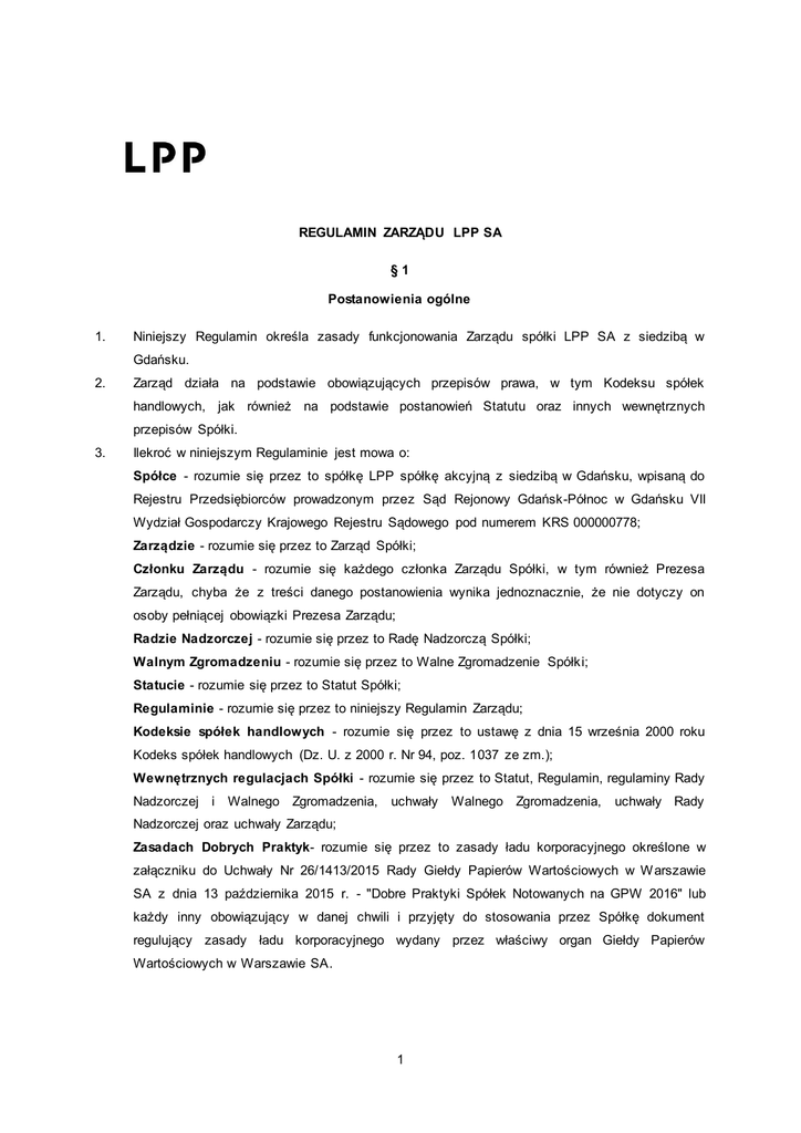 REGULAMIN ZARZĄDU LPP SA §1 Postanowienia ogólne 1. Niniejszy Regulamin określa zasady funkcjonowania Zarządu spółki LPP SA z siedzibą w Gdańsku. 2. Zarząd działa na podstawie obowiązujących przepisów prawa, w tym Kodeksu spółek handlowych, jak również na podstawie postanowień Statutu oraz innych wewnętrznych przepisów Spółki. 3. Ilekroć w niniejszym Regulaminie jest mowa o: Spółce - rozumie się przez to spółkę LPP spółkę akcyjną z siedzibą w Gdańsku, wpisaną do Rejestru Przedsiębiorców prowadzonym przez Sąd Rejonowy Gdańsk-Północ w Gdańsku VII Wydział Gospodarczy Krajowego Rejestru Sądowego pod numerem KRS 000000778; Zarządzie - rozumie się przez to Zarząd Spółki; Członku Zarządu - rozumie się każdego członka Zarządu Spółki, w tym również Prezesa Zarządu, chyba że z treści danego postanowienia wynika jednoznacznie, że nie dotyczy on osoby pełniącej obowiązki Prezesa Zarządu; Radzie Nadzorczej - rozumie się przez to Radę Nadzorczą Spółki; Walnym Zgromadzeniu - rozumie się przez to Walne Zgromadzenie Spółki; Statucie - rozumie się przez to Statut Spółki; Regulaminie - rozumie się przez to niniejszy Regulamin Zarządu; Kodeksie spółek handlowych - rozumie się przez to ustawę z dnia 15 września 2000 roku Kodeks spółek handlowych (Dz. U. z 2000 r. Nr 94, poz. 1037 ze zm.); Wewnętrznych regulacjach Spółki - rozumie się przez to Statut, Regulamin, regulaminy Rady Nadzorczej i Walnego Zgromadzenia, uchwały Walnego Zgromadzenia, uchwały Rady Nadzorczej oraz uchwały Zarządu; Zasadach Dobrych Praktyk- rozumie się przez to zasady ładu korporacyjnego określone w załączniku do Uchwały Nr 26/1413/2015 Rady Giełdy Papierów Wartościowych w W arszawie SA z dnia 13 października 2015 r. - "Dobre Praktyki Spółek Notowanych na GPW 2016" lub każdy inny obowiązujący w danej chwili i przyjęty do stosowania przez Spółkę dokument regulujący zasady ładu korporacyjnego wydany przez właściwy organ Giełdy Papierów Wartościowych w Warszawie SA. 1 §2 Kompetencje Zarządu 1. Wszelkie sprawy związane z prowadzeniem spraw Spółki niezastrzeżone przepisami prawa albo Statutem do kompetencji Rady Nadzorczej lub Walnego Zgromadzenia należą do zakresu działania Zarządu. 2. Zarząd działa na podstawie przepisów Kodeksu spółek handlowych i innych powszechnie obowiązujących przepisów prawa, wewnętrznych regulacji Spółki, w tym zgodnie z przyjętymi przez Spółkę Zasadami Dobrych Praktyk. 3. Zarząd prowadzi sprawy Spółki i reprezentuje Spółkę na zewnątrz. §3 Zasady podstawowe działania Zarządu 1. Członek Zarządu powinien lojalnie działać na rzecz Spółki, w szczególności nie prowadzić działalności konkurencyjnej wobec Spółki. 2. Przy prowadzeniu spraw Spółki, zarówno Zarząd działający kolegialnie, jak i Członkowie Zarządu działający samodzielnie, podejmują decyzje w granicach uzasadnionego ryzyka gospodarczego oraz po rozpatrzeniu wszystkich informacji, analiz i opinii, które powinny być, w ocenie Członków Zarządu, w danym przypadku wzięte pod uwagę ze względu na interes Spółki. 3. Mając na uwadze możliwość wystąpienia konfliktu interesów przy dokonywaniu transakcji z akcjonariuszami oraz innymi osobami, których interesy wpływają na działalność Spółki, Zarząd powinien działać ze szczególną starannością, aby transakcje były dokonywane adekwatnie do warunków rynkowych. 4. Członkowie Zarządu są zobowiązani poinformować Zarząd oraz Radę Nadzorczą, o każdym konflikcie interesów w związku z pełnioną funkcją lub o możliwości jego powstania. Członek Zarządu powinien poinformować Zarząd oraz powstrzymać się od zabierania głosu w dyskusji oraz od głosowania nad uchwałą w sprawie, w której zaistniał konflikt interesów. 5. Pełnienie przez Członka Zarządu funkcji w zarządzie lub radzie nadzorczej spółki spoza grupy kapitałowej Spółki wymaga zgody Rady Nadzorczej. 6. Członkowie Zarządu są zobowiązani do przestrzegania przepisów prawa, wewnętrznych regulacji Spółki, włączając w to odpowiednie regulacje Giełdy Papierów Wartościowych w Warszawie SA oraz Komisji Nadzoru Finansowego w zakresie dotyczącym obrotu papierami wartościowymi. §4 Posiedzenia Zarządu 1. Posiedzenia Zarządu odbywają się z częstotliwością wymaganą dla prawidłowego funkcjonowania Spółki. 2. Posiedzenia Zarządu odbywają się w siedzibie Spółki lub innym miejscu wskazanym w zaproszeniu na posiedzenie. 2 3. Posiedzenia Zarządu zwołuje Prezes Zarządu lub upoważniony przez niego Członek Zarządu. Posiedzenia zwoływane są z inicjatywy Prezesa Zarządu lub na wniosek innego Członka Zarządu. 4. Posiedzeniom przewodniczy Prezes Zarządu, a w razie jego nieobecności, inny Członek Zarządu wskazany przez Prezesa Zarządu, a w przypadku braku takiego wskazania wybrany przez obecnych na posiedzeniu Członków Zarządu. Do obowiązków Prezesa Zarządu lub innego Członka Zarządu przewodniczącego posiedzeniem Zarządu należy: 5. a. otwieranie i zamykanie posiedzeń oraz zarządzanie przerw, b. zapewnienie sprawnego i prawidłowego przebiegu posiedzeń, c. zarządzanie głosowań i stwierdzanie ich wyniku. Członek Zarządu zwołujący posiedzenie Zarządu zawiadamia o tym pozostałych Członków Zarządu, nie później niż na 24 (dwadzieścia cztery) godziny przed przewidywanym terminem posiedzenia. W zwołaniu należy wskazać co najmniej termin i miejsce posiedzenia oraz proponowany porządek obrad. 6. W przypadkach nie cierpiących zwłoki, zwołanie posiedzenia może nastąpi ć z zachowaniem krótszego terminu niż określony w ustępie 5 powyżej. 7. Zwołanie posiedzenia Zarządu następuje osobiście, za pomocą telefonu bądź pocztą elektroniczną. 8. W wypadkach nie cierpiących zwłoki, posiedzenie może zostać zwołane również w inny sposób niż wskazany w ustępie 7 powyżej, przy zap