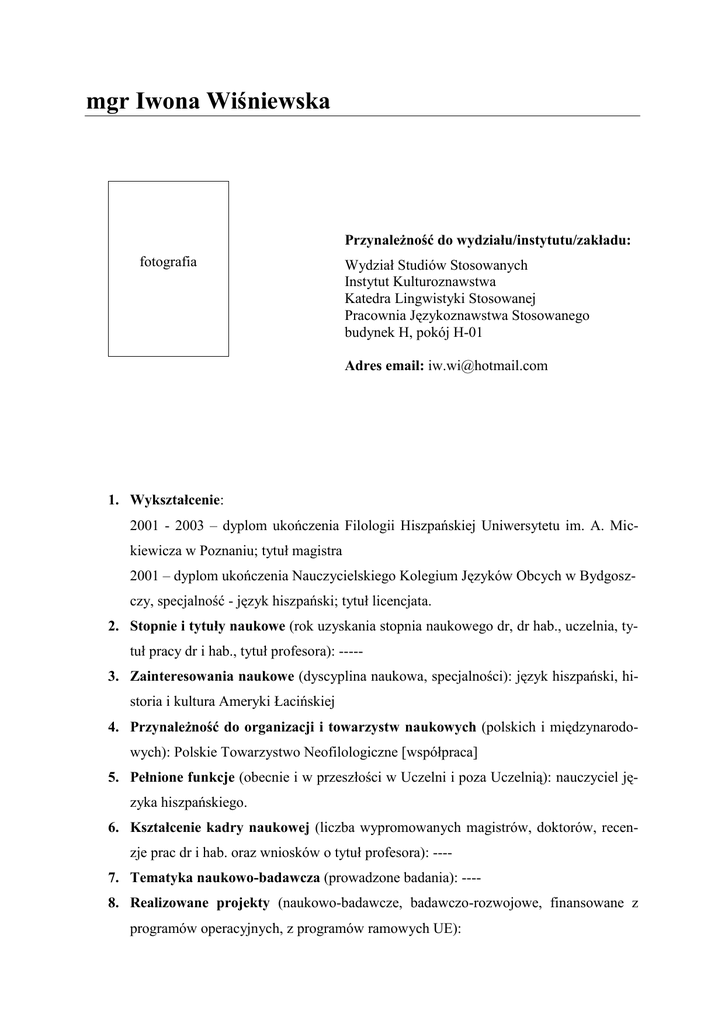mgr Iwona Wiśniewska Przynależność do wydziału/instytutu/zakładu: fotografia Wydział Studiów Stosowanych Instytut Kulturoznawstwa Katedra Lingwistyki Stosowanej Pracownia Językoznawstwa Stosowanego budynek H, pokój H-01 Adres email: [email protected] 1. Wykształcenie: 2001 - 2003 – dyplom ukończenia Filologii Hiszpańskiej Uniwersytetu im. A. Mickiewicza w Poznaniu; tytuł magistra 2001 – dyplom ukończenia Nauczycielskiego Kolegium Języków Obcych w Bydgoszczy, specjalność - język hiszpański; tytuł licencjata. 2. Stopnie i tytuły naukowe (rok uzyskania stopnia naukowego dr, dr hab., uczelnia, tytuł pracy dr i hab., tytuł profesora): ----3. Zainteresowania naukowe (dyscyplina naukowa, specjalności): język hiszpański, historia i kultura Ameryki Łacińskiej 4. Przynależność do organizacji i towarzystw naukowych (polskich i międzynarodowych): Polskie Towarzystwo Neofilologiczne [współpraca] 5. Pełnione funkcje (obecnie i w przeszłości w Uczelni i poza Uczelnią): nauczyciel języka hiszpańskiego. 6. Kształcenie kadry naukowej (liczba wypromowanych magistrów, doktorów, recenzje prac dr i hab. oraz wniosków o tytuł profesora): ---7. Tematyka naukowo-badawcza (prowadzone badania): ---8. Realizowane projekty (naukowo-badawcze, badawczo-rozwojowe, finansowane z programów operacyjnych, z programów ramowych UE): Projekt finansowany przez UE „Od praktykanta do praktyka – praktyka kluczem do profesjonalizmu” 9. Dorobek naukowy (wykaz publikacji): ---10. Uzyskane patenty (jeżeli są): ---11. Zajęcia dydaktyczne (tytuły przedmiotów i rodzaj zajęć – wykłady, konwersatoria, seminaria): ćwiczenia