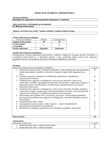KIERUNEK OCHRONA ŚRODOWISKA Tytuł przedmiotu Biologiczne zagrożenia ekosystemów lądowych i wodnych Imię, nazwisko i tytuł/stopień prowadzącego Dr Mikołaj Kokociński Imiona, nazwiska oraz tytuły / stopnie członków zespołu dydaktycznego Forma zaliczenia przedmiotu Forma przedmiotu Wykład Ogólna liczba godzin 30 Liczba godzin 3 w tygodniu Forma zaliczenia Egzamin Laboratorium 30 3 Zaliczenie Krótki opis tematyki przedmiotu Przedstawione zostaną zagrożenia ekosystemów wodnych i lądowych związane przede wszystkim z czynnikami biotycznymi tj. z zakwitami glonów i sinic, produkcją toksyn sinicowych, migracją gatunków obcych i inwazyjnych, ubocznymi skutkami działalności człowieka Wykład Zawartość tematyczna poszczególnych wykładów 1. Omówienia pojęcia stresu w biologii, problemów z jego interpretacją i prowadzeniem badań dotyczących czynników stresowych, kategorie odpowiedzi organizmów na stres. 2. Poznanie zagrożeń związanych z acidifikacją, eutrofizacją i saprobizacją ekosystemów wodnych 3. Przedstawienie zagrożeń wynikających z toksycznych zakwitów sinicowych, omówienie warunków sprzyjających pojawianiu się zakwitów, zagrożenia związane z hepatotoksynami, nerotoksynami, cytotoksynami, dermatoksynami oraz innymi toksynami sinicowymi 4. Przedstawienie zagrożeń wynikających z toksycznych zakwitów bruzdnic morskich, omówienie zasięgu występowania wybranych gatunków bruzdnic oraz potencjalnych zachorowań związanych z produkowanymi przez nie toksynami 5. Omówienie pojęć gatunek obcy i inwazyjny, przyczyny i drogi migracji gatunków inwazyjnych, przedstawienie zagrożeń wynikających z obecności gatunków obcych i inwazyjnych 6. Synantropizacja flory i fauny 7. Antropopresja na ekosystemy wodne i lądowe – wpływ ksenobiotyków 8. Mechanizmy detoksykacji ksenobiotykow 9. Biochemiczne adaptacje organizmów do wybranych czynników stresowych Razem godzin Laboratoria Zawartość tematyczna 1. Rozpoznawanie sinic z rzędu Chroococcales 2. Rozpoznawanie sinic z rzędu Nostocales L. godz. 2 4 6 4 2 2 4 4 2 30 L. godz. 3 3 3. 4. 5. 6. Rozpoznawanie sinic z rzędu Oscillatoriales Ogólna charakterystyka i rozpoznawanie bruzdnic morskich Przedstawianie wybranych problemów zakwitów bruzdnic – praca z posterami Charakterystyka i przykłady zagrożeń wynikających z ekspansji gatunków inwazyjnych – praca z posterami 7. Wirusy i bakterie chorobotwórcze – charakterystyka zagrożeń 8. Charakterystyka antropogenicznych zaburzeń ekosystemów metalami ksenobiotykami 9. Ocena zagrożeń ekosystemów wodnych związanych z eutrofizacją i acidifikacją Razem godzin i 3 3 3 6 3 3 3 30 Zalecana literatura Literatura podstawowa: W. Lampert, U. Sommer. Ekologia wód śródlądowych.Wydawnictwo Naukowe PWN. Warszawa 1996. R. Laskowski, P. Migula. Ekotoksykologia od komórki do ekosystemu. Państwowe Wydawnictwo Rolnicze i Leśne. Warszawa 2004. K. Niewiadomska, T. Pojmańska, B. Machnicka, A. Czubaj. Zarys parazytologii ogólnej. Wydawnictwo Naukowe PWN. Warszawa 2001. Z. Podbielkowski. Wędrówki roślin. Wydawnictwo Szkolne i Pedagogiczne. Warszawa 1995. J. Kornaś. Geografia roślin. Wydawnictwo Naukowe PWN. Warszawa 2002. H. K. Hudnell (ed.) Cyanobacterial harmful algal blooms. State of the science and research needs. Advances in experimental medicine and biology. Vol. 619. Springer 2008. Literatura uzupełniająca: J.B. Harborne. Ekologia biochemiczna. Wydawnictwo Naukowe PWN. Warszawa 1997. A. S. Ostrowicki. Geografia biosfery. Biogeografia dynamiczna lądów. Wydawnictwo Naukowe PWN. Warszawa 1999. Warunki i tryb odbywania zajęć dydaktycznych Zajęcia odbywają się we wskazanych w planie terminach. Warunki usprawiedliwiania i odrabiania nieobecności na zajęciach Możliwa jest 1 nieobecność bez usprawiedliwienia, każda następna musi być usprawiedliwiona zwolnieniem lekarskim. Wszystkie nieobecności muszą zostać odrobione na podstawie udostępnianych materiałów dydaktycznych. Warunki i tryb uzyskiwania zaliczenia oraz składania egzaminu Zaliczenie z ćwiczeń na ocenę na podstawie ocen z dwóch kolokwiów oraz ocen dodatkowych za przedstawione referaty oraz opracowania wykonane na zajęciach Zasady zapisywania się na egzamin Staroście roku zostanie przekazana lista egzaminacyjna Termin egzaminu i zaliczenia Terminy ustalane są na pierwszych zajęciach. Tryb ogłaszania wyników egzaminu lub zaliczenia Wyniki zaliczenia i egzaminu zostaną wywieszone na tablicy ogłoszeń przy pokoju 140 w Collegium Polonicum Tryb dokonywania wpisów ocen z egzaminu lub zaliczenia Wpisy zostaną dokonane w ciągu następnych 2-3 dni od ogłoszenia wyników po zebraniu przez starostę roku wszystkich indeksów.