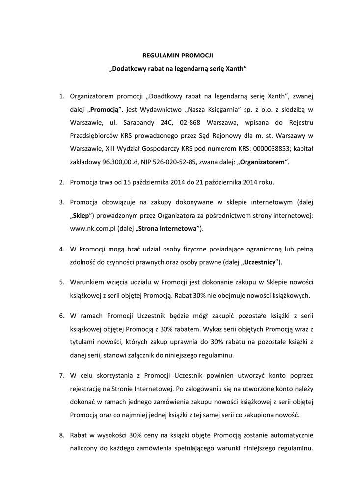 REGULAMIN PROMOCJI „Dodatkowy rabat na legendarną serię Xanth” 1. Organizatorem promocji „Doadtkowy rabat na legendarną serię Xanth”, zwanej dalej „Promocją”, jest Wydawnictwo „Nasza Księgarnia” sp. z o.o. z siedzibą w Warszawie, ul. Sarabandy 24C, 02-868 Warszawa, wpisana do Rejestru Przedsiębiorców KRS prowadzonego przez Sąd Rejonowy dla m. st. Warszawy w Warszawie, XIII Wydział Gospodarczy KRS pod numerem KRS: 0000038853; kapitał zakładowy 96.300,00 zł, NIP 526-020-52-85, zwana dalej: „Organizatorem“. 2. Promocja trwa od 15 października 2014 do 21 października 2014 roku. 3. Promocja obowiązuje na zakupy dokonywane w sklepie internetowym (dalej „Sklep”) prowadzonym przez Organizatora za pośrednictwem strony internetowej: www.nk.com.pl (dalej „Strona Internetowa”). 4. W Promocji mogą brać udział osoby fizyczne posiadające ograniczoną lub pełną zdolność do czynności prawnych oraz osoby prawne (dalej „Uczestnicy”). 5. Warunkiem wzięcia udziału w Promocji jest dokonanie zakupu w Sklepie nowości książkowej z serii objętej Promocją. Rabat 30% nie obejmuje nowości książkowych. 6. W ramach Promocji Uczestnik będzie mógł zakupić pozostałe książki z serii książkowej objętej Promocją z 30% rabatem. Wykaz serii objętych Promocją wraz z tytułami nowości, których zakup uprawnia do 30% rabatu na pozostałe książki z danej serii, stanowi załącznik do niniejszego regulaminu. 7. W celu skorzystania z Promocji Uczestnik powinien utworzyć konto poprzez rejestrację na Stronie Internetowej. Po zalogowaniu się na utworzone konto należy dokonać w ramach jednego zamówienia zakupu nowości książkowej z serii objętej Promocją oraz co najmniej jednej książki z tej samej serii co zakupiona nowość. 8. Rabat w wysokości 30% ceny na książki objęte Promocją zostanie automatycznie naliczony do każdego zamówienia spełniającego warunki niniejszego regulaminu. Uczestnik może w ramach jednego zamówienia zakupić dowolna ilość książek objętych Promocją z zachowaniem 30% rabatu na każda z nich 9. Promocja nie łączy się z innymi rabatami lub akcjami promocyjnymi obowiązującymi w Sklepie, a także nie dotyczy książek oferowanych przez Sklep w dziale „Wyprzedaże”. Jednakże klienci będący osobami fizycznymi zachowują prawo do 20% rabatu dla klientów indywidualnych na zakupioną nowość książkową. 10. Postępowanie reklamacyjne w sprawach dotyczących Promocji odbywa się na następujących zasadach: a. reklamacje podlegają zgłoszeniu pisemnie na adres siedziby Organizatora lub na adres poczty elektronicznej: [email protected], najpóźniej w terminie 21 dni od daty zakończenia Promocji; b. reklamacja powinna zawierać w tytule dopisek: Reklamacja – Promocja „Dodatkowy rabat na legendarną serię Xanth” oraz następujące dane: imię, nazwisko i dokładny adres reklamującego, jak również dokładny opis, wskazanie przyczyny reklamacji oraz treść żądania; c. reklamacje rozpatrywane będą w terminie 14 dni od dnia otrzymania reklamacji przez Organizatora; d. rozstrzygnięcie w przedmiocie reklamacji zostanie przesłane reklamującemu tą samą drogą jaką wpłynęła reklamacja na adres w niej podany. 11. Regulamin Promocji dostępny jest na stronie internetowej Sklepu. 12. Regulamin Promocji wchodzi w życie z dniem ogłoszenia. Załącznik do regulaminu Promocji „Dodatkowy rabat na legendarna serię Xanth”: 1. Xanth. Ogrze, ogrze 2. Xanth. Nocna mara 3. Xanth. Smok na piedestale 4. Xanth. Okrutne kłamstwo 5. Xanth. Przesmyk centaura 6. Xanth. Zamek Roogna 7. Xanth. Źródło magii 8. Xanth. Zaklęcie dla Cameleon