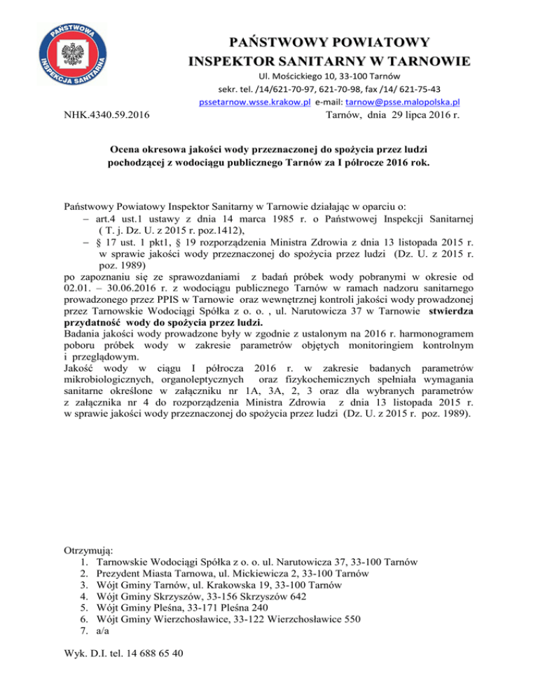 PAŃ ST W OW Y PO WI AT OW Y I NSPE KT OR SA NI T AR NY W T A RN OWI E NHK.4340.59.2016 Ul. Mościckiego 10, 33-100 Tarnów sekr. tel. /14/621-70-97, 621-70-98, fax /14/ 621-75-43 pssetarnow.wsse.krakow.pl e-mail: [email protected] Tarnów, dnia 29 lipca 2016 r. Ocena okresowa jakości wody przeznaczonej do spożycia przez ludzi pochodzącej z wodociągu publicznego Tarnów za I półrocze 2016 rok. Państwowy Powiatowy Inspektor Sanitarny w Tarnowie działając w oparciu o: art.4 ust.1 ustawy z dnia 14 marca 1985 r. o Państwowej Inspekcji Sanitarnej ( T. j. Dz. U. z 2015 r. poz.1412), § 17 ust. 1 pkt1, § 19 rozporządzenia Ministra Zdrowia z dnia 13 listopada 2015 r. w sprawie jakości wody przeznaczonej do spożycia przez ludzi (Dz. U. z 2015 r. poz. 1989) po zapoznaniu się ze sprawozdaniami z badań próbek wody pobranymi w okresie od 02.01. – 30.06.2016 r. z wodociągu publicznego Tarnów w ramach nadzoru sanitarnego prowadzonego przez PPIS w Tarnowie oraz wewnętrznej kontroli jakości wody prowadzonej przez Tarnowskie Wodociągi Spółka z o. o. , ul. Narutowicza 37 w Tarnowie stwierdza przydatność wody do spożycia przez ludzi. Badania jakości wody prowadzone były w zgodnie z ustalonym na 2016 r. harmonogramem poboru próbek wody w zakresie parametrów objętych monitoringiem kontrolnym i przeglądowym. Jakość wody w ciągu I półrocza 2016 r. w zakresie badanych parametrów mikrobiologicznych, organoleptycznych oraz fizykochemicznych spełniała wymagania sanitarne określone w załączniku nr 1A, 3A, 2, 3 oraz dla wybranych parametrów z załącznika nr 4 do rozporządzenia Ministra Zdrowia z dnia 13 listopada 2015 r. w sprawie jakości wody przeznaczonej do spożycia przez ludzi (Dz. U. z 2015 r. poz. 1989). Otrzymują: 1. Tarnowskie Wodociągi Spółka z o. o. ul. Narutowicza 37, 33-100 Tarnów 2. Prezydent Miasta Tarnowa, ul. Mickiewicza 2, 33-100 Tarnów 3. Wójt Gminy Tarnów, ul. Krakowska 19, 33-100 Tarnów 4. Wójt Gminy Skrzyszów, 33-156 Skrzyszów 642 5. Wójt Gminy Pleśna, 33-171 Pleśna 240 6. Wójt Gminy Wierzchosławice, 33-122 Wierzchosławice 550 7. a/a Wyk. D.I. tel. 14 688 65 40