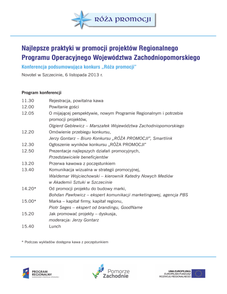 Najlepsze praktyki w promocji projektów Regionalnego Programu Operacyjnego Województwa Zachodniopomorskiego Konferencja podsumowująca konkurs „Róża promocji” Novotel w Szczecinie, 6 listopada 2013 r. Program konferencji 11.30 12.00 12.05 Rejestracja, powitalna kawa Powitanie gości O mijającej perspektywie, nowym Programie Regionalnym i potrzebie promocji projektów, Olgierd Geblewicz – Marszałek Województwa Zachodniopomorskiego 12.20 Omówienie przebiegu konkursu, Jerzy Gontarz – Biuro Konkursu „RÓŻA PROMOCJI”, Smartlink 12.30 Ogłoszenie wyników konkursu „RÓŻA PROMOCJI” 12.50 Prezentacje najlepszych działań promocyjnych, Przedstawiciele beneficjentów 13.20 Przerwa kawowa z poczęstunkiem 13.40 Komunikacja wizualna w strategii promocyjnej, Waldemar Wojciechowski – kierownik Katedry Nowych Mediów w Akademii Sztuki w Szczecinie 14.20* Od promocji projektu do budowy marki, Bohdan Pawłowicz – ekspert komunikacji marketingowej, agencja PBS 15.00* Marka – kapitał firmy, kapitał regionu, Piotr Seges – ekspert od brandingu, GoodName 15.20 Jak promować projekty – dyskusja, moderacja: Jerzy Gontarz 15.40 Lunch * Podczas wykładów dostępna kawa z poczęstunkiem