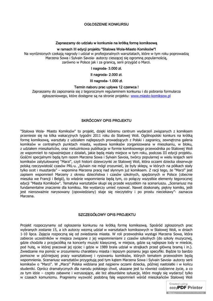 OGŁOSZENIE KONKURSU Zapraszamy do udziału w konkursie na krótką formę komiksową w ramach III edycji projektu "Stalowa Wola-Miasto Komiksów"! Na wyróżnionych czekają nagrody i udział w profesjonalnych warsztatach, które w tym roku poprowadzą Marzena Sowa i Sylvain Savoia- autorzy cieszącej się ogromną popularnością, zarówno w Polsce jak i za granicą, serii przygód o Marzi. I nagroda- 3.000 zł. II nagroda- 2.000 zł. III nagroda- 1.000 zł. Termin naboru prac upływa 12 czerwca ! Zapraszamy do zapoznania się z tegorocznym regulaminem konkursu i do pobrania formularza zgłoszeniowego, które dostępne są na stronie projektu: www.miasto-komiksow.pl SKRÓCONY OPIS PROJEKTU "Stalowa Wola- Miasto Komiksów" to projekt, dzięki któremu centrum wydarzeń związanych z komiksem przeniesie się na kilka wakacyjnych tygodni 2011 roku do Stalowej Woli. Ogólnopolski konkurs na krótką formę komiksową, warsztaty z udziałem najlepszych prowadzących z Polski i zagranicy, zewnętrzna galeria komiksów w centralnych punktach miasta, wystawa komiksów zorganizowana w mieszkaniu, w bloku, z udziałem mieszkańców, oraz nietuzinkowa publikacja w formie komiksowego przewodnika po Stalowej Woli ze wspomnień to najważniejsze z działań, jakie będą miały miejsce w tym roku, podczas III edycji projektu. Gośćmi specjalnymi będą tym razem Marzena Sowa i Sylvain Savoia, twórcy popularnej w wielu krajach serii komiksów zatytułowanej "Marzi", czyli historii dziewczynki ze Stalowej Woli, która oczami dziecka obserwuje polską rzeczywistość czasów PRL-u. „Sylvain nie mógł zrozumieć, że były sklepy, w których na półkach stały tylko ocet i musztarda” – wspomina Marzena pracę nad słynnym już komiksem. Z racji tego, że "Marzi" jest zapisem wspomnień Marzeny z okresu dzieciństwa i czasów szkolnych, spędzonych w Polsce (obecnie mieszka we Francji i Belgii), to właśnie wspomnienia będą tym, co połączy wszystkie elementy tegorocznej edycji "Miasta Komiksów". Tematyka warsztatów skupi się przede wszystkim na scenariuszu. „Scenariusz ma fundamentalne znaczenie dla komiksu. Nie wystarczy umieć rysować. Nawet doskonały, piękny komiks, jeśli jest nierozważnie narysowany (opowiedziany) staje się nieczytelny i po prostu nieciekawy”- zaznacza Marzena. SZCZEGÓŁOWY OPIS PROJEKTU Projekt rozpoczynamy od ogłoszenia konkursu na krótką formę komiksową. Spośród zgłoszonych prac wybranych zostanie 15, a ich autorzy wezmą udział w warsztatach komiksowych w Stalowej Woli, w dniach 1-10 lipca. Zajęcia rozpoczną się od zwiedzania miasta. W roli przewodnika wystąpi Marzena Sowa, która zabierze uczestników w miejsca związane z jej wspomnieniami z czasów szkolnych (do szkoły muzycznej, gdzie chodziła z przyjaciółką na koncerty muzyki klasycznej, w miejsce, gdzie są najlepsze lody w mieście, pod hutę, w której pracował jej ojciec i gdzie w 1989 brała udział w strajkach przed główną bramą i in.). Zwiedzanie ma pomóc w zrozumieniu charakteru miasta i lepszym poznaniu jego specyfiki. Będzie to bardzo pomocne w późniejszej pracy warsztatowej i rysowaniu komiksów, których tematem przewodnim będą wspomnienia. Scenariusz warsztatów przygotują pod tym kątem Marzena Sowa i Sylvain Savoia- autorzy serii komiksów o "Marzi". W „Marzi” Polska widziana jest najpierw oczami dziecka, później nastolatki i w końcu studentki. Oprócz dramatycznych dla narodu polskiego chwil, ukazane jest tu również codzienne życie, a co za tym idzie – często zabawne i wzruszające, ale też absurdalne sytuacje, które mogły się wydarzyć tylko w czasach komunizmu. Pragniemy wyzwolić podobną falę wspomnień wśród mieszkańców Stalowej Woli i zaangażować ich w realizację wystawy, która stanowić będzie główną atrakcję Otwarcia Galerii Komiksów. Planujemy zaaranżować jedno z mieszkań w bloku, wypełniając je meblami i akcesoriami charakterystycznymi dla czasów komunistycznych. Przedmioty te zgromadzimy na drodze zbiórki wśród mieszkańców. Na ścianach poszczególnych pomieszczeń zawieszone zostaną fragmenty komiksów o "Marzi". Wystawę będzie można obejrzeć w ramach wydarzeń związanych z Otwarciem Galerii Komiksów. Podobnie jak w latach poprzednich, na galerię składać się będą prace warsztatowiczów, wydrukowane w formie billboardów, zamieszczonych w centralnych punktach miasta. Dodatkowo wydana zostanie publikacja w formie "przewodnika wspomnień". Scenariusz opracuje Marzena Sowa, a jego podstawę stanowić będą opisy wspomnień znanych osób pochodzących ze Stalowej Woli (tzw. Ambasadorów Stalowej Woli). W oparciu o te teksty pracować będą warsztatowicze, rysując swoje komiksy. Publikacja będzie ciekawą formą podsumowania tegorocznej edycji projektu "Stalowa Wola-Miasto Komiksów". NOTKI BIOGRAFICZNE PROWADZĄCYCH Marzena Sowa Urodziła się w 1979 r. w Stalowej Woli. Studiowała filologię romańską na Uniwersytecie Jagiellońskim i w Bordeaux. Mieszka we Francji, w Szampanii, oraz w Brukseli. Jest autorką autobiograficznego komiksu "Marzi" opisującego losy małej dziewczynki dorastającej w latach ‘80 w Polsce. Rysunki do historii Marzeny Sowy tworzy jej życiowy partner Sylvain Savoia, autor licznych komiksów policyjnych i science fiction. Sylvain Savoia Urodził się w 1969 r. w Reims, we Francji. Jest autorem licznych komiksów stworzonych razem z JeanDavidem Morvanem (znanym w Polsce z serii Armada): westernu Reflets perdus, fantastycznego Nomada i policyjnego Al’Togo. Wykonał również kilka plansz do zbiorowych Chroniques de Sillage. Razem z Marzeną Sową wydał już trzy tomy serii Marzi, której czwarta część właśnie powstaje. Podobnie jak Marzena, swój czas dzieli miedzy Francję a Belgię.
