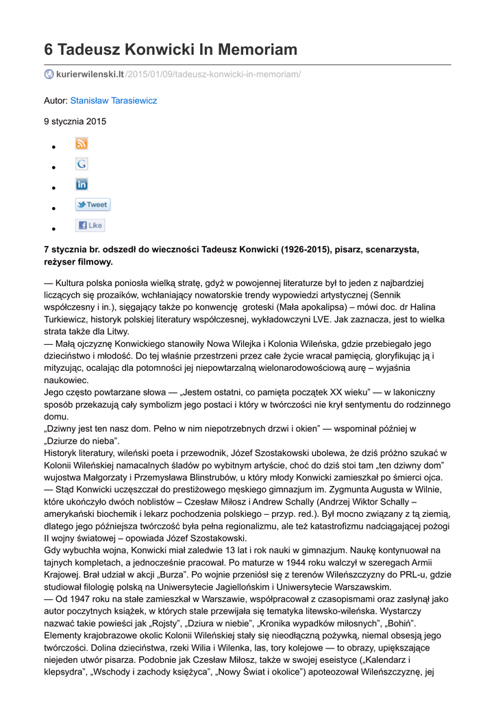 6 Tadeusz Konwicki In Memoriam kurierwilenski.lt /2015/01/09/tadeusz-konwicki-in-memoriam/ Autor: Stanisław Tarasiewicz 9 stycznia 2015 7 stycznia br. odszedł do wieczności Tadeusz Konwicki (1926-2015), pisarz, scenarzysta, reżyser filmowy. — Kultura polska poniosła wielką stratę, gdyż w powojennej literaturze był to jeden z najbardziej liczących się prozaików, wchłaniający nowatorskie trendy wypowiedzi artystycznej (Sennik współczesny i in.), sięgający także po konwencję groteski (Mała apokalipsa) – mówi doc. dr Halina Turkiewicz, historyk polskiej literatury współczesnej, wykładowczyni LVE. Jak zaznacza, jest to wielka strata także dla Litwy. — Małą ojczyznę Konwickiego stanowiły Nowa Wilejka i Kolonia Wileńska, gdzie przebiegało jego dzieciństwo i młodość. Do tej właśnie przestrzeni przez całe życie wracał pamięcią, gloryfikując ją i mityzując, ocalając dla potomności jej niepowtarzalną wielonarodowościową aurę – wyjaśnia naukowiec. Jego często powtarzane słowa — „Jestem ostatni, co pamięta początek XX wieku” — w lakoniczny sposób przekazują cały symbolizm jego postaci i który w twórczości nie krył sentymentu do rodzinnego domu. „Dziwny jest ten nasz dom. Pełno w nim niepotrzebnych drzwi i okien” — wspominał później w „Dziurze do nieba”. Historyk literatury, wileński poeta i przewodnik, Józef Szostakowski ubolewa, że dziś próżno szukać w Kolonii Wileńskiej namacalnych śladów po wybitnym artyście, choć do dziś stoi tam „ten dziwny dom” wujostwa Małgorzaty i Przemysława Blinstrubów, u który młody Konwicki zamieszkał po śmierci ojca. — Stąd Konwicki uczęszczał do prestiżowego męskiego gimnazjum im. Zygmunta Augusta w Wilnie, które ukończyło dwóch noblistów – Czesław Miłosz i Andrew Schally (Andrzej Wiktor Schally – amerykański biochemik i lekarz pochodzenia polskiego – przyp. red.). Był mocno związany z tą ziemią, dlatego jego późniejsza twórczość była pełna regionalizmu, ale też katastrofizmu nadciągającej pożogi II wojny światowej – opowiada Józef Szostakowski. Gdy wybuchła wojna, Konwicki miał zaledwie 13 lat i rok nauki w gimnazjum. Naukę kontynuował na tajnych kompletach, a jednocześnie pracował. Po maturze w 1944 roku walczył w szeregach Armii Krajowej. Brał udział w akcji „Burza”. Po wojnie przeniósł się z terenów Wileńszczyzny do PRL-u, gdzie studiował filologię polską na Uniwersytecie Jagiellońskim i Uniwersytecie Warszawskim. — Od 1947 roku na stałe zamieszkał w Warszawie, współpracował z czasopismami oraz zasłynął jako autor poczytnych książek, w których stale przewijała się tematyka litewsko-wileńska. Wystarczy nazwać takie powieści jak „Rojsty”, „Dziura w niebie”, „Kronika wypadków miłosnych”, „Bohiń”. Elementy krajobrazowe okolic Kolonii Wileńskiej stały się nieodłączną pożywką, niemal obsesją jego twórczości. Dolina dzieciństwa, rzeki Wilia i Wilenka, las, tory kolejowe — to obrazy, upiększające niejeden utwór pisarza. Podobnie jak Czesław Miłosz, także w swojej eseistyce („Kalendarz i klepsydra”, „Wschody i zachody księżyca”, „Nowy Świat i okolice”) apoteozował Wileńszczyznę, jej krajobrazy, ludzi, zwłaszcza przedwojenne obrzędy i obyczaje – mówi doc. dr Halina Turkiewicz. Zauważa też, że w sposób podobny Konwicki postępował jako scenarzysta i reżyser filmowy. — Nieprzypadkowo wziął m. in. na warsztat Mickiewiczowskie „Dziady” (film „Lawa”) oraz „Dolinę Issy” Czesława Miłosza – wyjaśnia historyk LVE. Reklama Pierwsze jego publikacje pojawiły się już w 1946 roku, jednak dopiero powieść „Z oblężonego miasta” (1956 r.) pokazała jego literacki talent. W „Ten dziwny dom” wujostwa Małgorzaty i Przemysława Blinstrubów, u których Tadeusz Konwicki zamieszkał po śmierci ojca (stan obecny) Fot. Marian Paluszkiewicz niej też po raz pierwszy przedstawił swój obraz Wileńszczyzny bliski mu z dzieciństwa. Ten obraz znajduje odbiór wśród dzisiejszej młodzieży z rodzinnych stron pisarza. — W Kolonii Wileńskiej i Nowej Wilejce, skąd pochodzę, Konwicki jest nam bliski nie tylko na podstawie utworów literackich, ale również ze swoich filmów. Według programu szkolnego, pamiętam, mieliśmy przeczytać „Kronikę wypadków miłosnych” i „Małą apokalipsę”. Ich fabuła od pierwszych stron pochłonęła nas całkowicie. Akcja bowiem toczyła się obok naszych domów z naszym bohaterem. Trudno więc się dziwić, że pani polonistka nam ciągle powtarzała, że ta lektura jest dla nas obowiązkowa. Konwicki bowiem jest krzewicielem kultury naszych stron, a jego książki są ponadczasowe. Nie ujrzą one swojej apokalipsy, bo: „Świat nie może umrzeć. Wielu już pokoleniom zdawało się, że świat umiera. Ale to tylko ich własny świat umierał”. Konwicki przetrwa wieki w skarbnicy naszej kultury – mówi „Kurierowi” młoda wileńska poetka Marzena Mackojć z „Nowej Awangardy Wileńskiej”. Artystka ubolewa, że z książek i filmów poznała świat wewnętrzny Konwickiego, ale nigdy osobiście. — Podróżowałam jego wspomnieniami z dzieciństwa spędzonego na Wileńszczyźnie, jego przeżyciami i jego sumieniem. Osobiście jednak się spotkać z nim nigdy nie udało, mimo iż była pewna okazja – mówi poetka. Tadeusz Konwicki prawie już nigdy nie wrócił do rodzinnych stron na Litwie. — Wilno odwiedził w latach 80. Podczas prapremiery jego „Lawy”. W tamtych czasach był to dla Wilna szok kulturowy – zauważa Józef Szostakowski. Jego zdaniem, twórczość Konwickiego, przetłumaczona również na litewski, jest dobrze znana, ale też bardzo ceniona przez litewskiego czytelnika. Wileński przewodnik ma nadzieję, że również pamięć po wybitnym artyście zostanie należycie uwieczniona na Litwie, a przede wszystkim w Nowej Wilejc