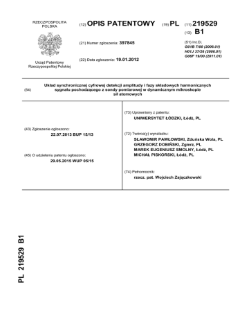 RZECZPOSPOLITA POLSKA (12) OPIS PATENTOWY (19) (21) Numer zgłoszenia: 397845 Urząd Patentowy Rzeczypospolitej Polskiej (54) (22) Data zgłoszenia: 19.01.2012 PL 219529 (13) B1 (11) (51) Int.Cl. G01B 7/00 (2006.01) H01J 37/26 (2006.01) G06F 19/00 (2011.01) Układ synchronicznej cyfrowej detekcji amplitudy i fazy składowych harmonicznych sygnału pochodzącego z sondy pomiarowej w dynamicznym mikroskopie sił atomowych (73) Uprawniony z patentu: UNIWERSYTET ŁÓDZKI, Łódź, PL (43) Zgłoszenie ogłoszono: 22.07.2013 BUP 15/13 (45) O udzieleniu patentu ogłoszono: (72) Twórca(y) wynalazku: SŁAWOMIR PAWŁOWSKI, Zduńska Wola, PL GRZEGORZ DOBIŃSKI, Zgierz, PL MAREK EUGENIUSZ SMOLNY, Łódź, PL MICHAŁ PISKORSKI, Łódź, PL 29.05.2015 WUP 05/15 (74) Pełnomocnik: PL 219529 B1 rzecz. pat. Wojciech Zajączkowski 2 PL 219 529 B1 Opis wynalazku Przedmiotem wynalazku jest układ synchronicznej cyfrowej detekcji amplitudy i fazy składowych harmonicznych sygnału pochodzącego z sondy pomiarowej w dynamicznym mikroskopie sił atomowych, znajdujący zastosowanie w analizie właściwości fizycznych oraz topografii badanej powierzchni. Z pracy Springer Handbook of Nanotechnology pod edycją H. Bushana wydanie II 2007 na stronach 744-758 znany jest układ detekcji amplitudy i fazy pierwszej harmonicznej przy użyciu wzmacniacza homodynowego. Z pracy „Higher harmonics imaging in tapping-mode atomic-force microscopy” opublikowanej przez R. W. Starka i W. M. Heckla w tomie 74, numerze 12 czasopisma Review of Scientific Instruments z grudnia 2003 znany jest układ umożliwiający jednoczesną detekcję amplitudy i fazy pierwszej oraz dowolnej harmonicznej sygnału pochodzącego z beleczki pomiarowej polegający na użyciu dwóch wzmacniaczy homodynowych, z tym że do drugiego doprowadzony jest sygnał referencyjny o częstotliwości będącej powieleniem częstotliwości wzbudzającej drgania beleczki pomiarowej. Z pracy wydanej w tomie 70, numerze 9 z września 1999 Review of Scientific Instruments autorstwa M. Starka i R. Guckenbergera pt. „Fast low-cost phase detection setup for tapping-mode atomic force microscopy” znany jest układ detekcji przesunięcia fazy pierwszej harmonicznej sygnału odbitego od powierzchni beleczki pomiarowej przy zastosowaniu przerzutnika bistabilnego oraz układ filtru dolnoprzepustowego lub też alternatywnego rozwiązania z wykorzystaniem generatora napięcia piłokształtnego oraz układu próbkująco pamiętającego. W obu tych przypadkach mierzone przesunięcie fazowe jest proporcjonalne do uśrednionej wartości napięcia pojawiającego się na wyjściu filtru dolnoprzepustowego bądź układu próbkująco-pamiętającego. Z pracy autorstwa R. Hillenbranda, M. Starka i R. Guckenbergerga pt. „Higher-harmonics generation in tapping-mode atomic-force microscopy: Insights into the tip-sample interaction” opublikowanej w Applied Physics Letters tom 76, numer 23 z czerwca 2000 r. znany jest układ detekcji amplitudy składowych harmonicznych drgań beleczki pomiarowej polegający na akwizycji sygnału z diody PSD przez przetwornik analogowo-cyfrowy, a następnie przetworzeniu go przy użyciu szybkiej transformaty Fouriera i algorytmów uśredniających. Z pracy autorstwa Toshio Ando, Noriyuki Kodera, Eisuke Takai, Daisuke Maruyama, Kiwamu Saito i Akitoshi Toda opublikowanej w PN AS 23 października 2001, w tomie 98, numerze 22 na stronach 12468-12472 znany jest układ wykorzystujący przetwornik wartości skutecznej sygnału do uzyskania wartości błędu kontrolera PID. Istota układu synchronicznej cyfrowej detekcji amplitudy i fazy składowych harmonicznych sygnału pochodzącego z sondy pomiarowej w dynamicznym mikroskopie sił atomowych według wynalazku polega na tym, że zawiera programowalną pętlę sprzężenia fazowego połączoną z przetwornikiem analogowo-cyfrowym, który jest połączony z układem FPGA. Układ synchronicznej cyfrowej detekcji amplitudy i fazy składowych harmonicznych sygnału pochodzącego z sondy pomiarowej w dynamicznym mikroskopie sił atomowych według wynalazku, zapewnia zarówno generowanie sygnału błędu dla kontrolera PID, jak i detekcję amplitudy i fazy składowych harmonicznych sygnału drgań beleczki pomiarowej powstałych na skutek interakcji sondy próbkującej z badaną powierzchnią. Korzystnym jest, że układ poprzez próbkowanie sygnału z częstotliwością będącą całkowitą wielokrotnością częstotliwości wzbudzającej drgania sondy eliminuje zjawisko przecieku widma występujące podczas obliczania przekształcenia Fouriera, a tym samym poprawia czułość detekcji harmonicznych oraz umożliwia odtworzenie prawidłowych przesunięć fazowych świadczących o właściwościach fizycznych badanej powierzchni, ponadto nie jest konieczne korygowania wartości obliczonych amplitud składowych widma częstotliwościowego co dodatkowo przyspiesza obliczenia. Korzystnym jest, że układ poprzez użycie przekształcenia Fouriera pozwala na równoczesne uzyskanie informacji o amplitudzie i przesunięciach fazowych wielu harmonicznych jednocześnie. Korzystnym jest, że układ można wykorzystać do obliczenia sygnału błędu dla kontrolera PID na podstawie amplitudy pierwszej harmonicznej. Korzystnym jest również, że układ jest w stanie obliczyć amplitudę pierwszej harmonicznej w czasie niewiele dłuższym od czasu pojedynczego okresu sygnału wzbudzającego drgania sondy pomiarowej. PL 219 529 B1 3 Układ synchronicznej cyfrowej detekcji amplitudy i fazy składowych harmonicznych sygnału pochodzącego z sondy pomiarowej w dynamicznym mikroskopie sił atomowych, według wynalazku przedstawiono na rysunku w postaci schematu. Wyjście układu bezpośredniej syntezy cyfrowej 10 połączone jest z elementem piezoelektrycznym 9, a także z wejściem sygnału referencyjnego programowalnej pętli sprzężenia fazowego 11. Sygnał zegarowy 12 wychodzący z pętli sprzężenia fazowego połączony j