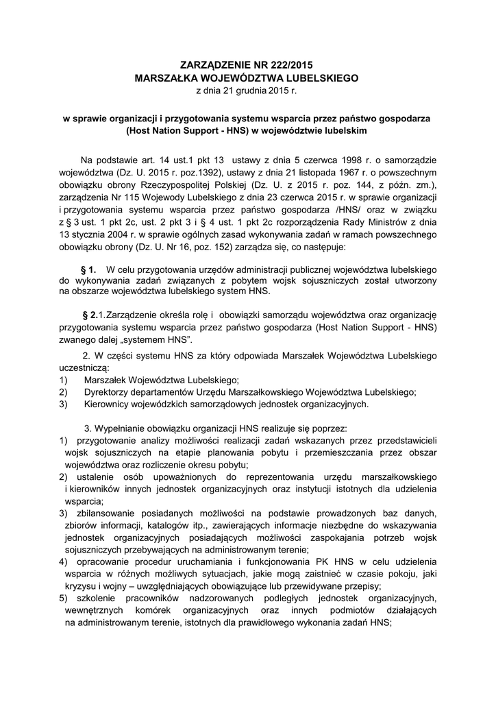 ZARZĄDZENIE NR 222/2015 MARSZAŁKA WOJEWÓDZTWA LUBELSKIEGO z dnia 21 grudnia 2015 r. w sprawie organizacji i przygotowania systemu wsparcia przez państwo gospodarza (Host Nation Support - HNS) w województwie lubelskim Na podstawie art. 14 ust.1 pkt 13 ustawy z dnia 5 czerwca 1998 r. o samorządzie województwa (Dz. U. 2015 r. poz.1392), ustawy z dnia 21 listopada 1967 r. o powszechnym obowiązku obrony Rzeczypospolitej Polskiej (Dz. U. z 2015 r. poz. 144, z późn. zm.), zarządzenia Nr 115 Wojewody Lubelskiego z dnia 23 czerwca 2015 r. w sprawie organizacji i przygotowania systemu wsparcia przez państwo gospodarza /HNS/ oraz w związku z § 3 ust. 1 pkt 2c, ust. 2 pkt 3 i § 4 ust. 1 pkt 2c rozporządzenia Rady Ministrów z dnia 13 stycznia 2004 r. w sprawie ogólnych zasad wykonywania zadań w ramach powszechnego obowiązku obrony (Dz. U. Nr 16, poz. 152) zarządza się, co następuje: § 1. W celu przygotowania urzędów administracji publicznej województwa lubelskiego do wykonywania zadań związanych z pobytem wojsk sojuszniczych został utworzony na obszarze województwa lubelskiego system HNS. § 2.1. Zarządzenie określa rolę i obowiązki samorządu województwa oraz organizację przygotowania systemu wsparcia przez państwo gospodarza (Host Nation Support - HNS) zwanego dalej „systemem HNS”. 2. W części systemu HNS za który odpowiada Marszałek Województwa Lubelskiego uczestniczą: 1) Marszałek Województwa Lubelskiego; 2) Dyrektorzy departamentów Urzędu Marszałkowskiego Województwa Lubelskiego; 3) Kierownicy wojewódzkich samorządowych jednostek organizacyjnych. 3. Wypełnianie obowiązku organizacji HNS realizuje się poprzez: 1) przygotowanie analizy możliwości realizacji zadań wskazanych przez przedstawicieli wojsk sojuszniczych na etapie planowania pobytu i przemieszczania przez obszar województwa oraz rozliczenie okresu pobytu; 2) ustalenie osób upoważnionych do reprezentowania urzędu marszałkowskiego i kierowników innych jednostek organizacyjnych oraz instytucji istotnych dla udzielenia wsparcia; 3) zbilansowanie posiadanych możliwości na podstawie prowadzonych baz danych, zbiorów informacji, katalogów itp., zawierających informacje niezbędne do wskazywania jednostek organizacyjnych posiadających możliwości zaspokajania potrzeb wojsk sojuszniczych przebywających na administrowanym terenie; 4) opracowanie procedur uruchamiania i funkcjonowania PK HNS w celu udzielenia wsparcia w różnych możliwych sytuacjach, jakie mogą zaistnieć w czasie pokoju, jaki kryzysu i wojny – uwzględniających obowiązujące lub przewidywane przepisy; 5) szkolenie pracowników nadzorowanych podległych jednostek organizacyjnych, wewnętrznych komórek organizacyjnych oraz innych podmiotów działających na administrowanym terenie, istotnych dla prawidłowego wykonania zadań HNS; 6) przygotowanie i koordynację zadań w urzędzie i wojewódzkich samorządowych jednostkach organizacyjnych, w tym obejmujących system wymiany informacji; 7) udzielanie pomocy jednostkom organizacyjnym zaangażowanym w faktyczną realizację wsparcia w dokumentowaniu i rozliczaniu wykonanych zadań. § 3. Punkt Kontaktowy HNS Marszałka Województwa Lubelskiego działa w oparciu o departamenty UMWL realizujące zdania obronne z zakresu możliwości socjalno-bytowych /zakwaterowania/, zaopatrzenia w żywność, usługi medyczne i transportowe wynikające z „Planu operacyjnego funkcjonowania UMWL”. § 4. Punkt Kontaktowy HNS organizowany w oparciu o stanowisko ds. obronnych Urzędu Marszałkowskiego działa w pełnym trybie z chwilą zaistnienia takich potrzeb w czasie realizacji rzeczywistych przedsięwzięć z udziałem wojsk sojuszniczych. Punkt ten zobowiązuje się do przekazywania informacji niezbędnych do uzupełnienia bazy danych do punktu kontaktowego Wojewody Lubelskiego. § 5. W celu właściwej realizacji zadań obronnych związanych z pobytem i przemieszczaniem się na administrowanym terenie wojsk sojuszniczych, w Urzędzie Marszałkowskim Województwa Lubelskiego , powołuje się Punkt Kontaktowy wsparcia państwa gospodarza, zwany dalej „Punktem Kontaktowym HNS”, w składzie: 1) Kierownik Punktu Kontaktowego HNS – Dyrektor Departamentu OrganizacyjnoPrawnego UMWL; 2) Zastępca Kierownik Punktu Kontaktowego HNS – główny specjalista ds. obronnych UMWL; 3) Członek Punktu Kontaktowego HNS – inspektor ds. obronnych UMWL. § 6. Upoważnia się kierownika Punktu Kontaktowego HNS Marszałka Województwa Lubelskiego do podejmowania i koordynowania wszelkich działań i czynności organizacyjnych dot. Urzędu Marszałkowskiego Województwa Lubelskiego i wojewódzkich samorządowych jednostek organizacyjnych w zakresie przygotowania do przemieszczenia się i pobytu wojsk sojuszniczych na obszarze województwa lubelskiego. § 7. Instrukcję oraz dokumentację Punktu Kontaktowego HNS zgodnie z Wytycznymi Wojewody Lubelskiego opracować do dnia 31 grudnia 2015 r. § 8. Obsadę punktu kontaktowego HNS Marszałka Województwa Lubelskiego kierownik zgłosi do Wydziału Bezpieczeństwa i Zarządzania Kryzysowego Lubelskiego Urzędu Wojewódzkiego w Lublinie w terminie do 31 grudnia 2015 r. § 9. Wykonanie zarządzenia powierza się Sekretarzowi Województwa Lubelskiego. § 10. Zarządzenie wchodzi w życie z dniem 31 grudnia 2015 r. Marszałek Województwa /-/ Sławomir Sosnowski Zarządzenie Marszałka Województwa Lubelskiego Nr 222/2015 z dnia 21 12.2015 r. Str. 2/2