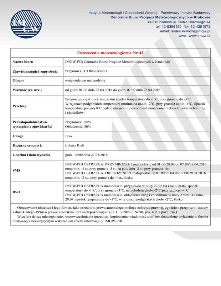 Instytut Meteorologii i Gospodarki Wodnej - Państwowy Instytut Badawczy Centralne Biuro Prognoz Meteorologicznych w Krakowie 30-215 Kraków ul. Piotra Borowego 14 tel: 12-6398150, fax: 12-4251973 email: [email protected] www: www.imgw.pl Ostrzeżenie meteorologiczne Nr 42 Nazwa biura IMGW-PIB Centralne Biuro Prognoz Meteorologicznych w Krakowie Zjawisko/stopień zagrożenia Przymrozki/1, Oblodzenie/1 Obszar województwo małopolskie Ważność (cz. urz.) od godz. 01:00 dnia 28.04.2016 do godz. 07:00 dnia 28.04.2016 Przebieg Prognozuje się w nocy miejscami spadek temperatury do -1°C, przy gruncie do -3°C. W rejonach podgórskich temperatura minimalna około -2°C, przy gruncie około -4°C. Spadek temperatury poniżej 0°C będzie miejscami powodował zamarzanie mokrych nawierzchni dróg i chodników. Prawdopodobieństwo wystąpienia zjawiska(%) Przymrozki: 80% Oblodzenie: 80% Uwagi Brak. Dyżurny synoptyk Łukasz Kiełt Godzina i data wydania godz. 15:00 dnia 27.04.2016 SMS IMGW-PIB OSTRZEGA: PRZYMROZKI/1 malopolskie od 01:00/28.04 do 07:00/28.04.2016 temp.min. -1 st.,przy gruncie -3 st. na poludniu -2 st.,przy gruncie -4st. IMGW-PIB OSTRZEGA: OBLODZENIE/1 malopolskie od 01:00/28.04 do 07:00/28.04.2016 temp.min. -2 st., przy gruncie do -4 st., slisko RSO IMGW-PIB OSTRZEGA małopolskie, przymrozki w nocy 27/28.04 i rano 28.04, spadek temperatury do -1°C, przy gruncie -3°C, na południu około -2°C przy gruncie -4°C. IMGW-PIB OSTRZEGA małopolskie, oblodzenie dróg i chodników w nocy 27/28.04 i rano 28.04, spadek temperatury do -1°C, w rejonach podgórskich około -2°C, ślisko. Opracowanie niniejsze i jego format, jako przedmiot prawa autorskiego podlega ochronie prawnej, zgodnie z przepisami ustawy z dnia 4 lutego 1994r o prawie autorskim i prawach pokrewnych (dz. U. z 2006 r. Nr 90, poz. 631 z późn. zm.). Wszelkie dalsze udostępnianie, rozpowszechnianie (przedruk, kopiowanie, wiadomość sms) jest dozwolone wyłącznie w formie dosłownej z bezwzględnym wskazaniem źródła informacji tj. IMGW-PIB.