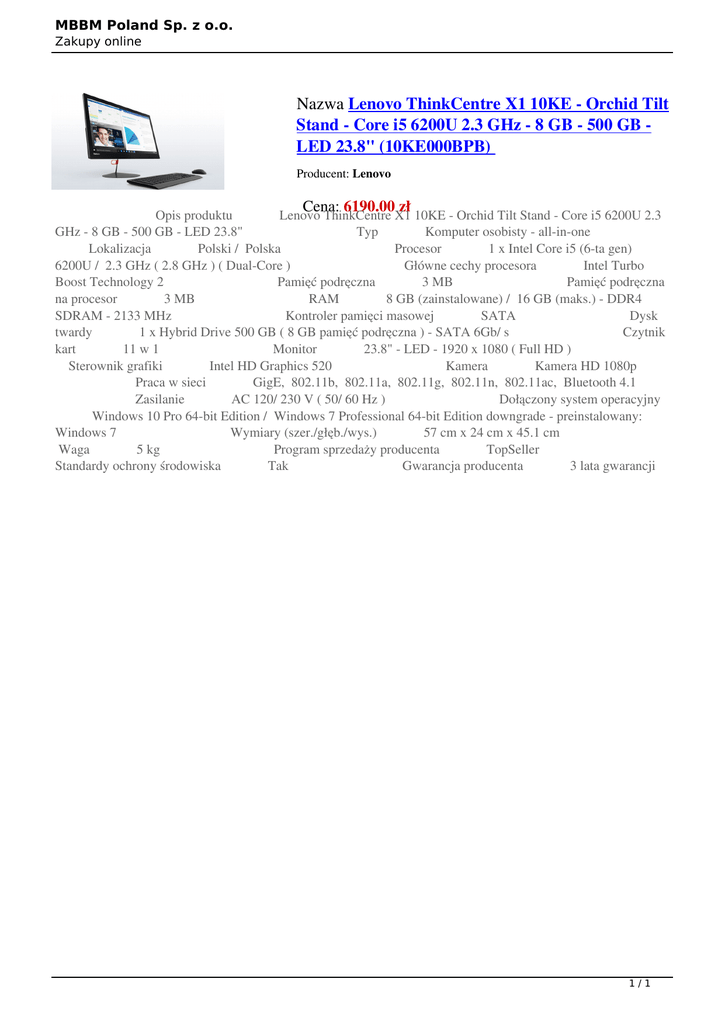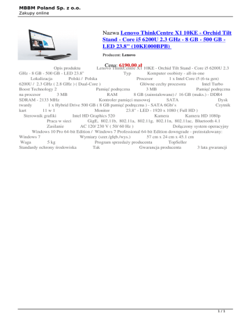 MBBM Poland Sp. z o.o. Zakupy online Nazwa Lenovo ThinkCentre X1 10KE - Orchid Tilt Stand - Core i5 6200U 2.3 GHz - 8 GB - 500 GB LED 23.8" (10KE000BPB) Producent: Lenovo Cena: 6190.00 zł Opis produktu Lenovo ThinkCentre X1 10KE - Orchid Tilt Stand - Core i5 6200U 2.3 GHz - 8 GB - 500 GB - LED 23.8" Typ Komputer osobisty - all-in-one Lokalizacja Polski / Polska Procesor 1 x Intel Core i5 (6-ta gen) 6200U / 2.3 GHz ( 2.8 GHz ) ( Dual-Core ) Główne cechy procesora Intel Turbo Boost Technology 2 Pamięć podręczna 3 MB Pamięć podręczna na procesor 3 MB RAM 8 GB (zainstalowane) / 16 GB (maks.) - DDR4 SDRAM - 2133 MHz Kontroler pamięci masowej SATA Dysk twardy 1 x Hybrid Drive 500 GB ( 8 GB pamięć podręczna ) - SATA 6Gb/ s Czytnik kart 11 w 1 Monitor 23.8" - LED - 1920 x 1080 ( Full HD ) Sterownik grafiki Intel HD Graphics 520 Kamera Kamera HD 1080p Praca w sieci GigE, 802.11b, 802.11a, 802.11g, 802.11n, 802.11ac, Bluetooth 4.1 Zasilanie AC 120/ 230 V ( 50/ 60 Hz ) Dołączony system operacyjny Windows 10 Pro 64-bit Edition / Windows 7 Professional 64-bit Edition downgrade - preinstalowany: Windows 7 Wymiary (szer./głęb./wys.) 57 cm x 24 cm x 45.1 cm Waga 5 kg Program sprzedaży producenta TopSeller Standardy ochrony środowiska Tak Gwarancja producenta 3 lata gwarancji 1/1