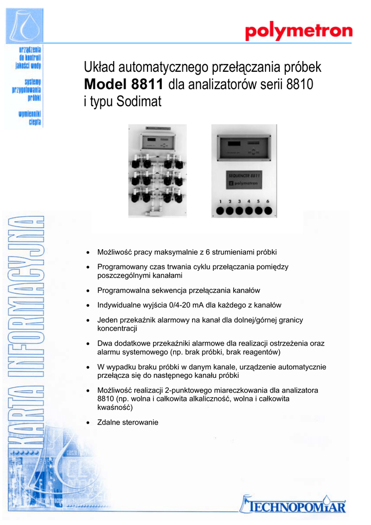 Układ automatycznego przełączania próbek Model 8811 dla analizatorów serii 8810 i typu Sodimat • Możliwość pracy maksymalnie z 6 strumieniami próbki • Programowany czas trwania cyklu przełączania pomiędzy poszczególnymi kanałami • Programowalna sekwencja przełączania kanałów • Indywidualne wyjścia 0/4-20 mA dla każdego z kanałów • Jeden przekaźnik alarmowy na kanał dla dolnej/górnej granicy koncentracji • Dwa dodatkowe przekaźniki alarmowe dla realizacji ostrzeżenia oraz alarmu systemowego (np. brak próbki, brak reagentów) • W wypadku braku próbki w danym kanale, urządzenie automatycznie przełącza się do następnego kanału próbki • Możliwość realizacji 2-punktowego miareczkowania dla analizatora 8810 (np. wolna i całkowita alkaliczność, wolna i całkowita kwaśność) • Zdalne sterowanie 8811 – dane techniczne części elektronicznej • Zasilanie • Wyświetlacz alfanumeryczny 220 VAC, –15% +10% 2 linie po 16 znaków, wysokość 5,86 mm • Komunikacja sekwenser / analizator • Temperatura otoczenia Poprzez interfejs RS232 0 - 55°C • Wyświetlacz parametrów • Pobór mocy Wyświetla w jednostkach koncentracji (programowalnych przez użytkownika – 5 cyfr) Wyświetla wartość wyjściową sygnału pierwotnego w mV Wyświetla temperaturę próbki w °C Wyświetla status analizatora (miareczkowanie, kalibracja, czyszczenie itp.) ~ 100 VA 8 x 0/4-20 mA, max. 900Ω, izolowane galwanicznie: - 6 wyjść dla wartości koncentracji - 1 wyjście dla temperatury - 1 wyjście dla sygnału pierwotnego mV • Wyświetlacz numeryczny • Alarmy 4 podświetlane cyfry; wysokość 17,8 mm 6 przekaźników alarmowych dla niskiej/wysokiej koncentracji, • Wyjścia analogowe normalnie otwarty, 250VAC/6A/1500VA. 1 przekaźnik ostrzegawczy, normalnie otwarty, 250VAC/6A/1500VA 1 przekaźnik alarmu systemowego, normalnie otwarty lub zamknięty, 250VAC/8A/2000VA • Interfejs cyfrowy 2 interfejsy szeregowe RS232: - 1 do komunikacji sekwensera z analizatorem - 2 do komunikacji zewnętrznej (przesyłanie danych do drukarki lub komputera • Obudowa Materiał wykonania: ABS Novodur Ochrona obudowy: IP65 Wymiary: 288 W x 144 H x 172 D mm 8811 – dane techniczne części hydraulicznej ANALIZATOR 8810 PRÓBKA Liczba strumieni Substancje nierozpuszczone Temperatura Ciśnienie Natężenie przepływu Powietrze zasilające zawory Czas poboru próbki Sekwencja poboru 3 (dla 2 pomiarów na kanał) 6 (dla 1 pomiaru na kanał) <1% wagowo <1% mm średnicy 0 – 60 °C 0,5 – 6 bar 40 – 300 l/h 4 – 7 bar (przefiltrowane i zawory próbki naoliwione) Programowalny: 0 – 99 minut Dowolnie programowalna kolejność pomiędzy kanałami 13 lub 1-6 (przykładowo 123131123131...) POŁĄCZENIA I WYMIARY Linia próbki Rurki PE 12 x 14 mm Powietrze zasilające zawory Forma zabudowy Wymiary Masa Rurki PE 4 x 6 mm Panelowa 484 W x 753 H x 172 D mm ~ 25 kg SODIMAT 6 Próbka wolna od zanieczyszczeń 5 – 45 °C 0,5 – 6 bar 4 l/h Nie wymagane Programowalny czas zwłoki na stabilizację pomiaru: 0 – 99 min. Programowalny czas pomiaru: 0 – 99 min. Dowolnie programowalna kolejność pomiędzy kanałami 16 (przykładowo 122354612223546...) Złączki dla rurek ze stali nierdzewnej 6 x 1 mm Nie wymagane Panelowa 350 W x 21.2 H x 172 D mm ~ 10 kg Konfiguracja systemu NR ZAMÓWIENIOWY OPIS 08811=TPM=2032S Sekwenser 8811 2-kanałowy do współpracy z analizatorem 8810 (komplet: kabel łączący, zawory próbki, zabudowa panelowa) 08811=TPM=2033S Sekwenser 8811 3-kanałowy do współpracy z analizatorem 8810 (komplet: kabel łączący, zawory próbki, zabudowa panelowa) 08811=TPM=2034S Sekwenser 8811 4-kanałowy do współpracy z analizatorem 8810 (komplet: kabel łączący, zawory próbki, zabudowa panelowa) 08811=TPM=2035S Sekwenser 8811 5-kanałowy do współpracy z analizatorem 8810 (komplet: kabel łączący, zawory próbki, zabudowa panelowa) 08811=TPM=2036S Sekwenser 8811 6-kanałowy do współpracy z analizatorem 8810 (komplet: kabel łączący, zawory próbki, zabudowa panelowa) NR ZAMÓWIENIOWY OPIS 08811=TPM=3032S Sekwenser 8811 2-kanałowy do współpracy z Sodimatem (komplet: kabel łączący, zawory próbki, zabudowa panelowa) 08811=TPM=3033S Sekwenser 8811 3-kanałowy do współpracy z Sodimatem (komplet: kabel łączący, zawory próbki, zabudowa panelowa) 08811=TPM=3034S Sekwenser 8811 4-kanałowy do współpracy z Sodimatem (komplet: kabel łączący, zawory próbki, zabudowa panelowa) 08811=TPM=3035S Sekwenser 8811 5-kanałowy do współpracy z Sodimatem (komplet: kabel łączący, zawory próbki, zabudowa panelowa) 08811=TPM=3036S Sekwenser 8811 6-kanałowy do współpracy z Sodimatem (komplet: kabel łączący, zawory próbki, zabudowa panelowa) Sekwenser 8811 do współpracy z Sodimatem 8810 1. 2. 3. 4. 5. 6. 7. Sekwenser 8811 do współpracy z analizatorem Główne elementy Sekwensera 8811 do współpracy z Sodimatem Sterownik Zawór igłowy Kabel połączeniowy z Sodimatem Zwór 3/2–drogowy Wlot próbki Wylot próbki do analizatora typu Sodimat Wylot próbki do ścieku Główne elementy Sekwensera 8811 do współpracy z analizatorem 8810 1. Sterownik 2. Zawór próbki (NO) 3. Zawór próbki (NF) 4. Wlot próbki 5. Wylot próbki do ścieku 6. Wylot próbki do analizatora 8810 7. Zawór powietrza 8. Wlot powietrza zasilającego zawory 9. Wylot powietrza zasilającego zawory 10. Kabel połączeniowy z analizatorem 8810 ul. Buforowa 4c, 52-131 Wrocław tel. +4871 332 98 00, fax +4871 332 98 30 www.technopomiar.pl, [email protected]