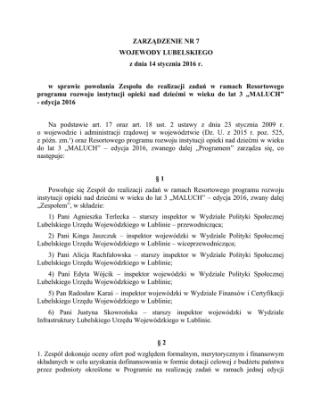ZARZĄDZENIE NR 7 WOJEWODY LUBELSKIEGO z dnia 14 stycznia 2016 r. w sprawie powołania Zespołu do realizacji zadań w ramach Resortowego programu rozwoju instytucji opieki nad dziećmi w wieku do lat 3 „MALUCH” - edycja 2016 Na podstawie art. 17 oraz art. 18 ust. 2 ustawy z dnia 23 stycznia 2009 r. o wojewodzie i administracji rządowej w województwie (Dz. U. z 2015 r. poz. 525, z późn. zm.¹) oraz Resortowego programu rozwoju instytucji opieki nad dziećmi w wieku do lat 3 „MALUCH” – edycja 2016, zwanego dalej „Programem” zarządza się, co następuje: §1 Powołuje się Zespół do realizacji zadań w ramach Resortowego programu rozwoju instytucji opieki nad dziećmi w wieku do lat 3 „MALUCH” – edycja 2016, zwany dalej „Zespołem”, w składzie: 1) Pani Agnieszka Terlecka – starszy inspektor w Wydziale Polityki Społecznej Lubelskiego Urzędu Wojewódzkiego w Lublinie – przewodnicząca; 2) Pani Kinga Jaszczuk – inspektor wojewódzki w Wydziale Polityki Społecznej Lubelskiego Urzędu Wojewódzkiego w Lublinie – wiceprzewodnicząca; 3) Pani Alicja Rachfałowska – starszy inspektor w Wydziale Polityki Społecznej Lubelskiego Urzędu Wojewódzkiego w Lublinie; 4) Pani Edyta Wójcik – inspektor wojewódzki w Wydziale Polityki Społecznej Lubelskiego Urzędu Wojewódzkiego w Lublinie; 5) Pan Radosław Karaś – inspektor wojewódzki w Wydziale Finansów i Certyfikacji Lubelskiego Urzędu Wojewódzkiego w Lublinie; 6) Pani Justyna Skowrońska – starszy inspektor wojewódzki w Wydziale Infrastruktury Lubelskiego Urzędu Wojewódzkiego w Lublinie. §2 1. Zespół dokonuje oceny ofert pod względem formalnym, merytorycznym i finansowym składanych w celu uzyskania dofinansowania w formie dotacji celowej z budżetu państwa przez podmioty określone w Programie na realizację zadań w ramach jednej edycji złożonej z 3 modułów, dotyczących działań na rzecz rozwoju i utrzymania infrastruktury opieki nad dziećmi w wieku do lat 3, tj. żłobków, klubów dziecięcych i miejsc opieki u dziennych opiekunów. 2. Zespół dokona rozpatrzenia pod względem merytorycznym jedynie oferty spełniające wymagane kryteria formalne, o których mowa w pkt 5 Programu. 3. W przypadku stwierdzenia błędów w ofercie Zespół informuje oferenta o błędzie i wzywa go do poprawienia oferty. 4. Zespół określa jednakową dla wszystkich oferentów liczbę możliwych korekt błędów w złożonej ofercie oraz określa termin ich dokonania. 5. Ustala się jednolity dla wszystkich oferentów tryb dokonywania poprawek, uzupełnień i wyjaśnień, jak również rodzaj i zakres uchybień podlegających poprawkom, uzupełnieniom i wyjaśnieniom dla ofert składanych w ramach otwartego konkursu ofert „MALUCH - edycja 2016” w województwie lubelskim, stanowiący załącznik Nr 1 do niniejszego zarządzenia. 6. Minimalna liczba członków Zespołu konieczna do prowadzenia obrad nie może być mniejsza niż 4 członków Zespołu, w tym przewodniczącej lub wiceprzewodniczącej albo osoby uprawnionej, o której mowa w § 4 ust. 3. §3 1. Do zadań Zespołu należy w szczególności: 1) dokonanie kwalifikacji ofert; 2) sporządzenie propozycji ofert zakwalifikowanych do finansowego wsparcia; 3) dokonanie analizy sprawozdań z realizacji Programu. 2. Po wykonaniu czynności określonych w ust. 1 Zespół ulega rozwiązaniu. §4 1. Pracą Zespołu kieruje przewodnicząca, która jest odpowiedzialna za prawidłową organizację pracy Zespołu. 2. Do zadań przewodniczącej Zespołu należy w szczególności: 1) zwoływanie posiedzeń Zespołu, przewodniczenie obradom i zapewnienie prawidłowego przebiegu prac Zespołu; 2) sporządzenie protokołu z przebiegu prac Zespołu, który jest podpisywany przez wszystkich członków Zespołu, biorących udział w posiedzeniu. 3. Wykonywanie czynności, o których mowa w ust. 2 przewodnicząca Zespołu może przekazać do realizacji wyznaczonemu członkowi Zespołu. 4. W przypadku usprawiedliwionej nieobecności przewodniczącej Zespołu lub w sytuacji, gdy nie może ona osobiście wykonywać zadań określonych w ust. 2, zadania te wykonuje wiceprzewodnicząca lub pisemnie upoważniony przez przewodniczącą członek Zespołu. §5 Wykonanie zarządzenia powierza się przewodniczącej Zespołu. §6 Zarządzenie wchodzi w życie z dniem podpisania. ¹ Zmiana niniejszej ustawy została ogłoszona w Dz. U. z 2015 r. poz. 1960. Potwierdzam zgodność kopii z dokumentem elektronicznym: Identyfikator dokumentu Nazwa dokumentu Tytuł dokumentu Sygnatura dokumentu Data dokumentu Skrót dokumentu Wersja dokumentu Data podpisu Podpisane przez 986122.2036275.1520301 Zarządzenie Maluch 2016.pdf Zarządzenie Maluch 2016.doc PS-III.946.103.2015 2016-01-14 09:41:09 ED34794B20F9E7F3E4CE06A0A4ED1876DFC7660D 1.9 2016-01-14 09:41:01 Przemysław Czarnek wojewoda lubelski EZD 3.17.1457.1936.6022 Data wydruku: Autor wydruku: 2016-04-21 08:45:21 Staroch Marta inspektor wojewódzki